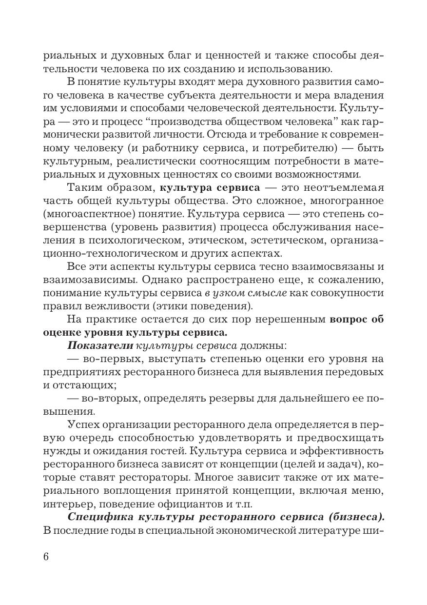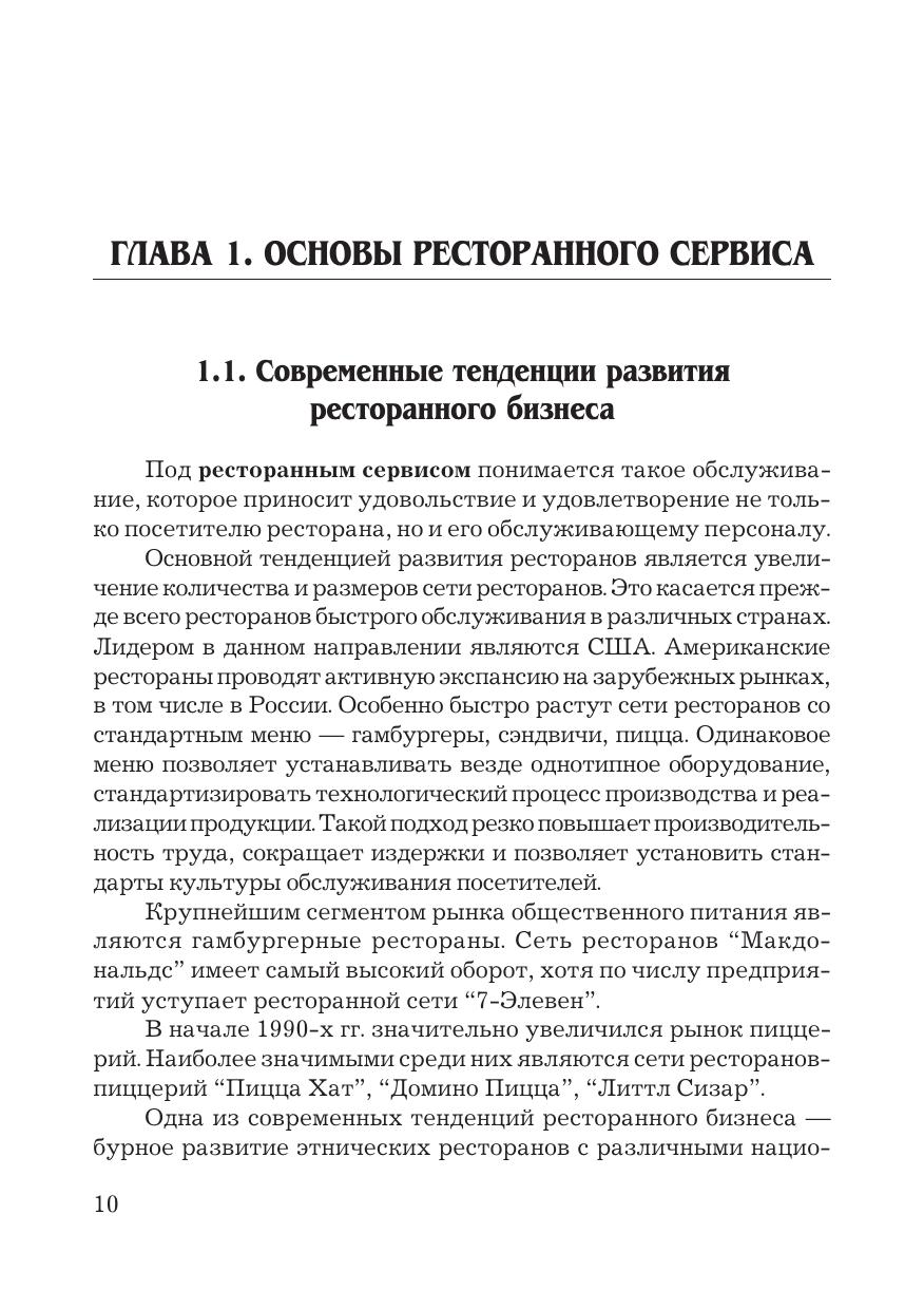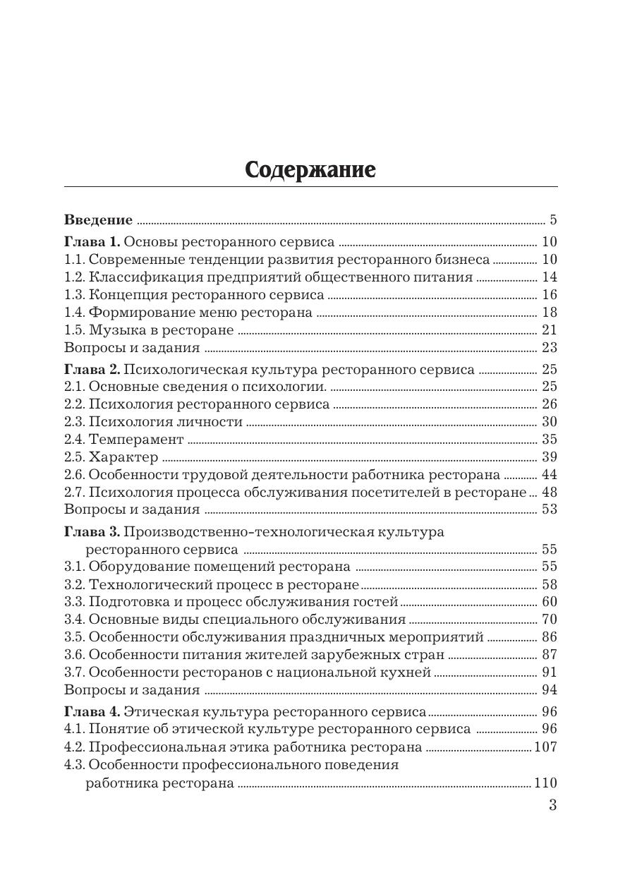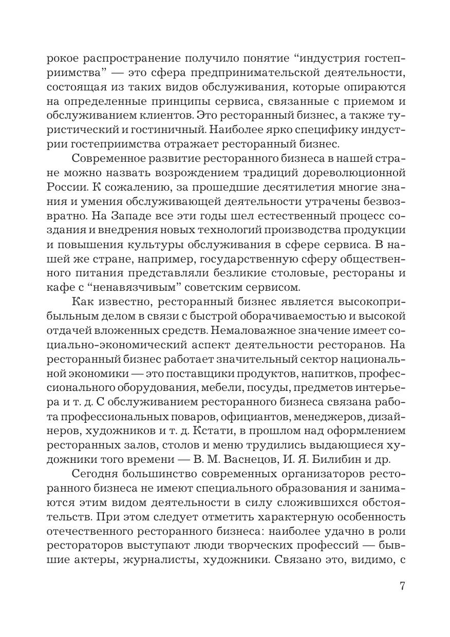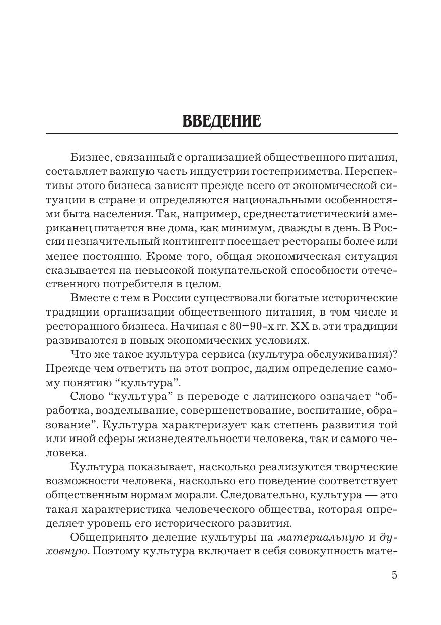 Для облегчения изучения культуры ресторанного сервиса сведения в пособии представлены в структурированном виде в соответствии с психологическим, этическим, эстетическим, производственно-технологическим и организационным аспектами (компонентами). Рассмотрены основные тенденции развития ресторанного бизнеса. Освещены организация производственно-технологического процесса в ресторане. Приведены особенности национальных кухонь. Рассмотрена корпоративная культура ресторанов, эстетика зданий ресторанов, залов обслуживания гостей. Даны рекомендации по проведению различных видов обслуживания, указаны требования к профессиональному поведению работников ресторана и их деловому этикету, эстетические требования к одежде и внешнему облику работников ресторана, а также даны рекомендации по проведению рекламных мероприятий в ресторане. Освещена проблема безопасности ресторатора и ресторанного бизнеса в целом. Для студентов бакалавриата, обучающихся по сервисным направлениям подготовки "Технология продукции и организация общественного питания, "Гостиничное дело", "Туризм". Учебное пособие будет также полезно руководителям ресторанов, обслуживающему персоналу ресторанов и всем тем, кто интересуется культурой ресторанного сервиса.