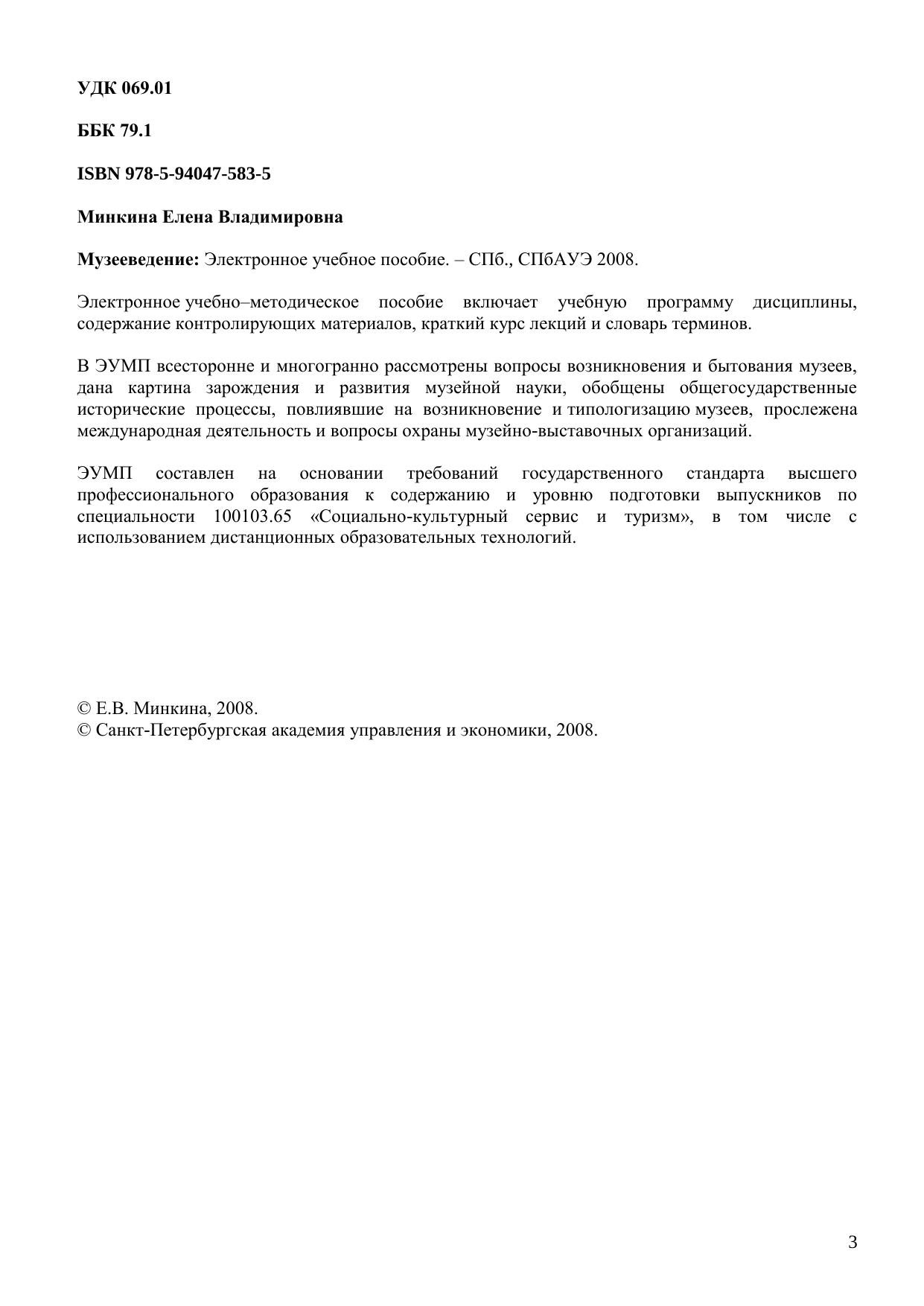 Электронное учебно-методическое пособие включает учебную программу дисциплины, содержание контролирующих материалов, краткий курс лекций и словарь терминов. В ЭУМП всесторонне и многогранно рассмотрены вопросы возникновения и бытования музеев, дана картина зарождения и развития музейной науки, обобщены общегосударственные исторические процессы, повлиявшие на возникновение и типологизацию музеев, прослежена международная деятельность и вопросы охраны музейно-выставочных организаций. ЭУМП составлен на основании требований государственного стандарта высшего профессионального образования к содержанию и уровню подготовки выпускников по специальности 100103.65 «Социально-культурный сервис и туризм», в том числе с использованием дистанционных образовательных технологий. Электронное учебное пособие для дистанционного обучения