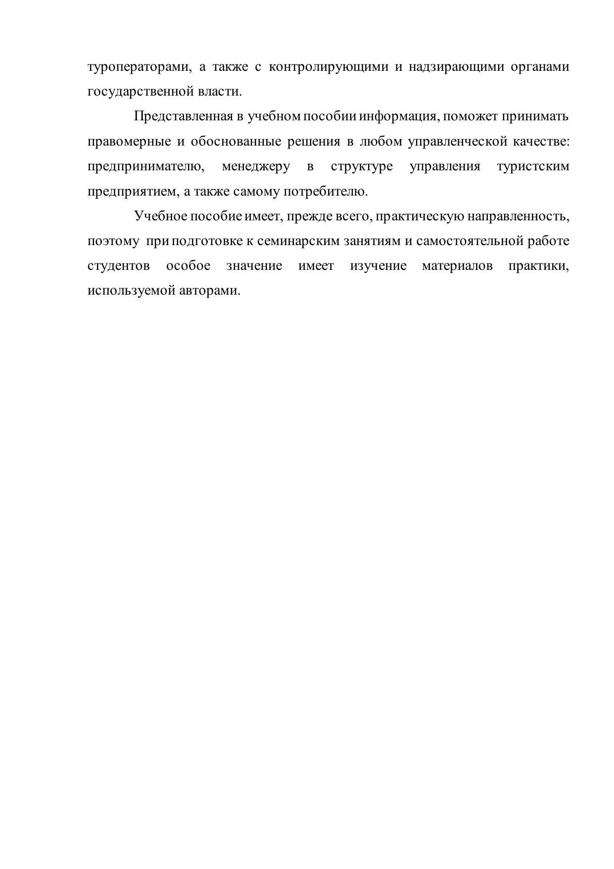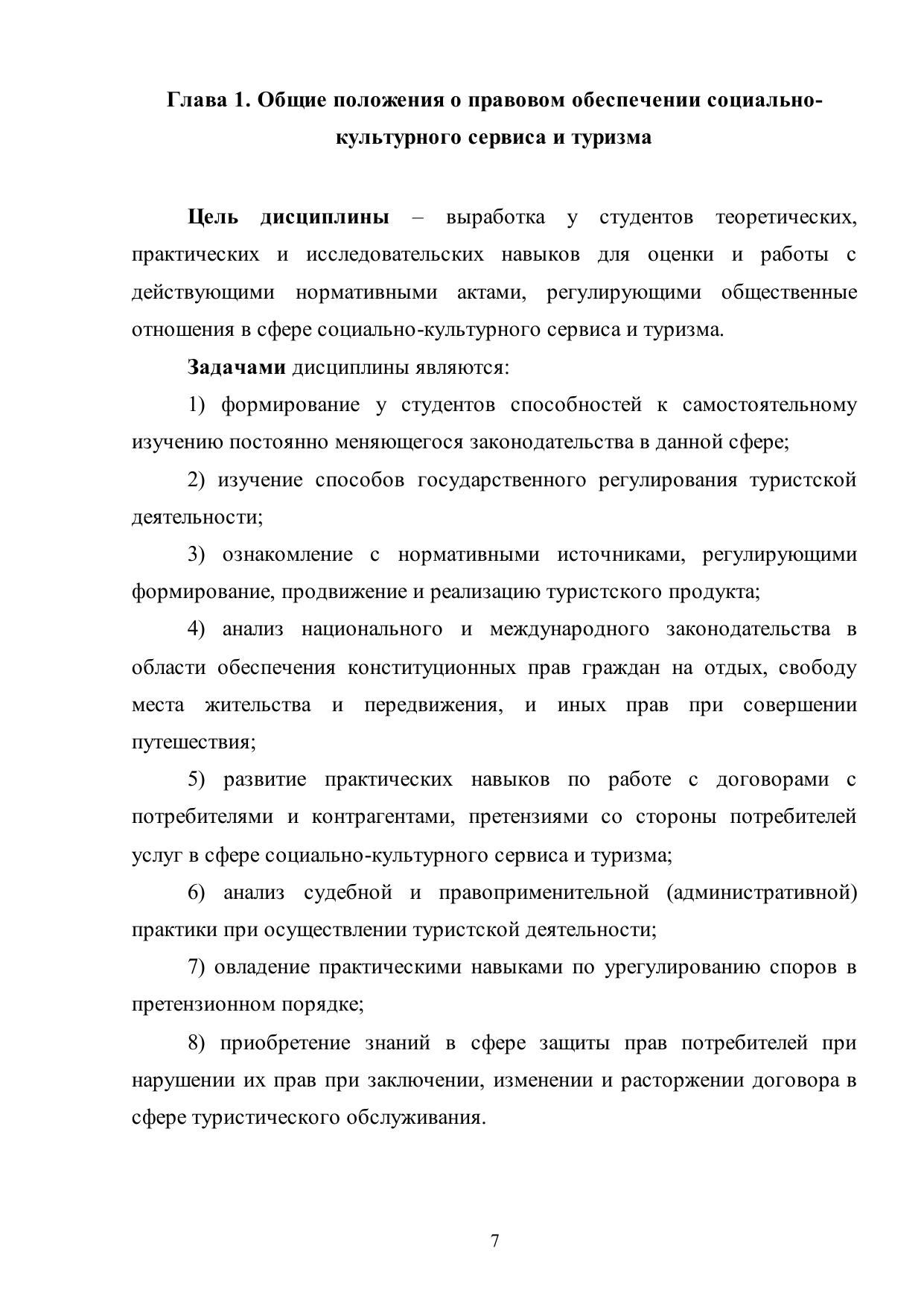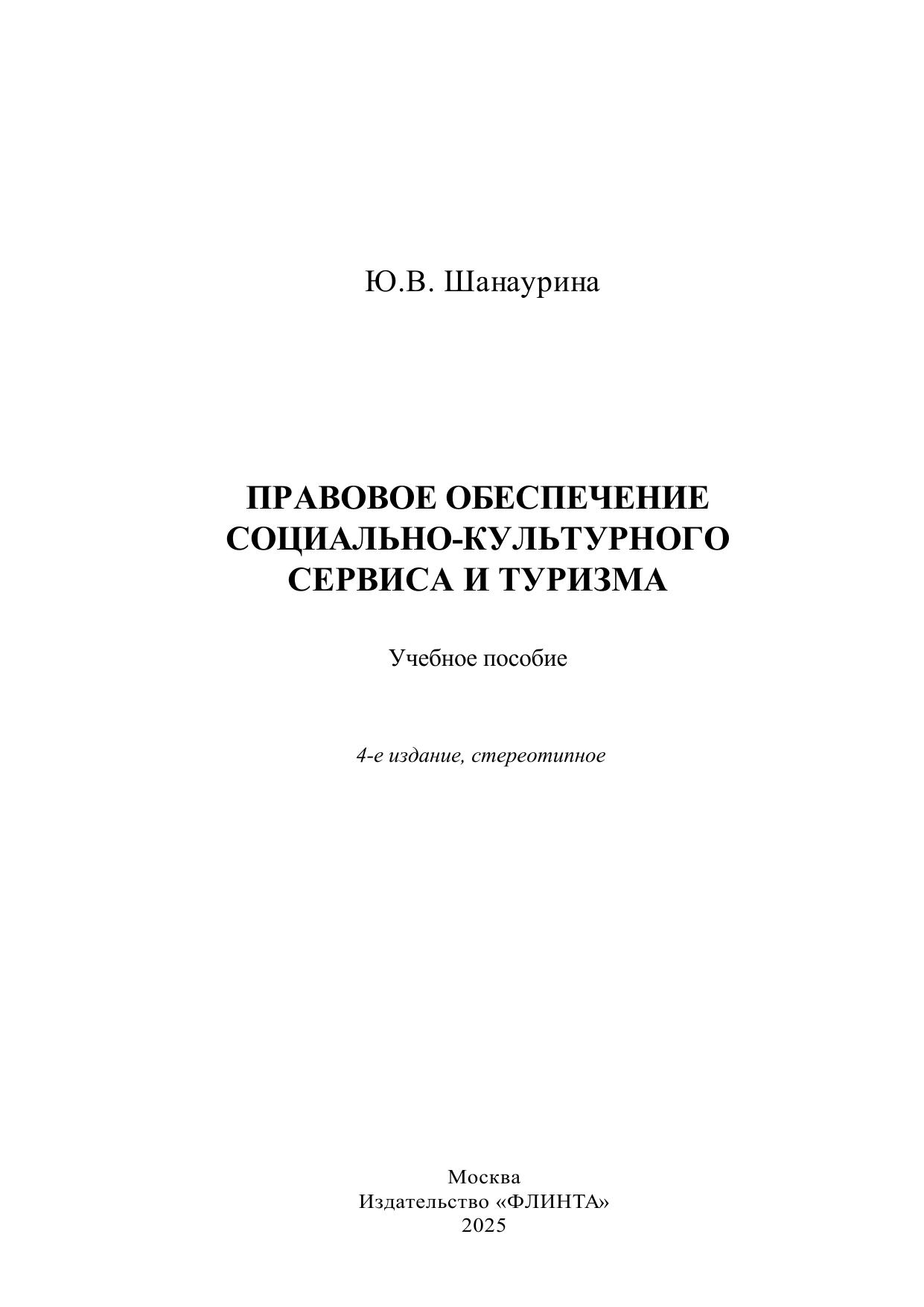 Учебное пособие по дисциплине «Правовое обеспечение социально-культурного сервиса и туризма»подготовлено в соответствии с учебным планом и Государственным образовательным стандартом высшего профессионального образования по специальности «Социально-культурный сервис и туризм». Данное учебное пособие разработано для курса «Правовое обеспечение социально-культурного сервиса и туризма», который входит в состав профессиональной подготовки специалистов социальнокультурного сервиса и туризма и предназначено для студентов всех форм обучения, включает лекционный материал, рабочую программу дисциплины, методические указания по изучению дисциплины, задания для контроля, список основной и дополнительной литературы. Учебное пособие может быть использовано в качестве учебнометодического обеспечения дополнительной квалификации «Менеджер курортного, гостиничного дела и туризма», системы подготовки специалистов в области туристического бизнеса для реализации «Программы стратегического развития туризма на территории Тюменской области», а также для повышения квалификации практических работников туристических фирм и организаций.