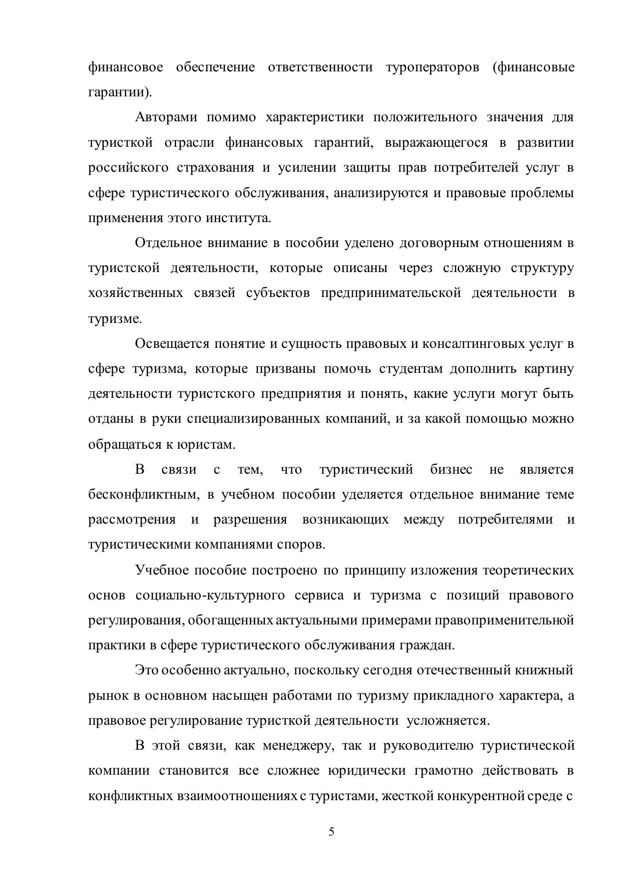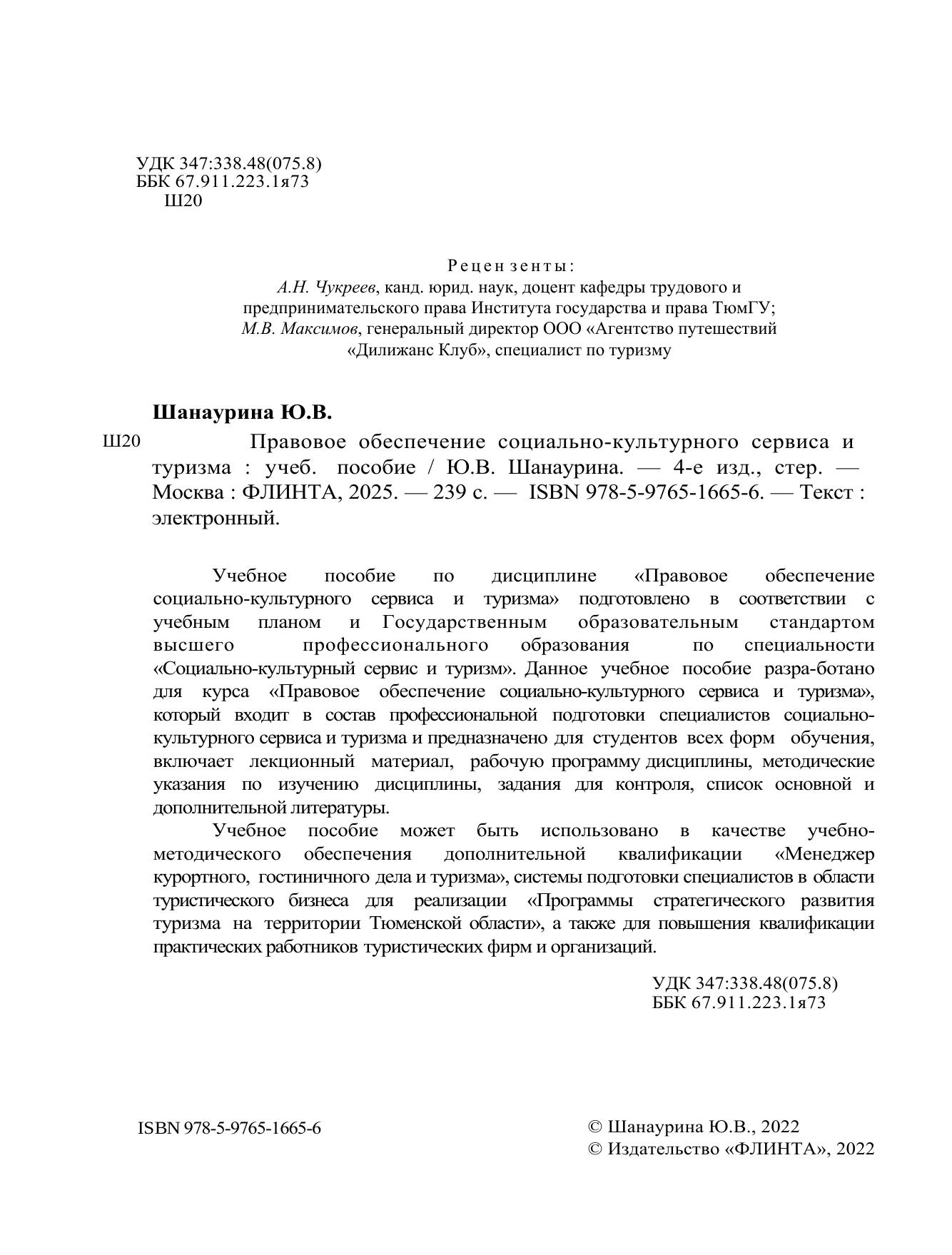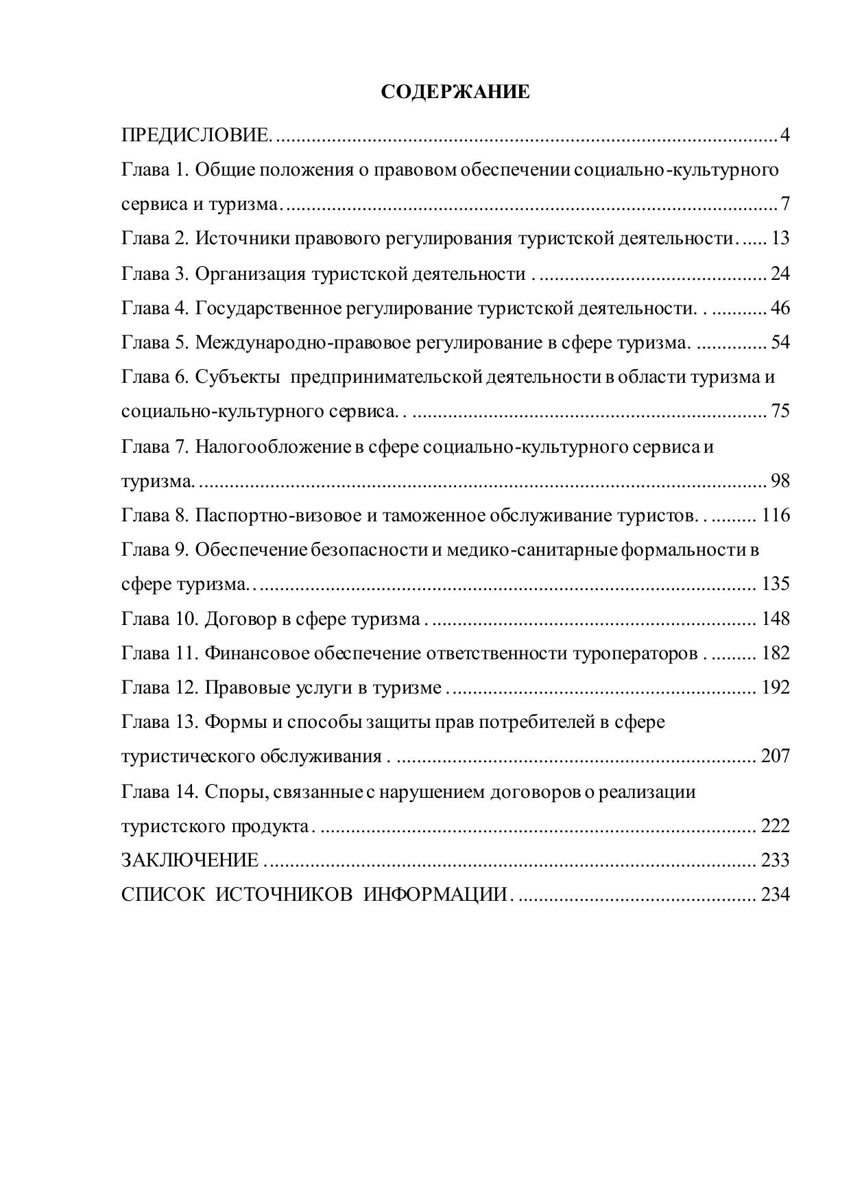 Учебное пособие по дисциплине «Правовое обеспечение социально-культурного сервиса и туризма»подготовлено в соответствии с учебным планом и Государственным образовательным стандартом высшего профессионального образования по специальности «Социально-культурный сервис и туризм». Данное учебное пособие разработано для курса «Правовое обеспечение социально-культурного сервиса и туризма», который входит в состав профессиональной подготовки специалистов социальнокультурного сервиса и туризма и предназначено для студентов всех форм обучения, включает лекционный материал, рабочую программу дисциплины, методические указания по изучению дисциплины, задания для контроля, список основной и дополнительной литературы. Учебное пособие может быть использовано в качестве учебнометодического обеспечения дополнительной квалификации «Менеджер курортного, гостиничного дела и туризма», системы подготовки специалистов в области туристического бизнеса для реализации «Программы стратегического развития туризма на территории Тюменской области», а также для повышения квалификации практических работников туристических фирм и организаций.