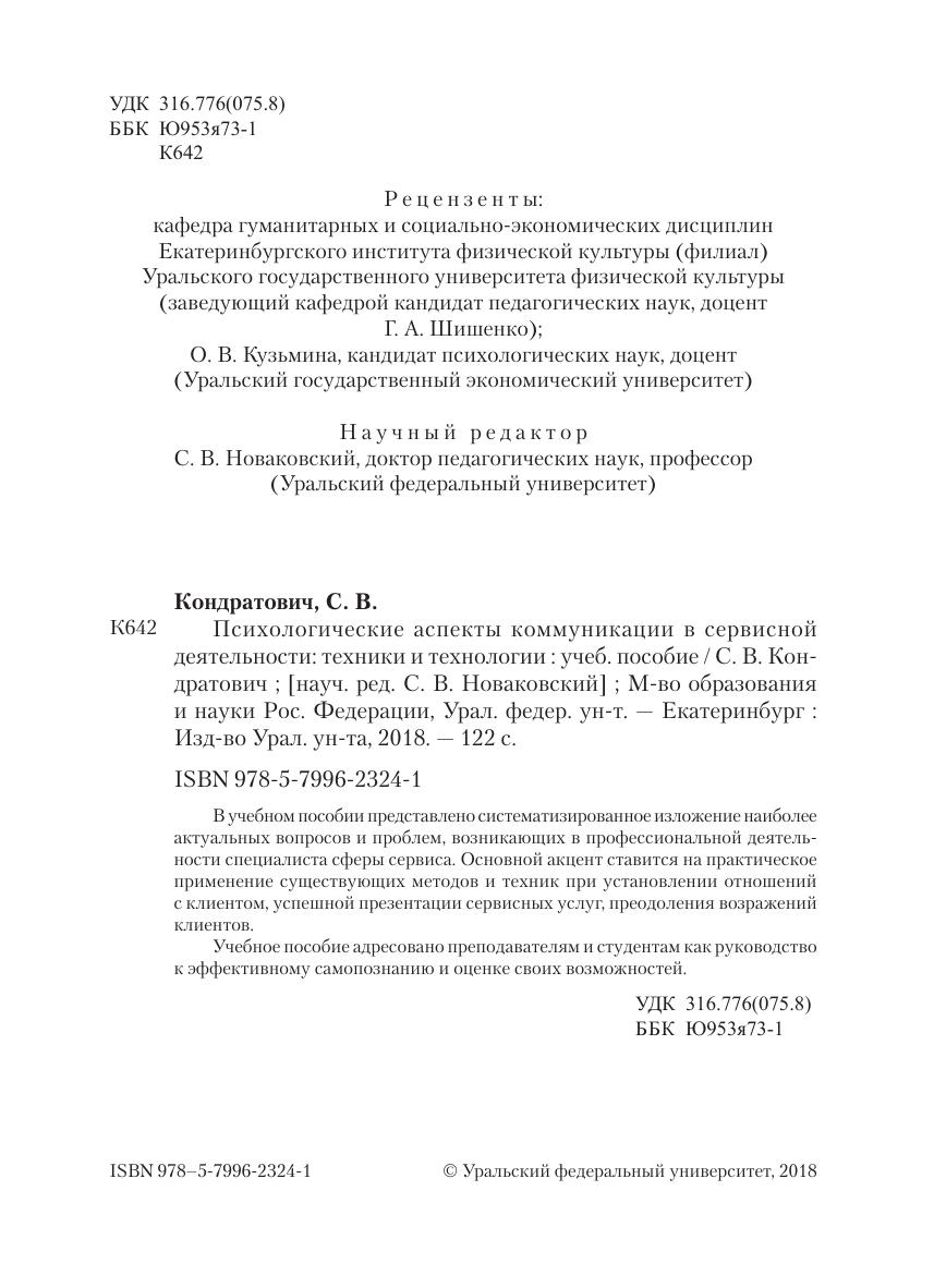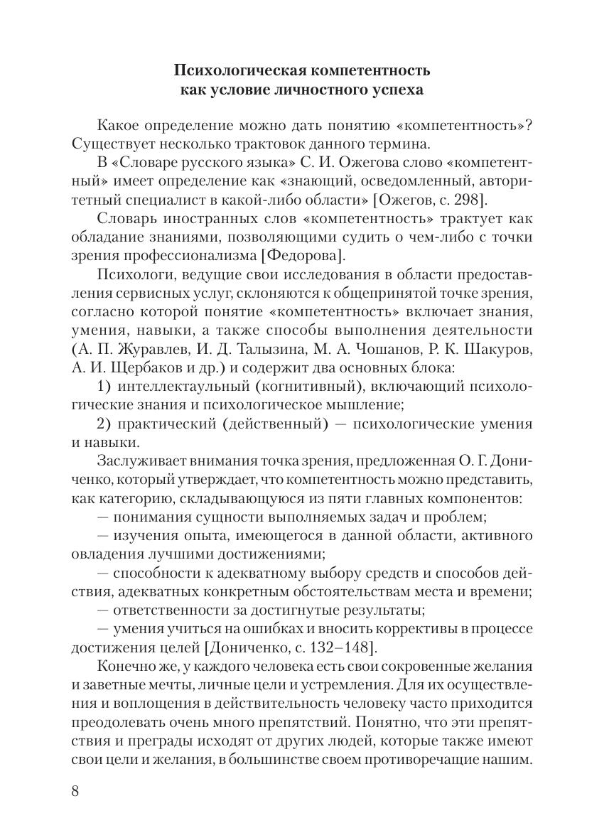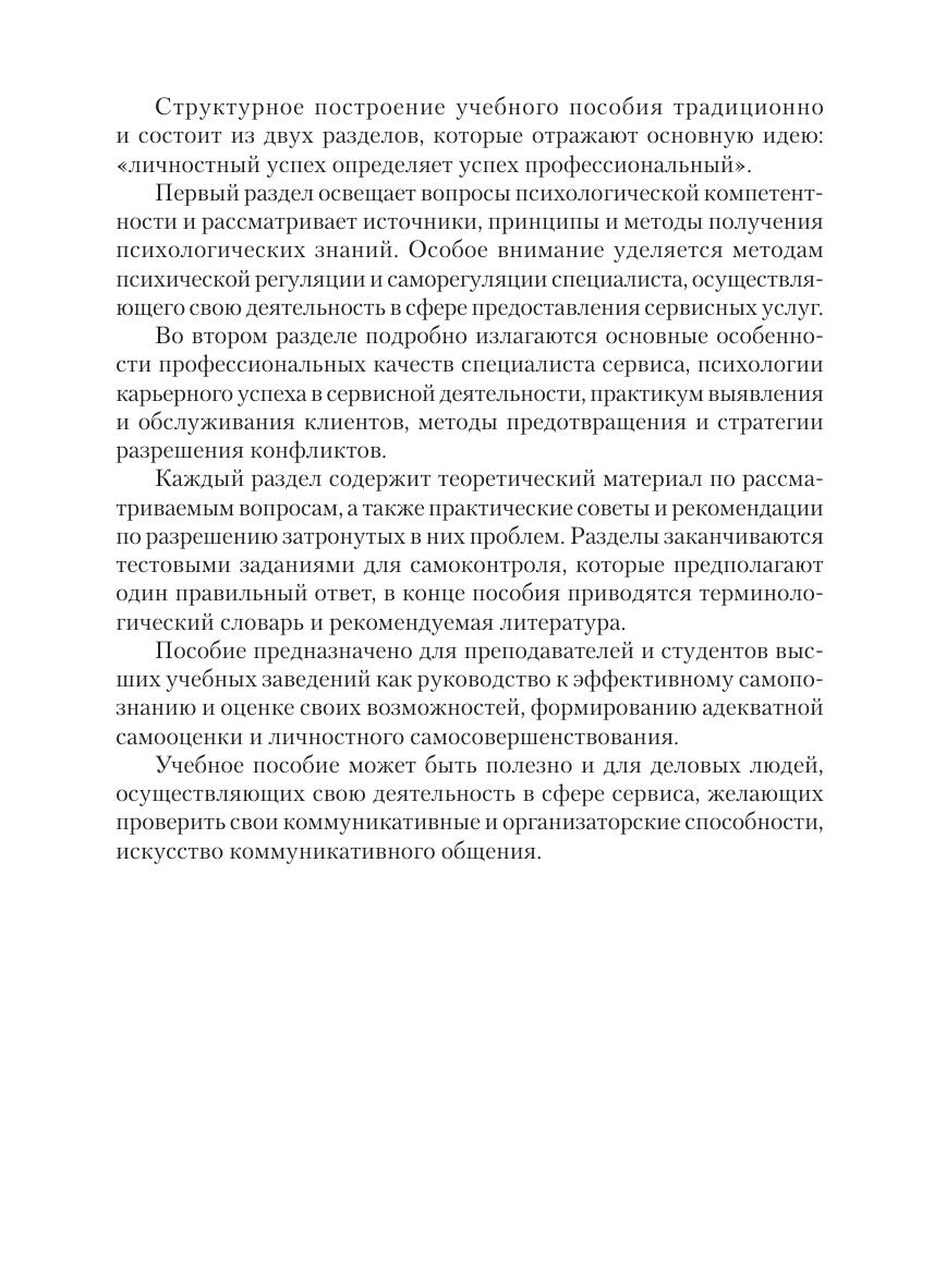В учебном пособии представлено систематизированное изложение наиболее актуальных вопросов и проблем, возникающих в профессиональной деятельности специалиста сферы сервиса. Основной акцент ставится на практическое применение существующих методов и техник при установлении отношений с клиентом, успешной презентации сервисных услуг, преодоления возражений клиентов. Учебное пособие адресовано преподавателям и студентам как руководство к эффективному самопознанию и оценке своих возможностей.