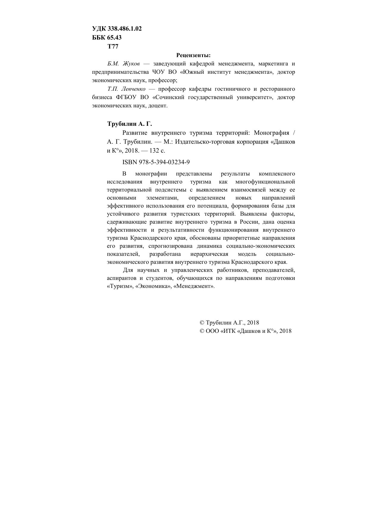 В монографии представлены результаты комплексного исследования внутреннего туризма как многофункциональной территориальной подсистемы с выявлением взаимосвязей между ее основными элементами, определением новых направлений эффективного использования его потенциала, формирования базы для устойчивого развития туристских территорий. Выявлены факторы, сдерживающие развитие внутреннего туризма в России, дана оценка эффективности и результативности функционирования внутреннего туризма Краснодарского края, обоснованы приоритетные направления его развития, спрогнозирована динамика социально-экономических показателей, разработана иерархическая модель социально-экономического развития внутреннего туризма Краснодарского края. Для научных и управленческих работников, преподавателей, аспирантов и студентов, обучающихся по направлениям подготовки «Туризм», «Экономика», «Менеджмент».