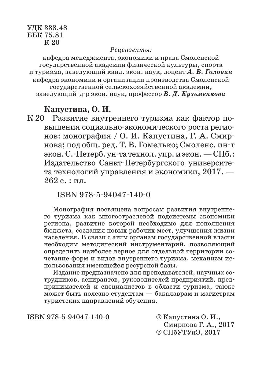 Издание предназначено для преподавателей, научных сотрудников, аспирантов, руководителей предприятий, предпринимателей и специалистов в области туризма, также может быть полезно студентам — бакалаврам и магистрам туристских направлений обучения