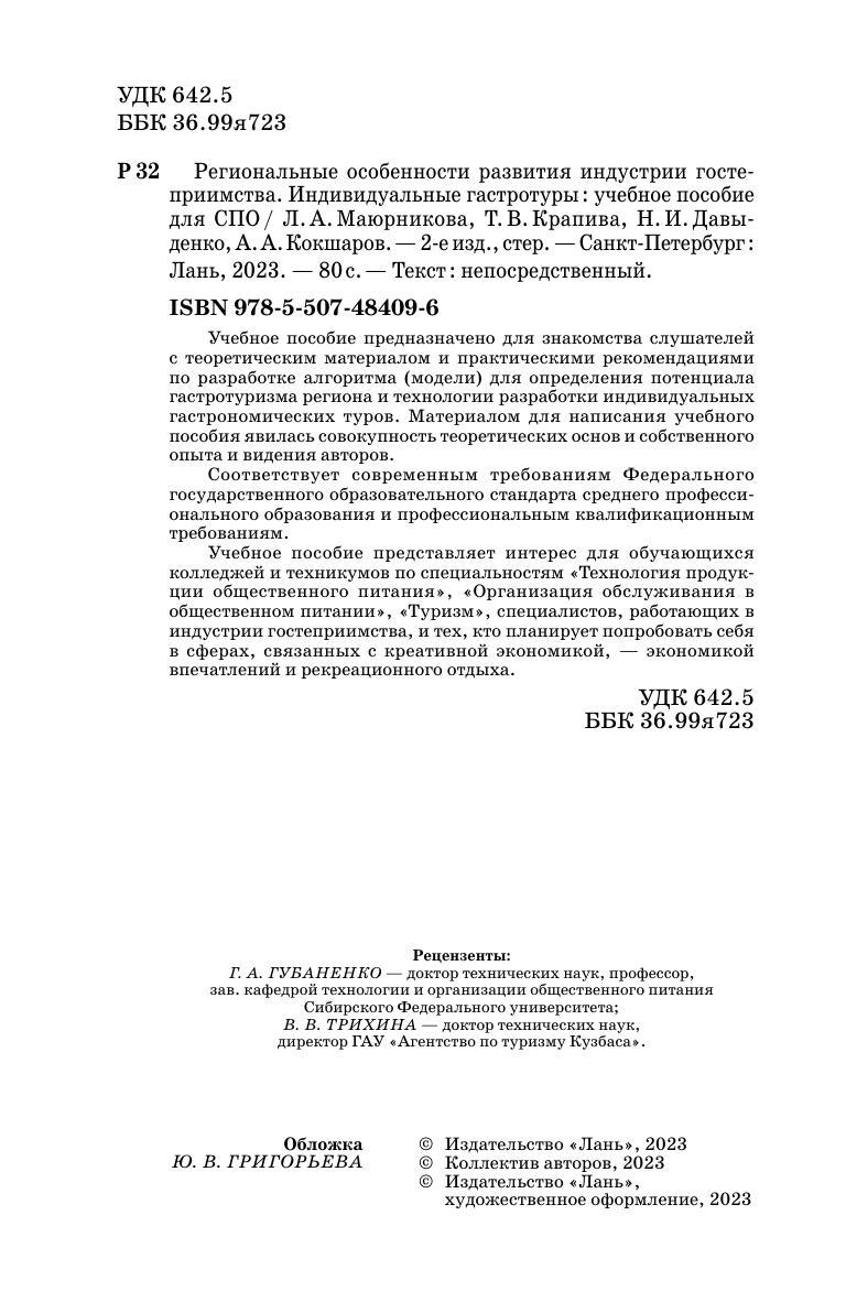Учебное пособие предназначено для знакомства слушателей с теоретическим материалом и практическими рекомендациями по разработке алгоритма (модели) для определения потенциала гастротуризма региона и технологии разработки индивидуальных гастрономических туров. Материалом для написания учебного пособия явилась совокупность теоретических основ и собственного опыта и видения авторов. Соответствует современным требованиям Федерального государственного образовательного стандарта среднего профессионального образования и профессиональным квалификационным требованиям. Учебное пособие представляет интерес для обучающихся колледжей и техникумов по специальностям «Технология продукции общественного питания», «Организация обслуживания в общественном питании», «Туризм», специалистов, работающих в индустрии гостеприимства, и тех, кто планирует попробовать себя в сферах, связанных с креативной экономикой, — экономикой впечатлений и рекреационного отдыха.