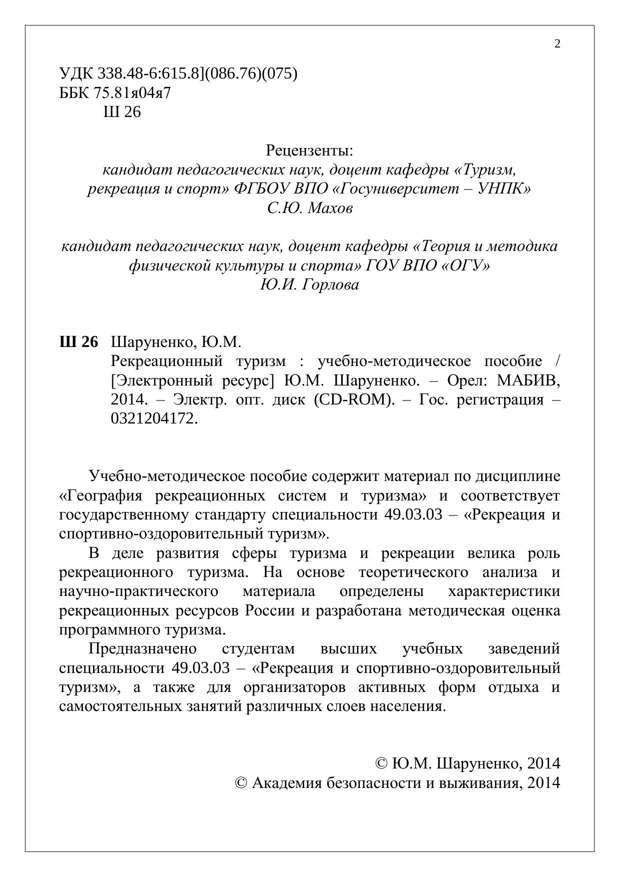 Учебно-методическое пособие содержит материал по дисциплине «География рекреационных систем и туризма» и соответствует государственному стандарту специальности 49.03.03 – «Рекреация и спортивно-оздоровительный туризм». В деле развития сферы туризма и рекреации велика роль рекреационного туризма. На основе теоретического анализа и научно-практического материала определены характеристики рекреационных ресурсов России и разработана методическая оценка программного туризма.