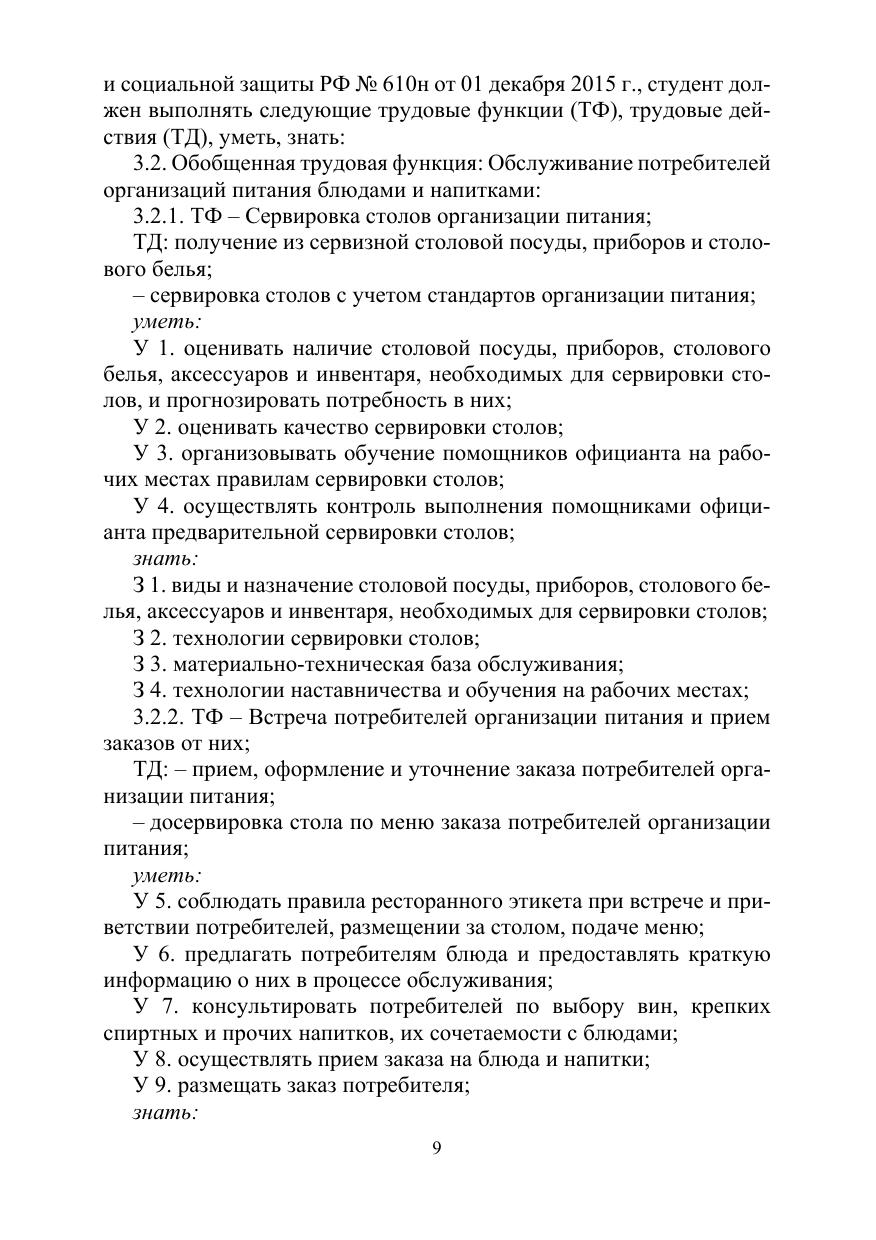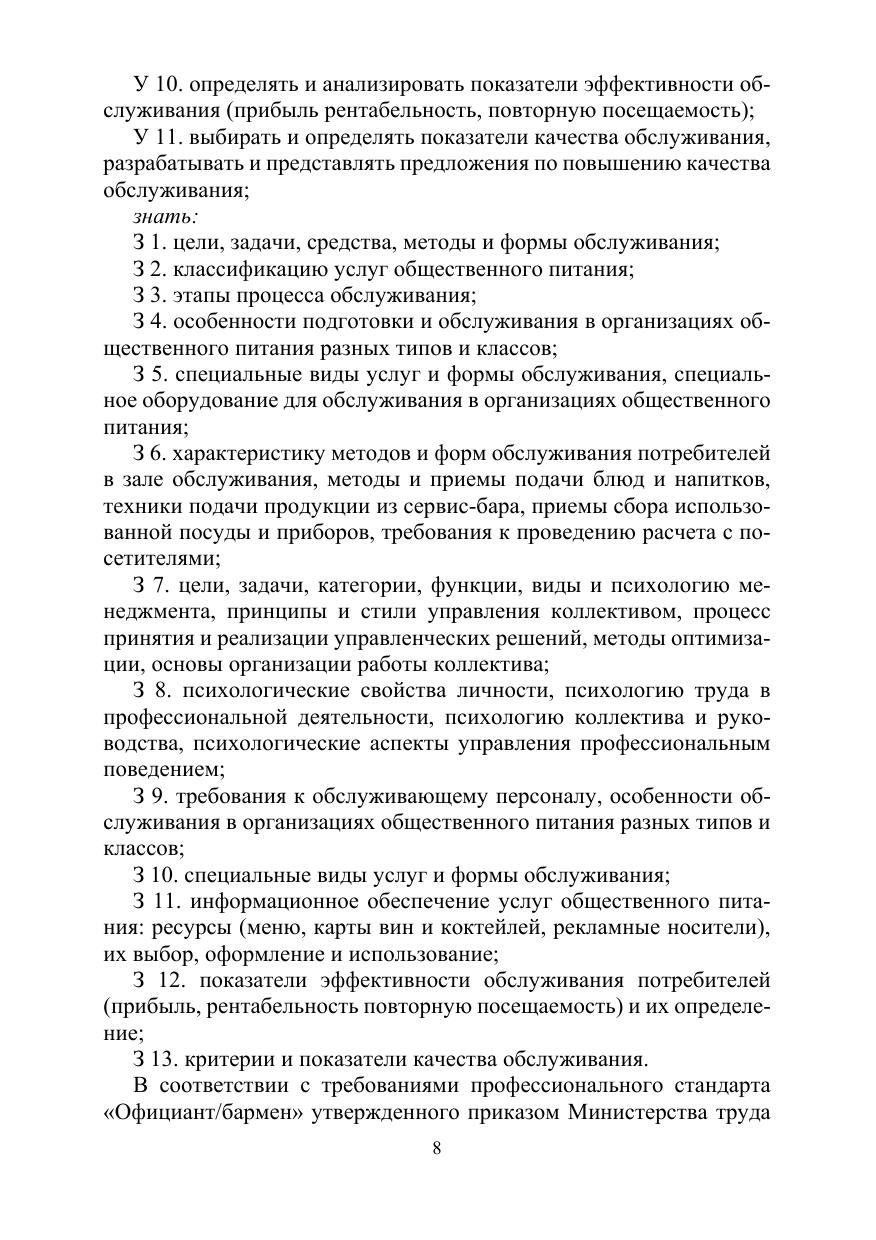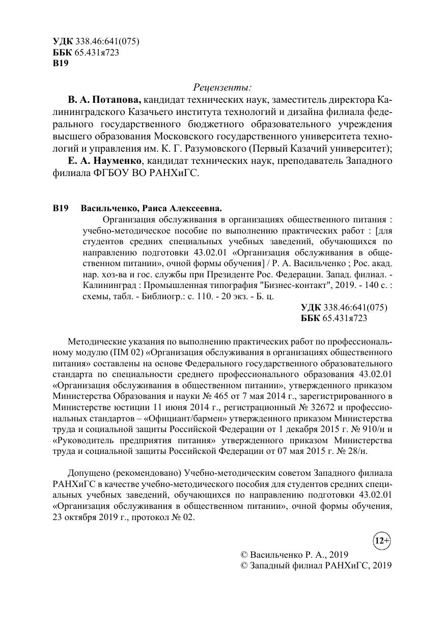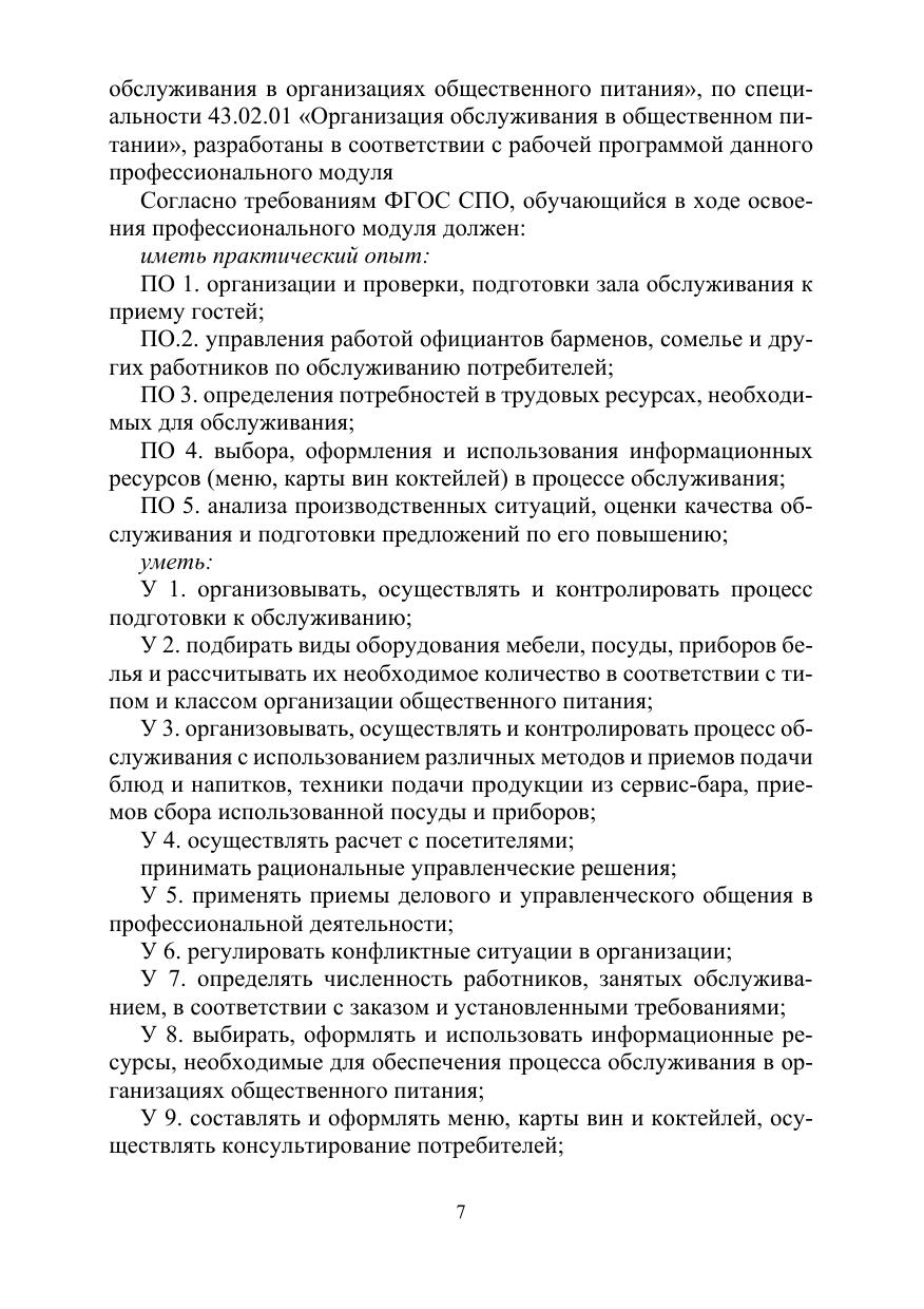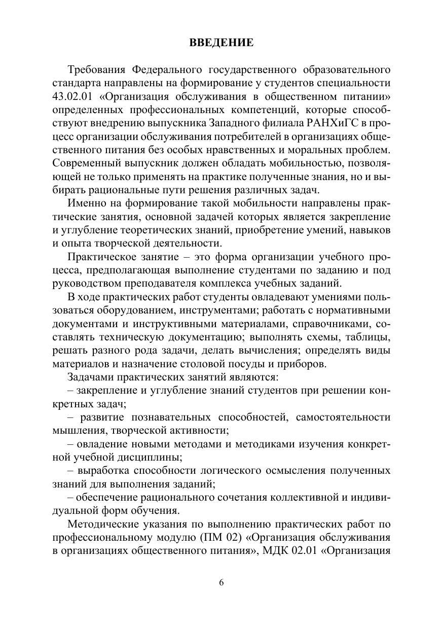 Методические указания по выполнению практических работ по профессиональному модулю (ПМ 02) «Организация обслуживания в организациях общественного питания» составлены на основе Федерального государственного образовательного стандарта по специальности среднего профессионального образования 43.02.01 «Организация обслуживания в общественном питании», утвержденного приказом Министерства Образования и науки № 465 от 7 мая 2014 г., зарегистрированного в Министерстве юстиции 11 июня 2014 г., регистрационный № 32672 и профессиональных стандартов – «Официант/бармен» утвержденного приказом Министерства труда и социальной защиты Российской Федерации от 1 декабря 2015 г. № 910/н и «Руководитель предприятия питания» утвержденного приказом Министерства труда и социальной защиты Российской Федерации от 07 мая 2015 г. № 28/н.