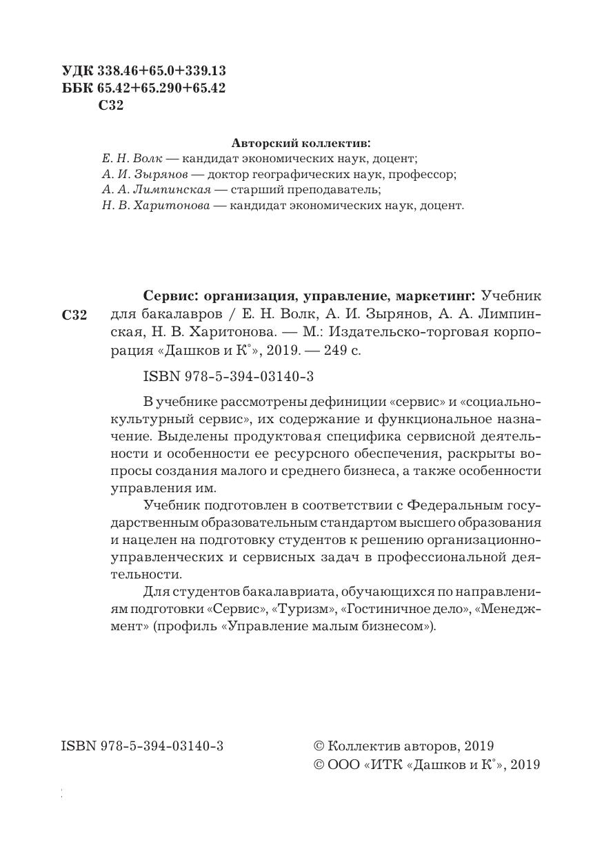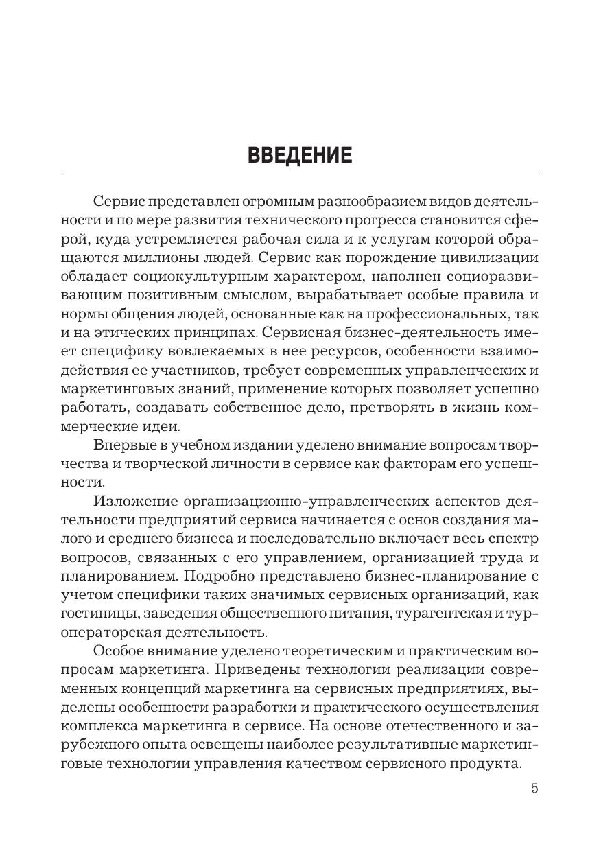 В учебнике рассмотрены дефиниции «сервис» и «социально-культурный сервис», их содержание и функциональное назначение. Выделены продуктовая специфика сервисной деятельности и особенности ее ресурсного обеспечения, раскрыты вопросы создания малого и среднего бизнеса, а также особенности управления им. Учебник подготовлен в соответствии с Федеральным государственным образовательным стандартом высшего образования и нацелен на подготовку студентов к решению организационно-управленческих и сервисных задач в профессиональной деятельности. Для студентов бакалавриата, обучающихся по направлениям подготовки «Сервис», «Туризм», «Гостиничное дело», «Менеджмент» (профиль «Управление малым бизнесом»).