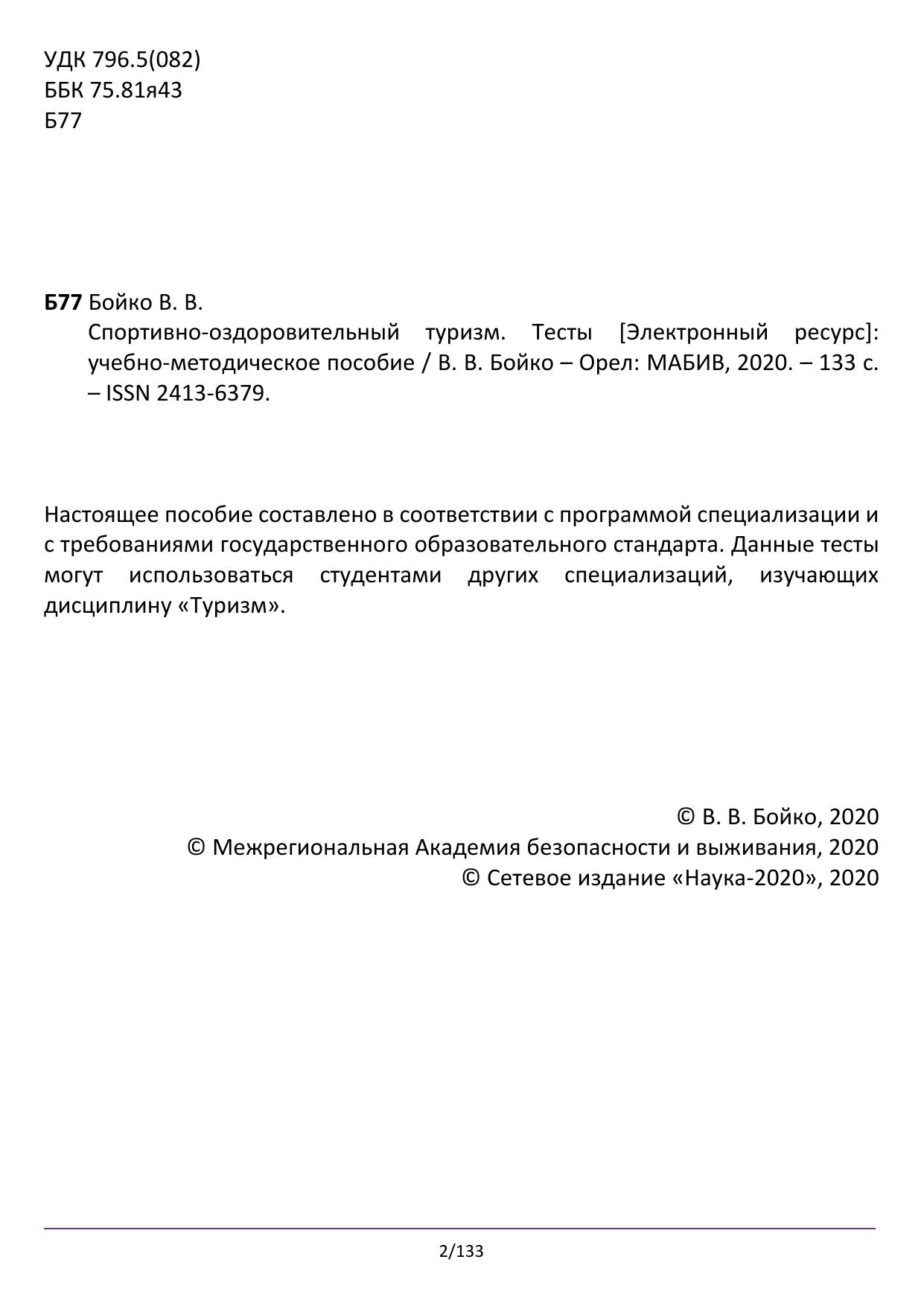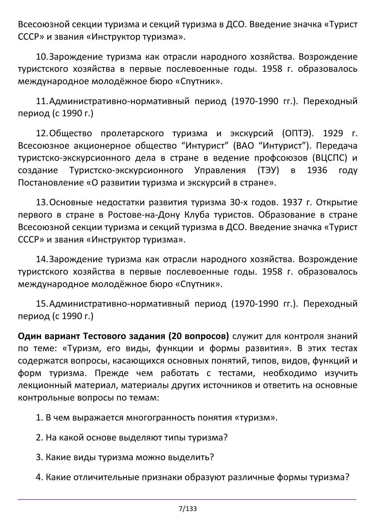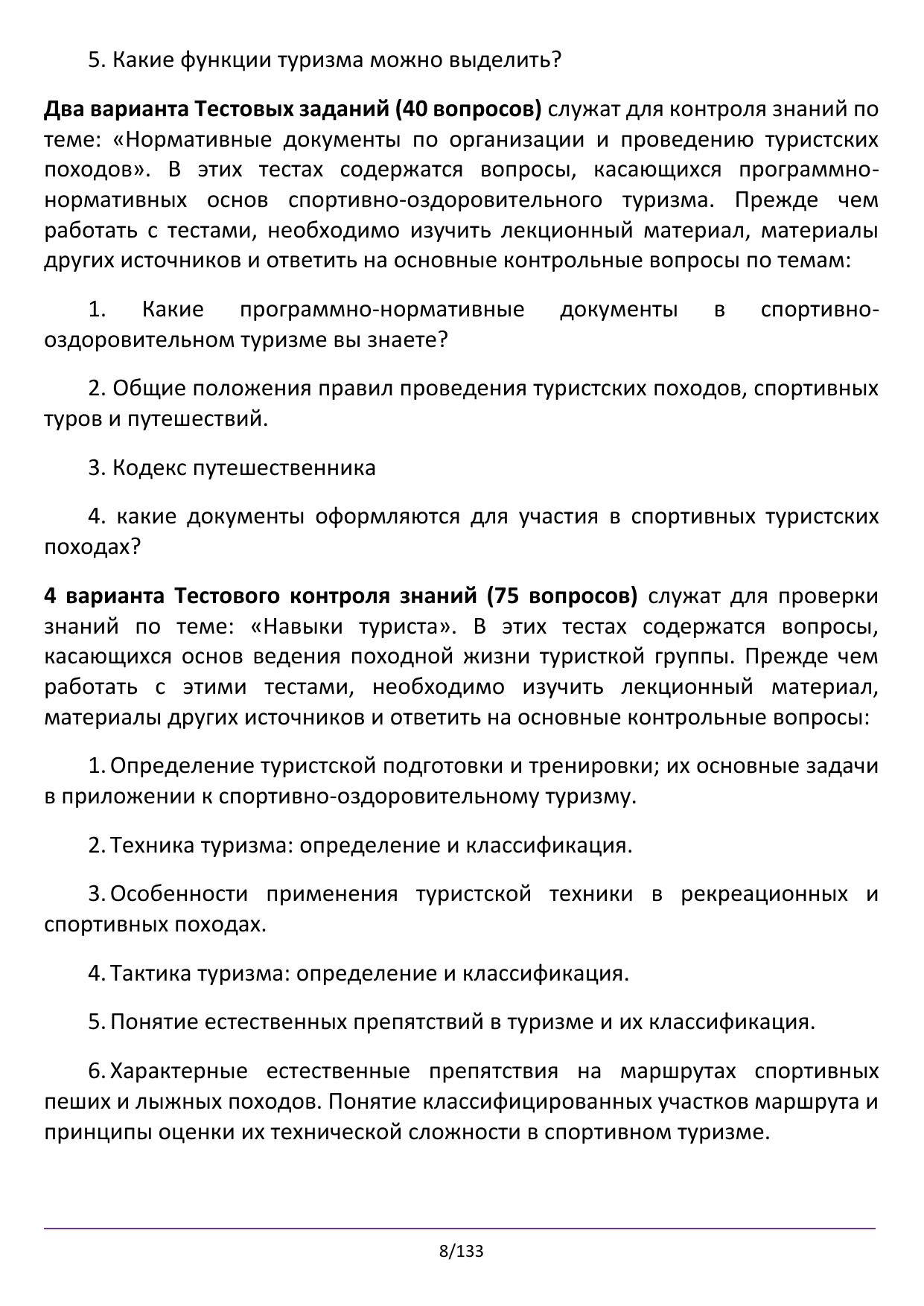 Настоящее пособие составлено в соответствии с программой специализации и с требованиями государственного образовательного стандарта. Данные тесты могут использоваться студентами других специализаций, изучающих дисциплину «Туризм».