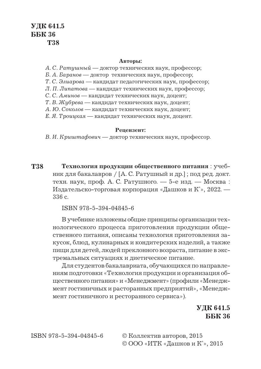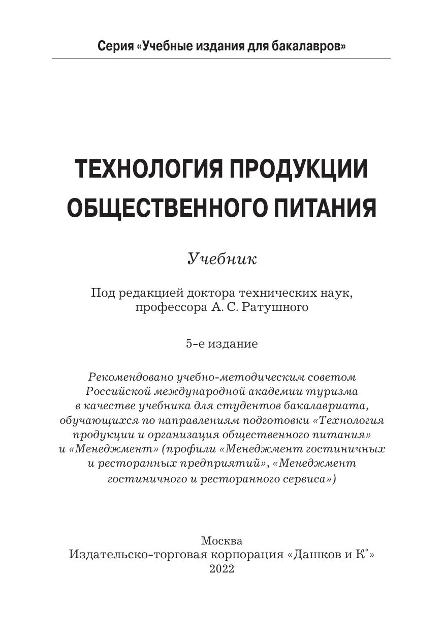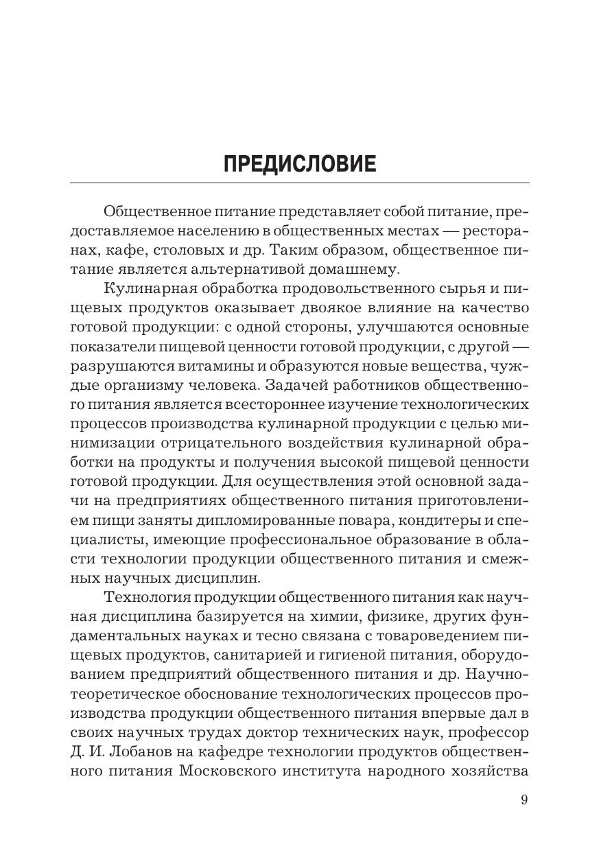 В учебнике изложены общие принципы организации технологического процесса приготовления продукции общественного питания, описаны технология приготовления закусок, блюд, кулинарных и кондитерских изделий, а также пищи для детей, людей преклонного возраста, питание в экстремальных ситуациях и диетическое питание. Для студентов бакалавриата, обучающихся по направлениям подготовки "Технология продукции и организация общественного питания" и "Менеджмент" (профили "Менеджмент гостиничного и ресторанных предприятий", "Менеджмент гостиничного и ресторанного сервиса").