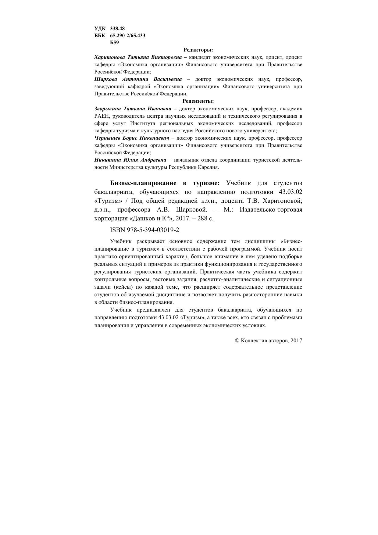 Учебник раскрывает основное содержание тем дисциплины «Бизнес-планирование в туризме» в соответствии с рабочей программой. Учебник носит практико-ориентированный характер, большое внимание в нем уделено подборке реальных ситуаций и примеров из практики функционирования и государственного регулирования туристских организаций. Практическая часть учебника содержит контрольные вопросы, тестовые задания, расчетно-аналитические и ситуационные задачи (кейсы) по каждой теме, что расширяет содержательное представление студентов об изучаемой дисциплине и позволяет получить разносторонние навыки в области бизнес-планирования. Учебник предназначен для студентов бакалавриата, обучающихся по направлению подготовки 43.03.02 «Туризм», а также всех, кто связан с проблемами планирования и управления в современных экономических условиях.