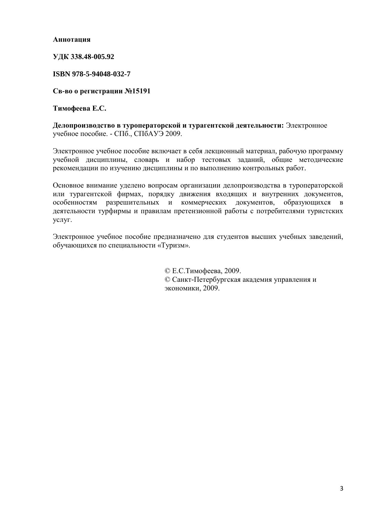 Электронное учебное пособие включает в себя лекционный материал, рабочую программу учебной дисциплины, словарь и набор тестовых заданий, общие методические рекомендации по изучению дисциплины и по выполнению контрольных работ. Основное внимание уделено вопросам организации делопроизводства в туроператорской или турагентской фирмах, порядку движения входящих и внутренних документов, особенностям разрешительных и коммерческих документов, образующихся в деятельности турфирмы и правилам претензионной работы с потребителями туристских услуг. Электронное учебное пособие предназначено для студентов высших учебных заведений, обучающихся по специальности «Туризм». Электронное учебное пособие для дистанционного обучения