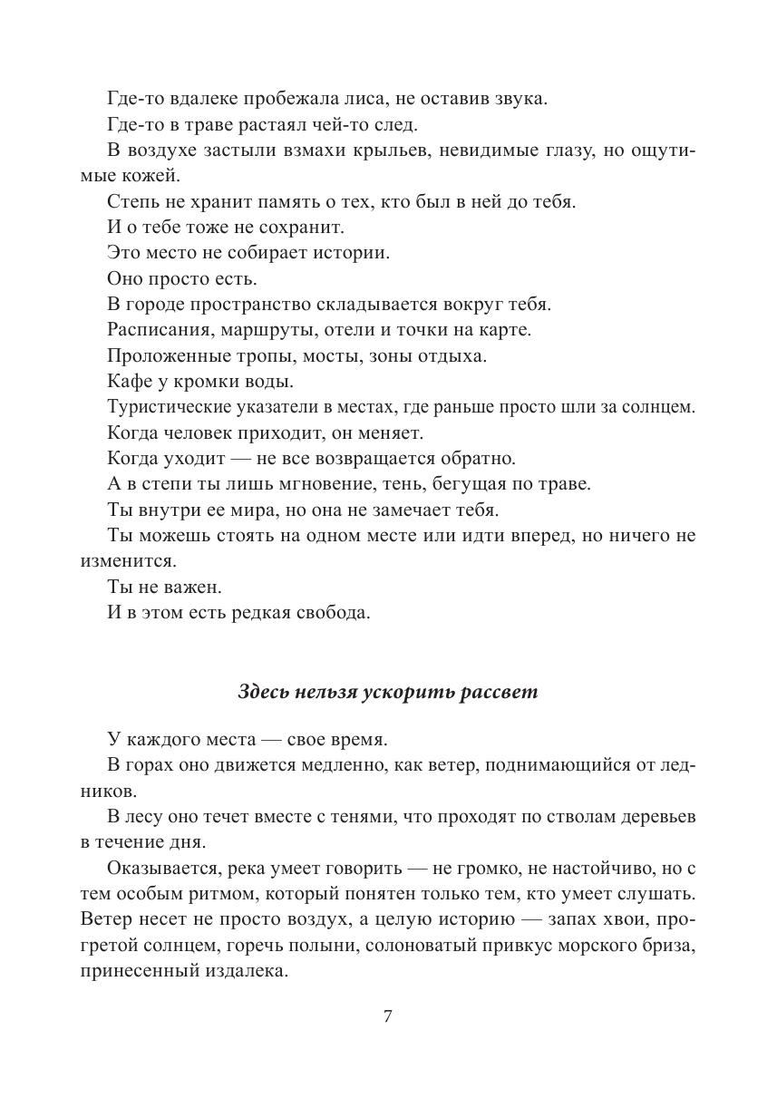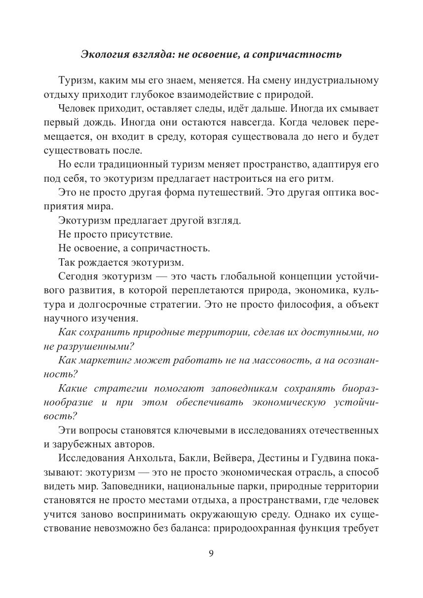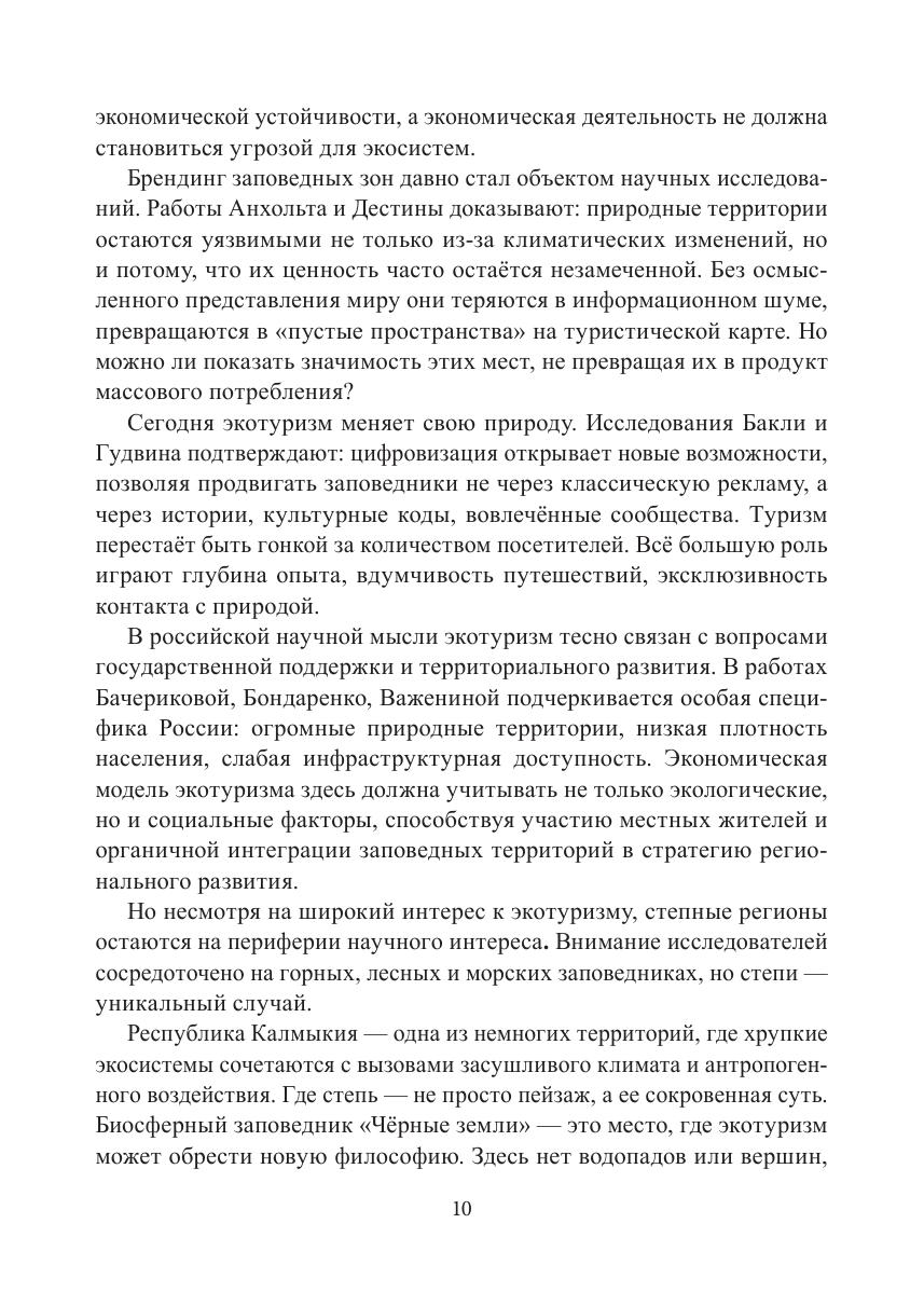 степь — не фон, а самостоятельный мир со своим ритмом и законами. Биосферный заповедник «Чёрные земли» — уникальное пространство, в котором экотуризм становится способом познания древней экосистемы, требующей уважительного присутствия. Эта книга не о маршрутах, а о взгляде. О том, как природа становится не местом для посещения, а пространством для диалога. О том, как можно путешествовать, не оставляя следов. И о будущем экотуризма — внимательном, ответственном, сохраняющем.