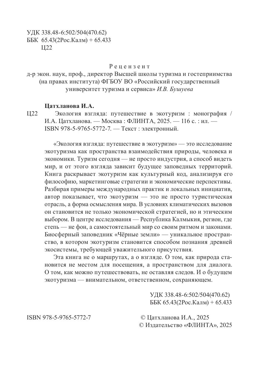 «Экология взгляда: путешествие в экотуризм» — это исследование экотуризма как пространства взаимодействия природы, человека и экономики. Туризм сегодня — не просто индустрия, а способ видеть мир, и от этого взгляда зависит будущее заповедных территорий. Книга раскрывает экотуризм как культурный код, анализируя его философию, маркетинговые стратегии и экономические перспективы. Разбирая примеры международных практик и локальных инициатив, автор показывает, что экотуризм — это не просто туристическая отрасль, а форма осмысления мира. В условиях климатических вызовов он становится не только экономической стратегией, но и этическим выбором. В центре исследования — Республика Калмыкия, регион, где
