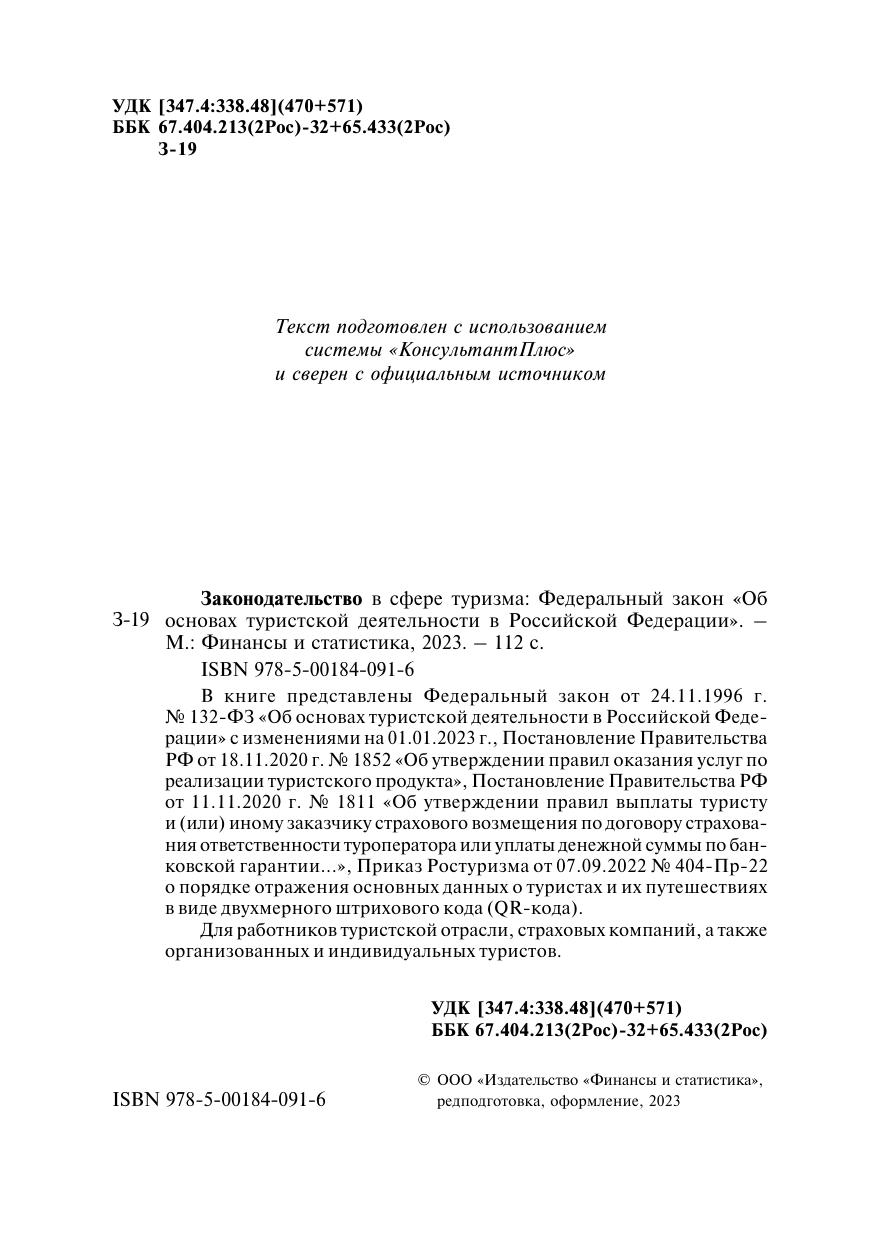 В книге представлены Федеральный закон от 24.11.1996 г. № 132-ФЗ «Об основах туристской деятельности в Российской Федерации» с изменениями на 01.01.2023 г., Постановление Правительства РФ от 18.11.2020 г. № 1852 «Об утверждении правил оказания услуг по реализации туристского продукта», Постановление Правительства РФ от 11.11.2020 г. № 1811 «Об утверждении правил выплаты туристу и (или) иному заказчику страхового возмещения по договору страхования ответственности туроператора или уплаты денежной суммы по банковской гарантии...», Приказ Ростуризма от 07.09.2022 № 404-Пр-22 о порядке отражения основных данных о туристах и их путешествиях в виде двухмерного штрихового кода (QR-кода).