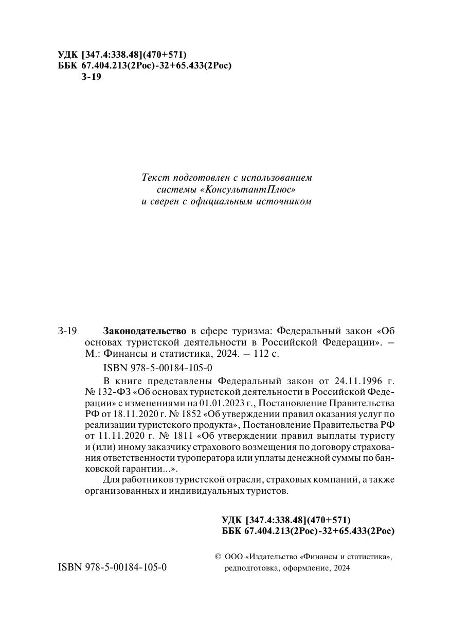 В книге представлены Федеральный закон от 24.11.1996 г. № 132-ФЗ «Об основах туристской деятельности в Российской Федерации» с изменениями на 01.01.2024 г., Постановление Правительства РФ от 18.11.2020 г. № 1852 «Об утверждении правил оказания услуг по реализации туристского продукта», Постановление Правительства РФ от 11.11.2020 г. № 1811 «Об утверждении правил выплаты туристу и (или) иному заказчику страхового возмещения по договору страхования ответственности туроператора или уплаты денежной суммы по банковской гарантии...». Для работников туристской отрасли, страховых компаний, а также организованных и индивидуальных туристов.