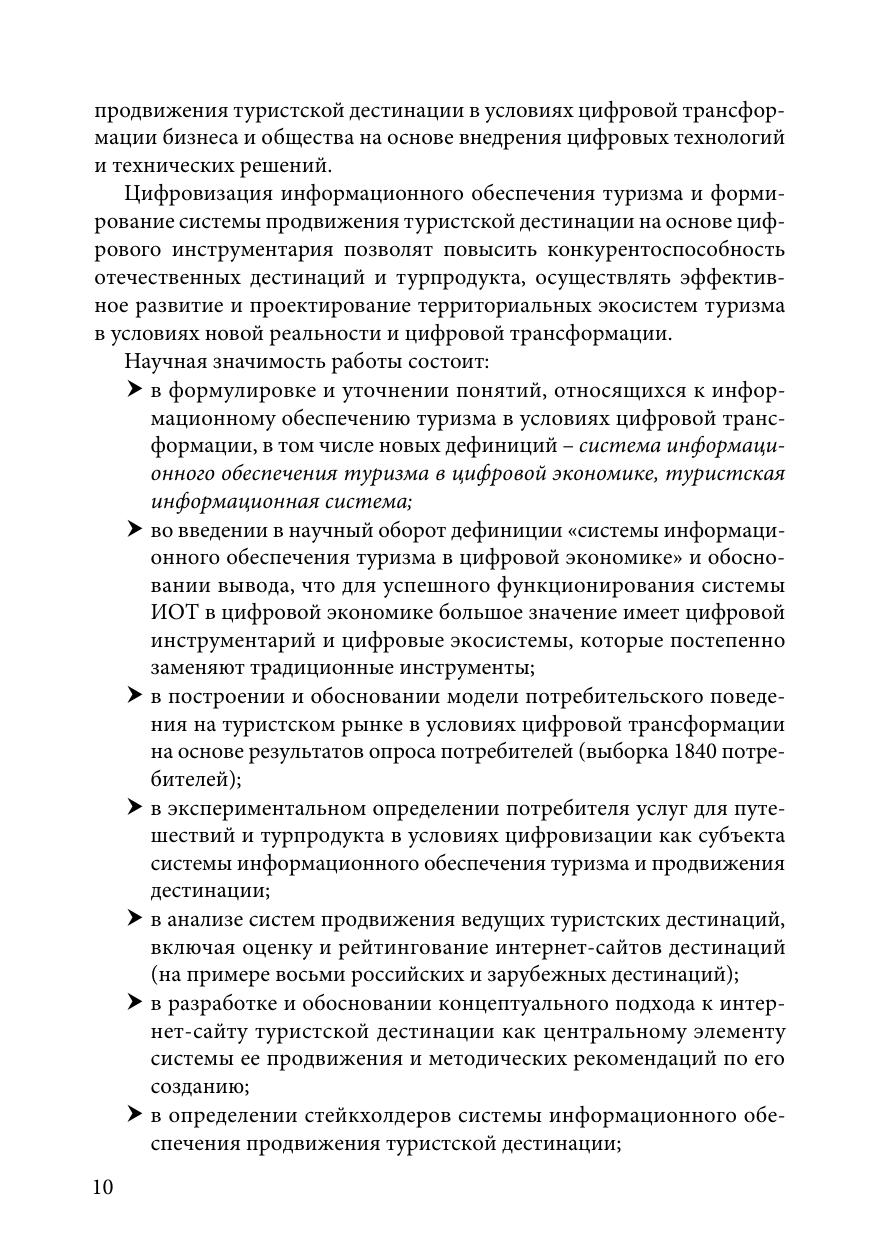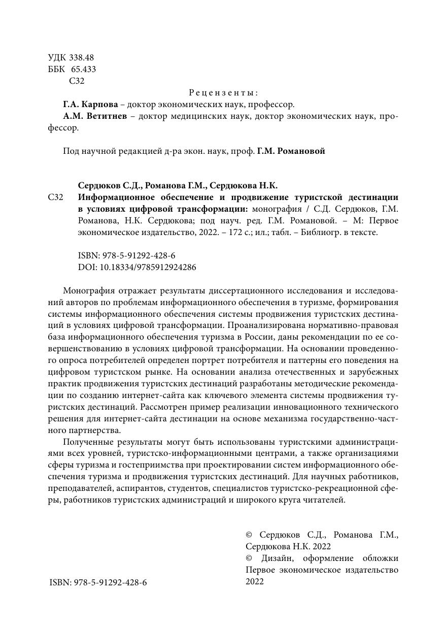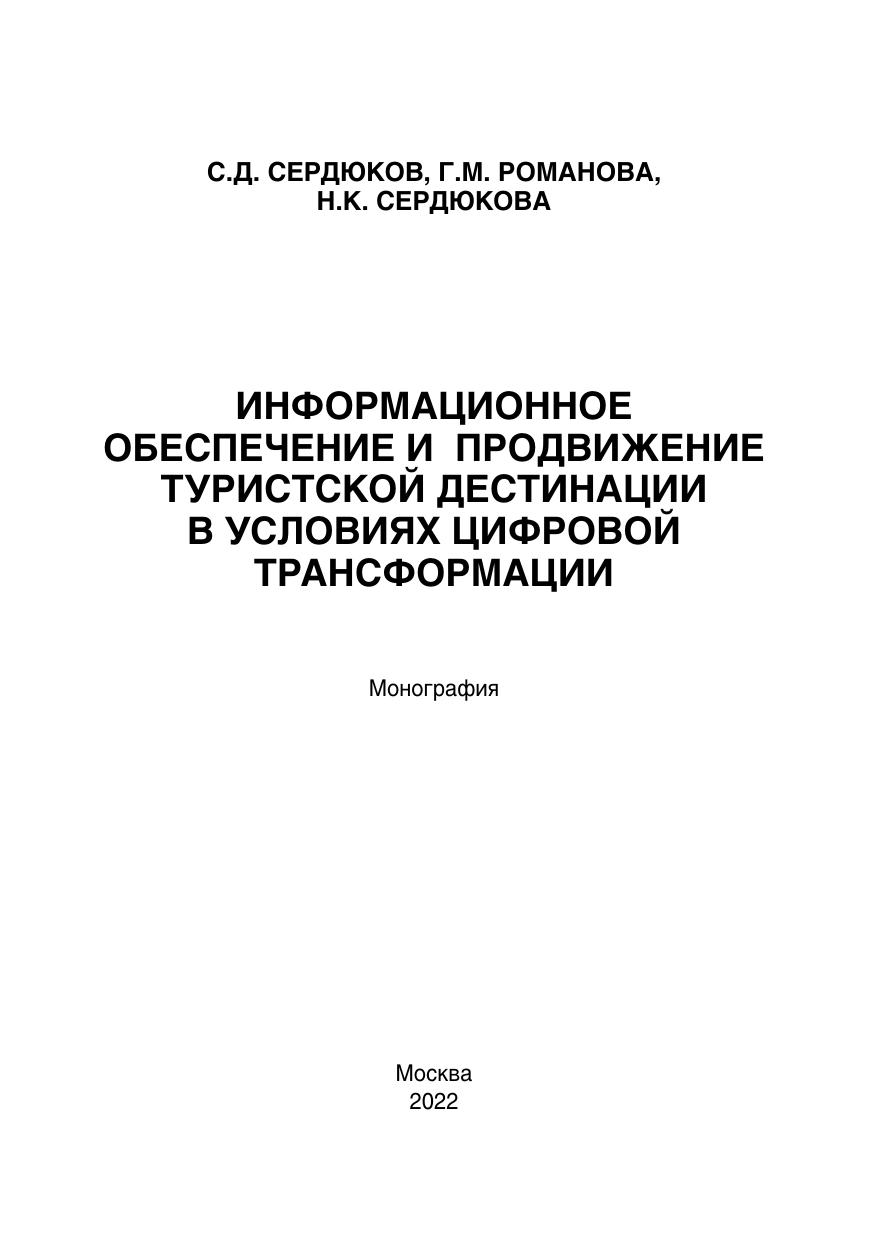 Монография отражает результаты диссертационного исследования и исследований авторов по проблемам информационного обеспечения в туризме, формирования системы информационного обеспечения системы продвижения туристских дестинаций в условиях цифровой трансформации. Проанализирована нормативно-правовая база информационного обеспечения туризма в России, даны рекомендации по ее совершенствованию в условиях цифровой трансформации. На основании проведенного опроса потребителей определен портрет потребителя и паттерны его поведения на цифровом туристском рынке. На основании анализа отечественных и зарубежных практик продвижения туристских дестинаций разработаны методические рекомендации по созданию интернет-сайта как ключевого элемента системы продвижения туристских дестинаций. Рассмотрен пример реализации инновационного технического решения для интернет-сайта дестинации на основе механизма государственно-частного партнерства.