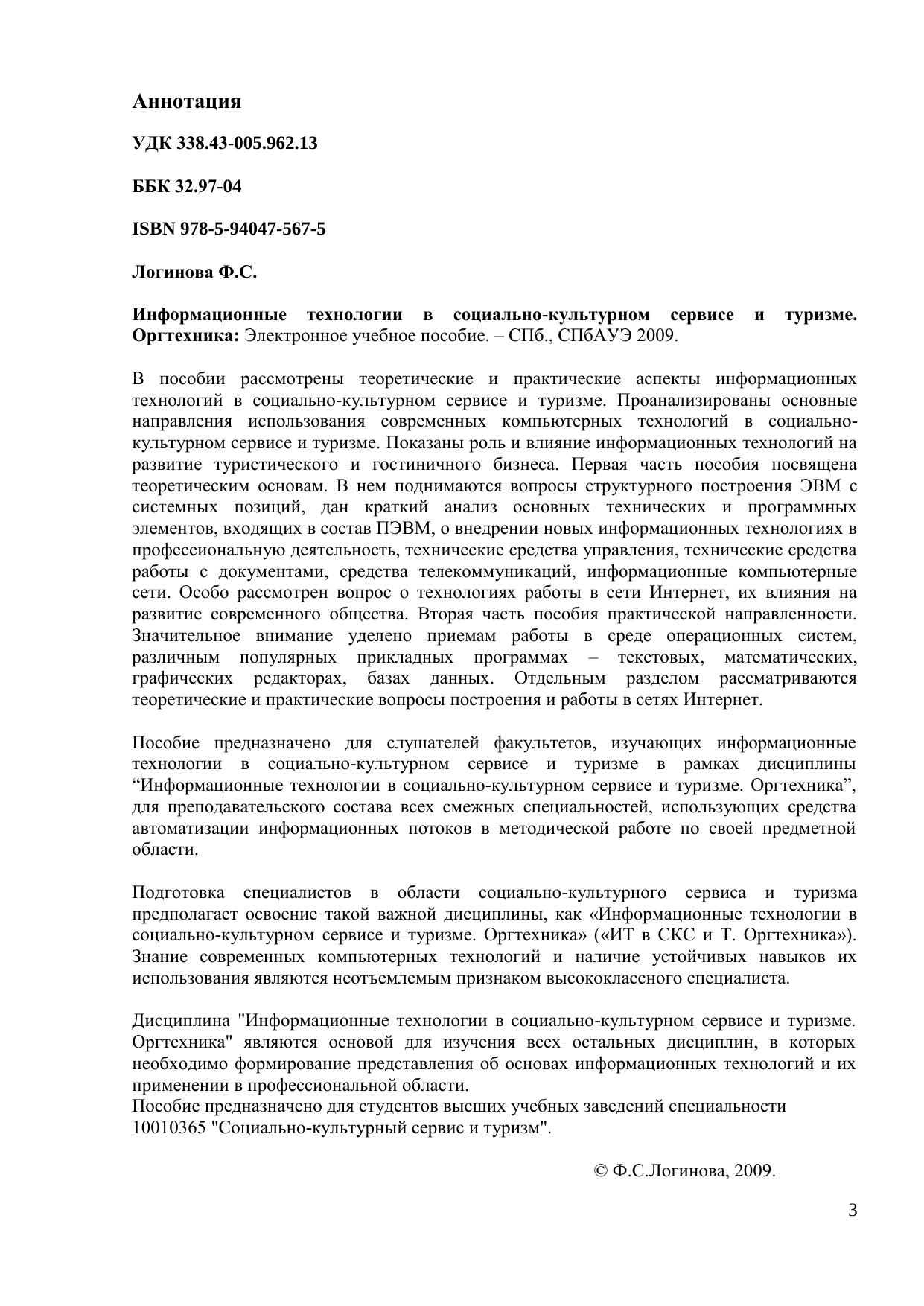 В пособии рассмотрены теоретические и практические аспекты информационных технологий в социально-культурном сервисе и туризме. Проанализированы основные направления использования современных компьютерных технологий в социально-культурном сервисе и туризме. Показаны роль и влияние информационных технологий на развитие туристического и гостиничного бизнеса. Первая часть пособия посвящена теоретическим основам. В нем поднимаются вопросы структурного построения ЭВМ с системных позиций, дан краткий анализ основных технических и программных элементов, входящих в состав ПЭВМ, о внедрении новых информационных технологиях в профессиональную деятельность, технические средства управления, технические средства работы с документами, средства телекоммуникаций, информационные компьютерные сети. Особо рассмотрен вопрос о технологиях работы в сети Интернет, их влияния на развитие современного общества. Вторая часть пособия практической направленности. Значительное внимание уделено приемам работы в среде операционных систем, различным популярных прикладных программах – текстовых, математических, графических редакторах, базах данных. Отдельным разделом рассматриваются теоретические и практические вопросы построения и работы в сетях Интернет. Электронное учебное пособие для дистанционного обучения