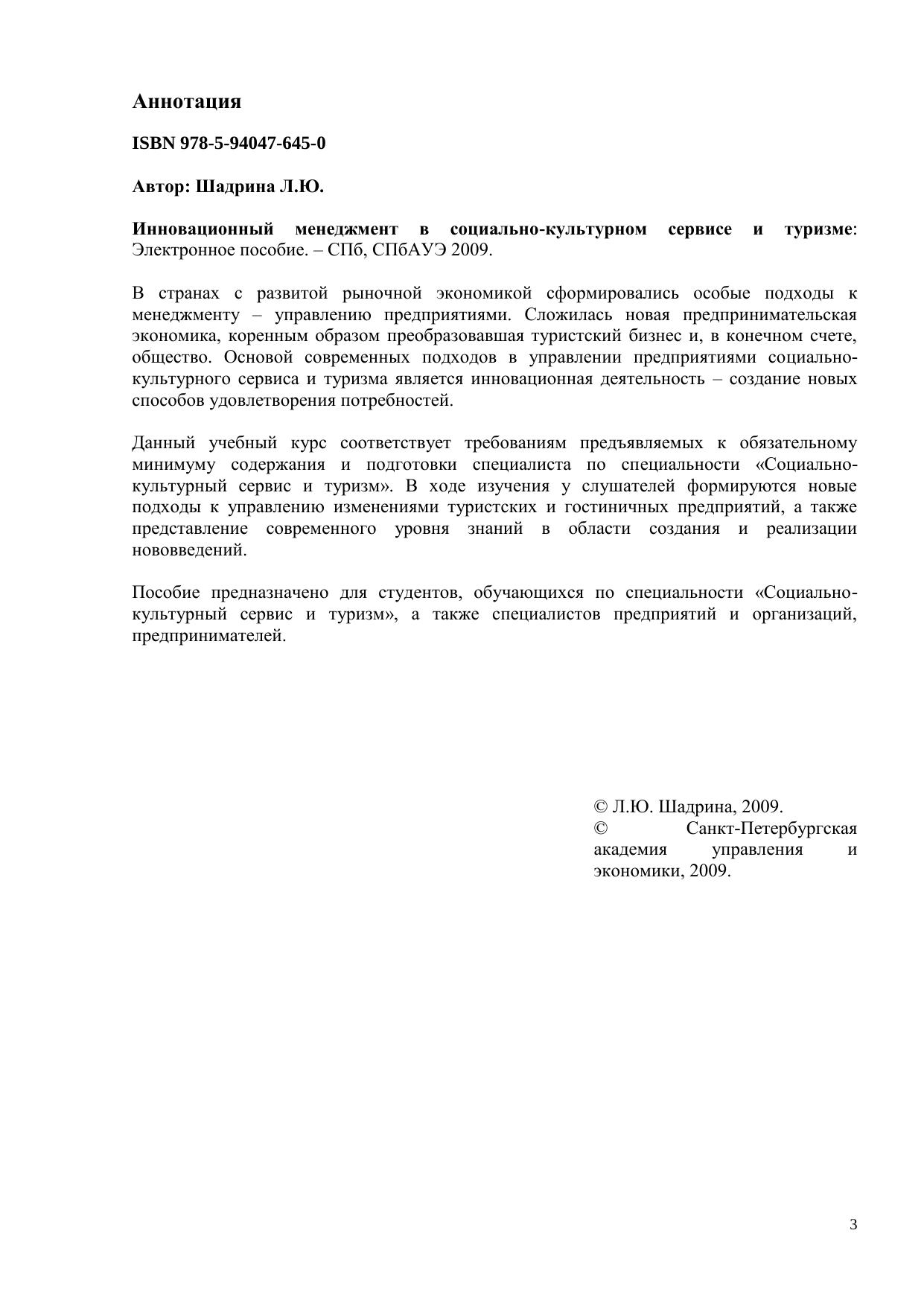 В странах с развитой рыночной экономикой сформировались особые подходы к менеджменту – управлению предприятиями. Сложилась новая предпринимательская экономика, коренным образом преобразовавшая туристский бизнес и, в конечном счете, общество. Основой современных подходов в управлении предприятиями социально-культурного сервиса и туризма является инновационная деятельность – создание новых способов удовлетворения потребностей. Данный учебный курс соответствует требованиям предъявляемых к обязательному минимуму содержания и подготовки специалиста по специальности «Социально-культурный сервис и туризм». В ходе изучения у слушателей формируются новые подходы к управлению изменениями туристских и гостиничных предприятий, а также представление современного уровня знаний в области создания и реализации нововведений. Электронное учебное пособие для дистанционного обучения