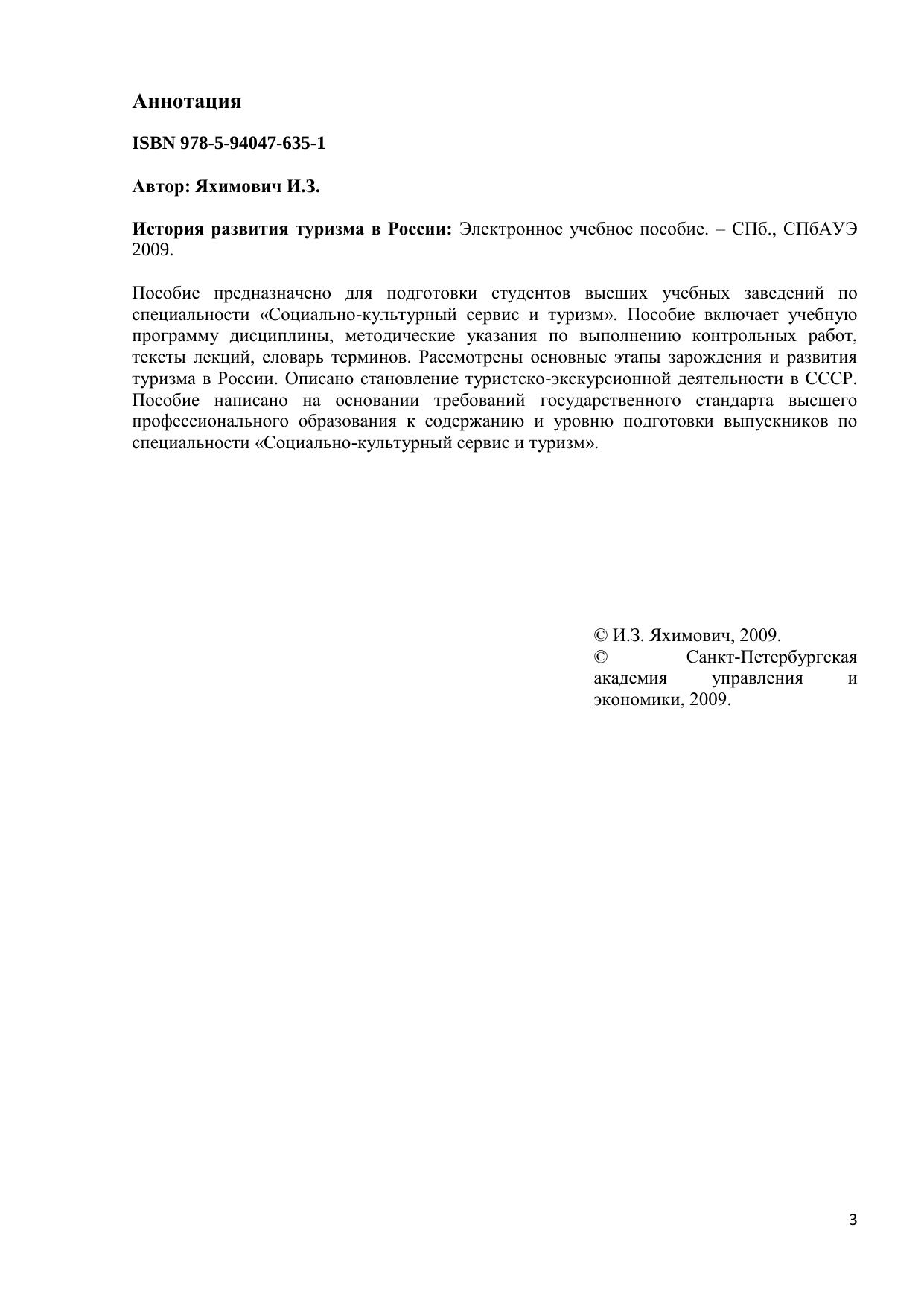 Пособие предназначено для подготовки студентов высших учебных заведений по специальности «Социально-культурный сервис и туризм». Пособие включает учебную программу дисциплины, методические указания по выполнению контрольных работ, тексты лекций, словарь терминов. Рассмотрены основные этапы зарождения и развития туризма в России. Описано становление туристско-экскурсионной деятельности в СССР. Пособие написано на основании требований государственного стандарта высшего профессионального образования к содержанию и уровню подготовки выпускников по специальности «Социально-культурный сервис и туризм». Электронное учебное пособие для дистанционного обучения