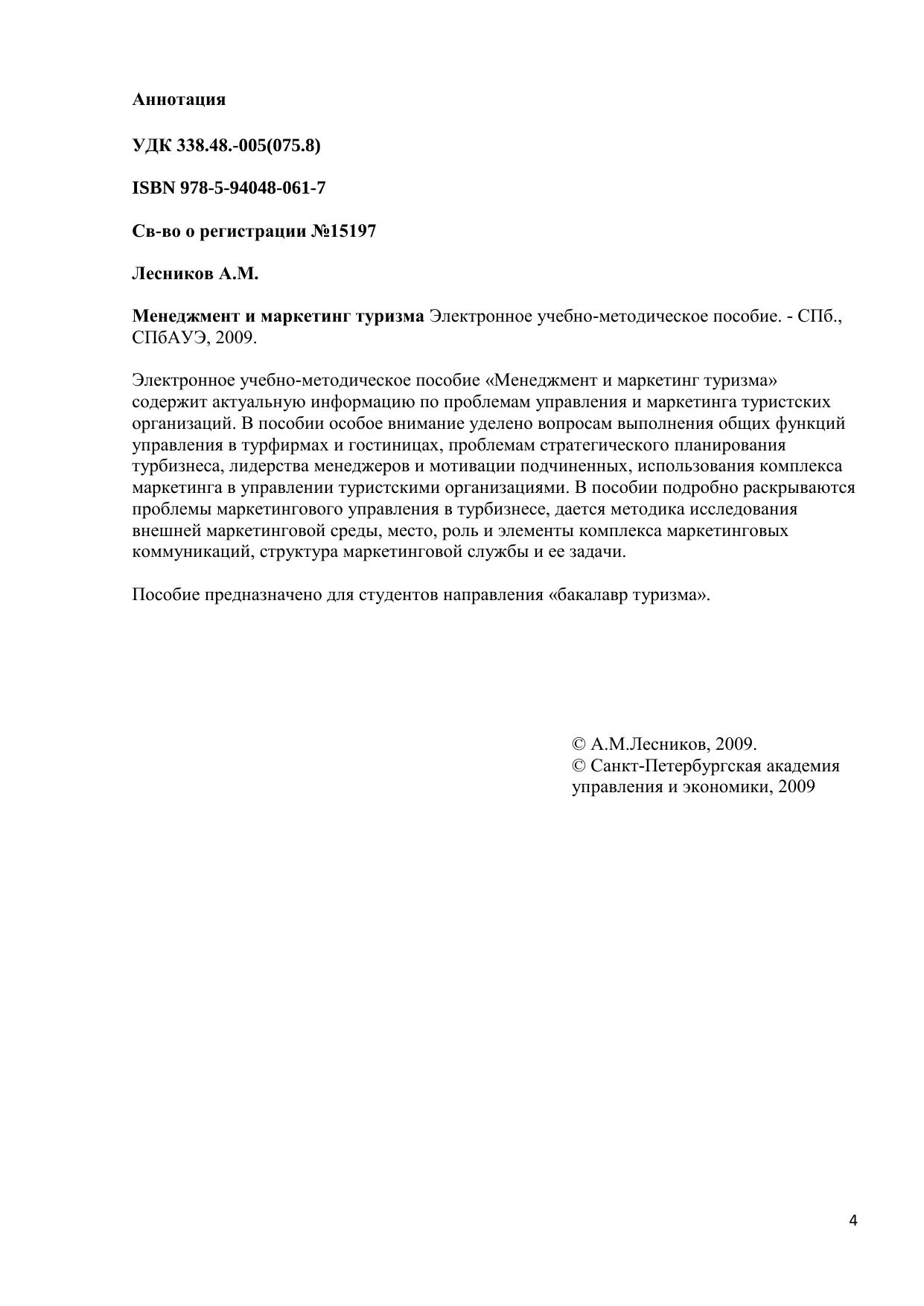 Электронное учебно-методическое пособие «Менеджмент и маркетинг туризма» содержит актуальную информацию по проблемам управления и маркетинга туристских организаций. В пособии особое внимание уделено вопросам выполнения общих функций управления в турфирмах и гостиницах, проблемам стратегического планирования турбизнеса, лидерства менеджеров и мотивации подчиненных, использования комплекса маркетинга в управлении туристскими организациями. В пособии подробно раскрываются проблемы маркетингового управления в турбизнесе, дается методика исследования внешней маркетинговой среды, место, роль и элементы комплекса маркетинговых коммуникаций, структура маркетинговой службы и ее задачи. Пособие предназначено для студентов направления «бакалавр туризма». Электронное учебное пособие для дистанционного обучения
