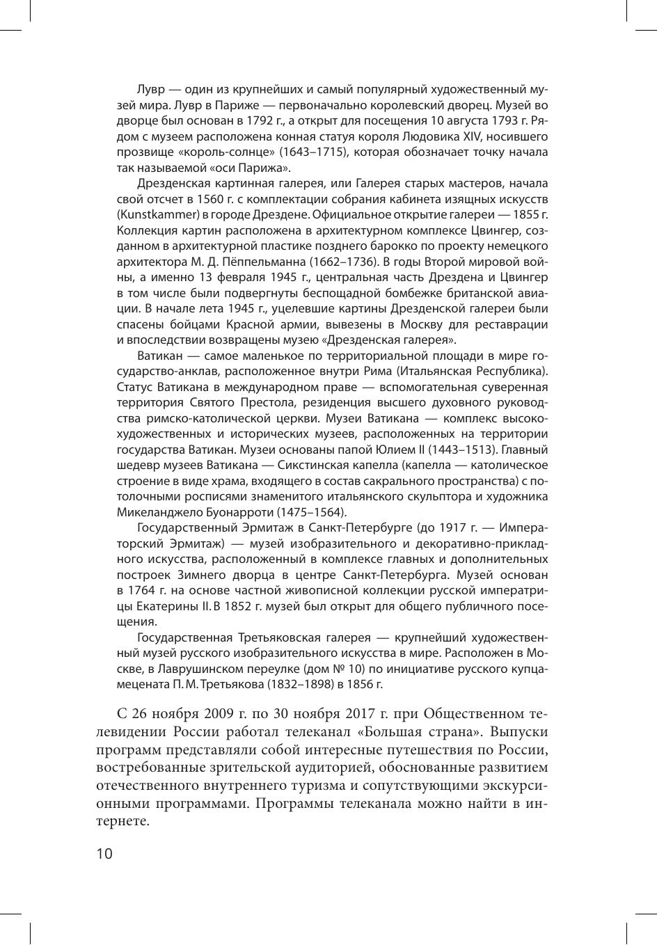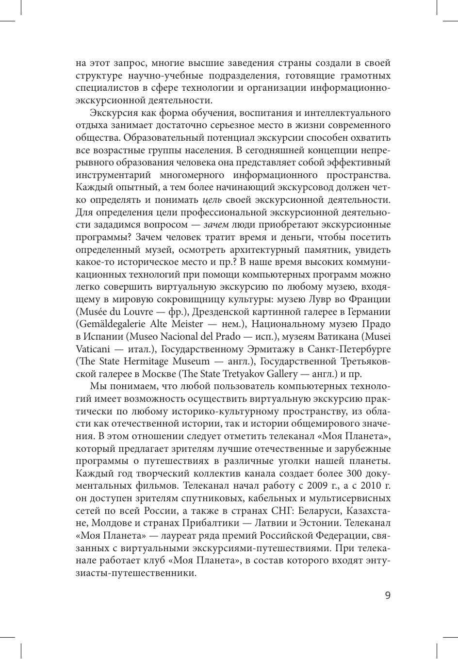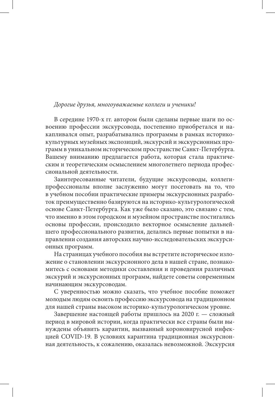 В учебном пособии освещены вопросы истории становления и развития экскурсионного дела в России, представлены классификации экскурсий, раскрыто содержание основных направлений современных экскурсионных методик, определен коммуникативно-образовательный потенциал экскурсий, предлагаются практические рекомендации по разработке, организации и проведению экскурсий различного типа. Кроме того, раскрыты особенности профессиональной деятельности экскурсоводов. Учебное пособие предназначено для студентов высших учебных заведений, изучающих учебные дисциплины, ориентированные на подготовку экскурсоводов с профессиональным историческим, культурологическим, искусствоведческим и педагогическим образованием; собранный в пособии практический матерал может быть полезен экскурсоводам-практикам.