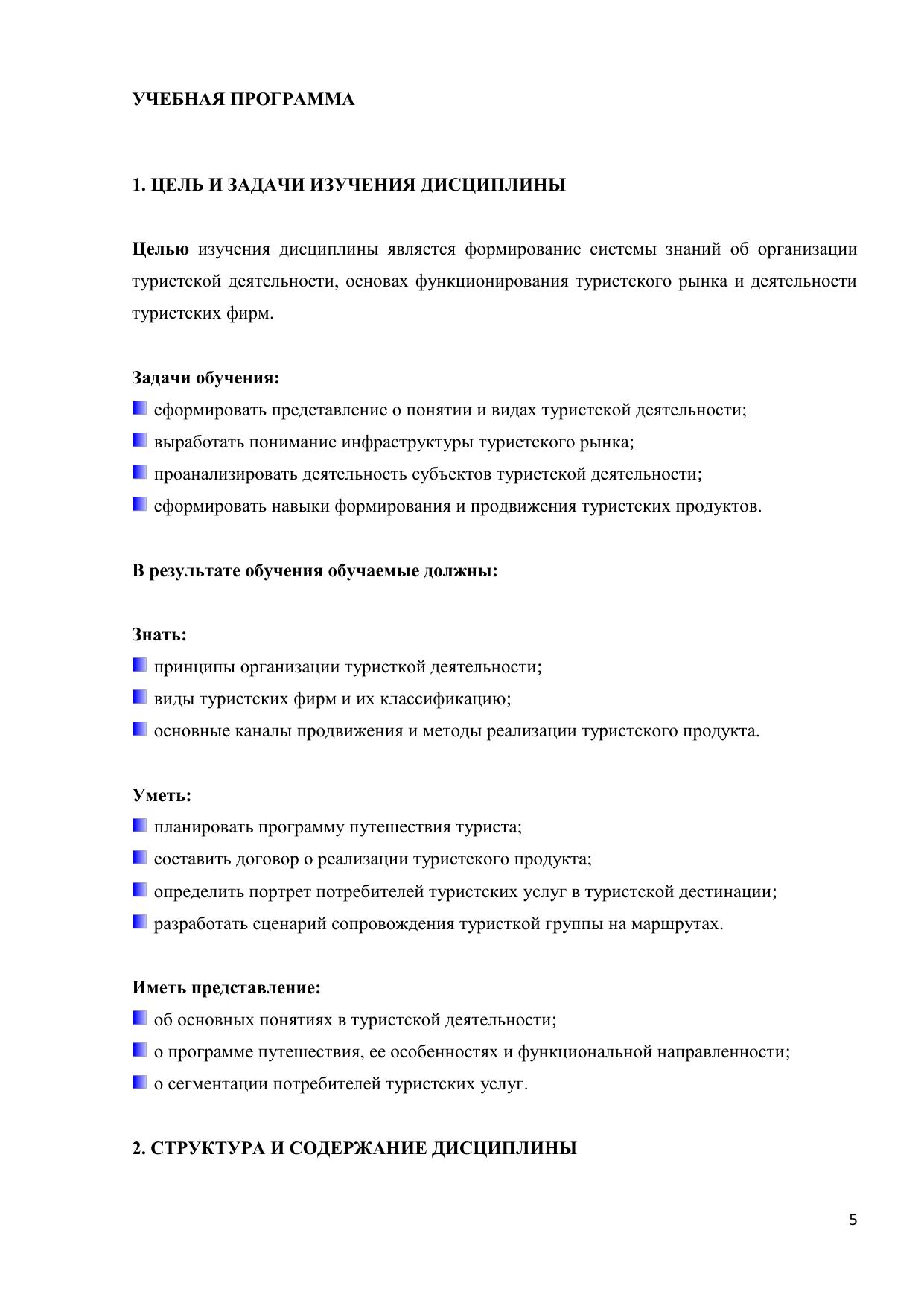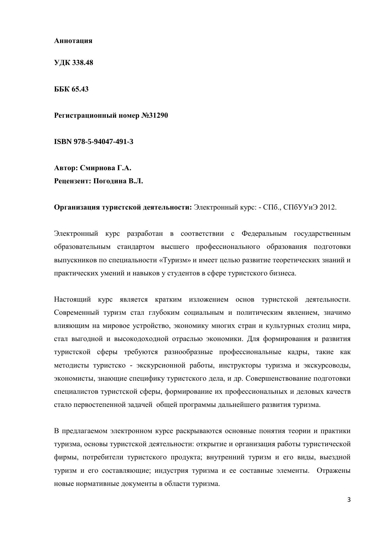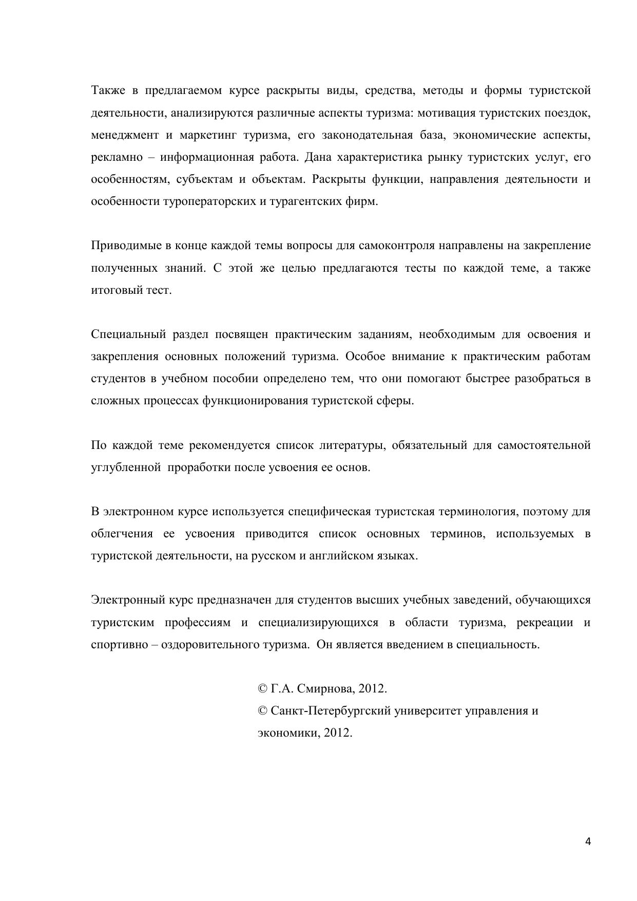 Электронный курс разработан в соответствии с Федеральным государственным образовательным стандартом высшего профессионального образования подготовки выпускников по специальности «Туризм» и имеет целью развитие теоретических знаний и практических умений и навыков у студентов в сфере туристского бизнеса. Настоящий курс является кратким изложением основ туристской деятельности. Современный туризм стал глубоким социальным и политическим явлением, значимо влияющим на мировое устройство, экономику многих стран и культурных столиц мира, стал выгодной и высокодоходной отраслью экономики. Для формирования и развития туристской сферы требуются разнообразные профессиональные кадры, такие как методисты туристско-экскурсионной работы, инструкторы туризма и экскурсоводы, экономисты, знающие специфику туристского дела, и др. Совершенствование подготовки специалистов туристской сферы, формирование их профессиональных и деловых качеств стало первостепенной задачей общей программы дальнейшего развития туризма. В предлагаемом электронном курсе раскрываются основные понятия теории и практики туризма, основы туристской деятельности: открытие и организация работы туристической фирмы, потребители туристского продукта внутренний туризм и его виды, выездной туризм и его составляющие индустрия туризма и ее составные элементы. Отражены новые нормативные документы в области туризма. Также в предлагаемом курсе раскрыты виды, средства, методы и формы туристской деятельности, анализируются различные аспекты туризма: мотивация туристских поездок, менеджмент и маркетинг туризма, его законодательная база, экономические аспекты, рекламно-информационная работа. Дана характеристика рынку туристских услуг, его особенностям, субъектам и объектам. Раскрыты функции, направления деятельности и особенности туроператорских и турагентских фирм. Приводимые в конце каждой темы вопросы для самоконтроля направлены на закрепление полученных знаний. С этой же целью предлагаются тесты по каждой теме, а также итоговый тест. Специальный раздел посвящен практическим заданиям, необходимым для освоения и закрепления основных положений туризма. Особое внимание к практическим работам студентов в учебном пособии определено тем, что они помогают быстрее разобраться в сложных процессах функционирования туристской сферы. По каждой теме рекомендуется список литературы, обязательный для самостоятельной углубленной проработки после усвоения ее основ. В электронном курсе используется специфическая туристская терминология, поэтому для облегчения ее усвоения приводится список основных терминов, используемых в туристской деятельности, на русском и английском языках. Электронный курс предназначен для студентов высших учебных заведений, обучающихся туристским профессиям и специализирующихся в области туризма, рекреации и спортивно – оздоровительного туризма. Он является введением в специальность.