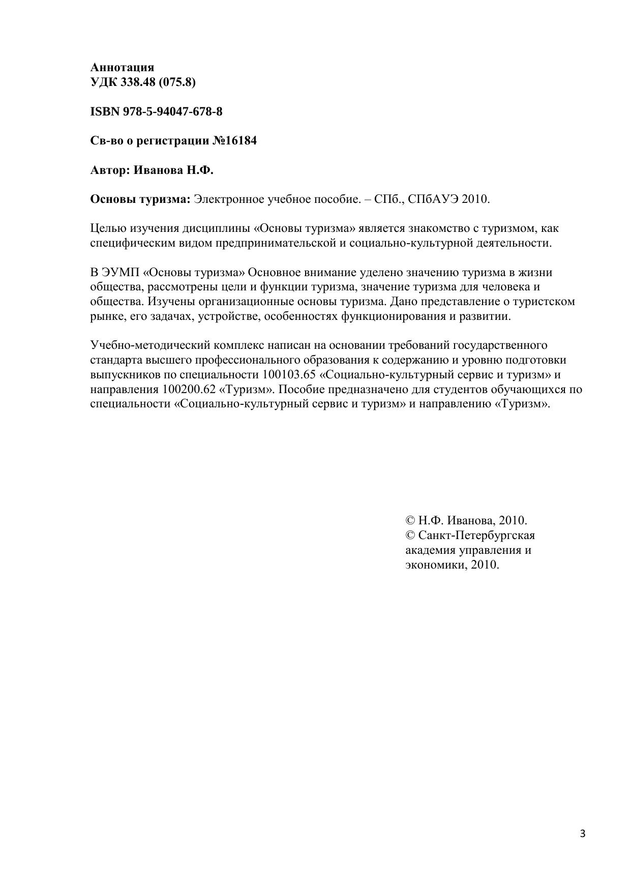 Целью изучения дисциплины «Основы туризма» является знакомство с туризмом, как специфическим видом предпринимательской и социально-культурной деятельности. В ЭУМП «Основы туризма» Основное внимание уделено значению туризма в жизни общества, рассмотрены цели и функции туризма, значение туризма для человека и общества. Изучены организационные основы туризма. Дано представление о туристском рынке, его задачах, устройстве, особенностях функционирования и развитии. Учебно-методический комплекс написан на основании требований государственного стандарта высшего профессионального образования к содержанию и уровню подготовки выпускников по специальности 100103.65 «Социально-культурный сервис и туризм» и направления 100200.62 «Туризм». Пособие предназначено для студентов, обучающихся по специальности «Социально-культурный сервис и туризм» и направлению «Туризм». Электронное учебное пособие для дистанционного обучения