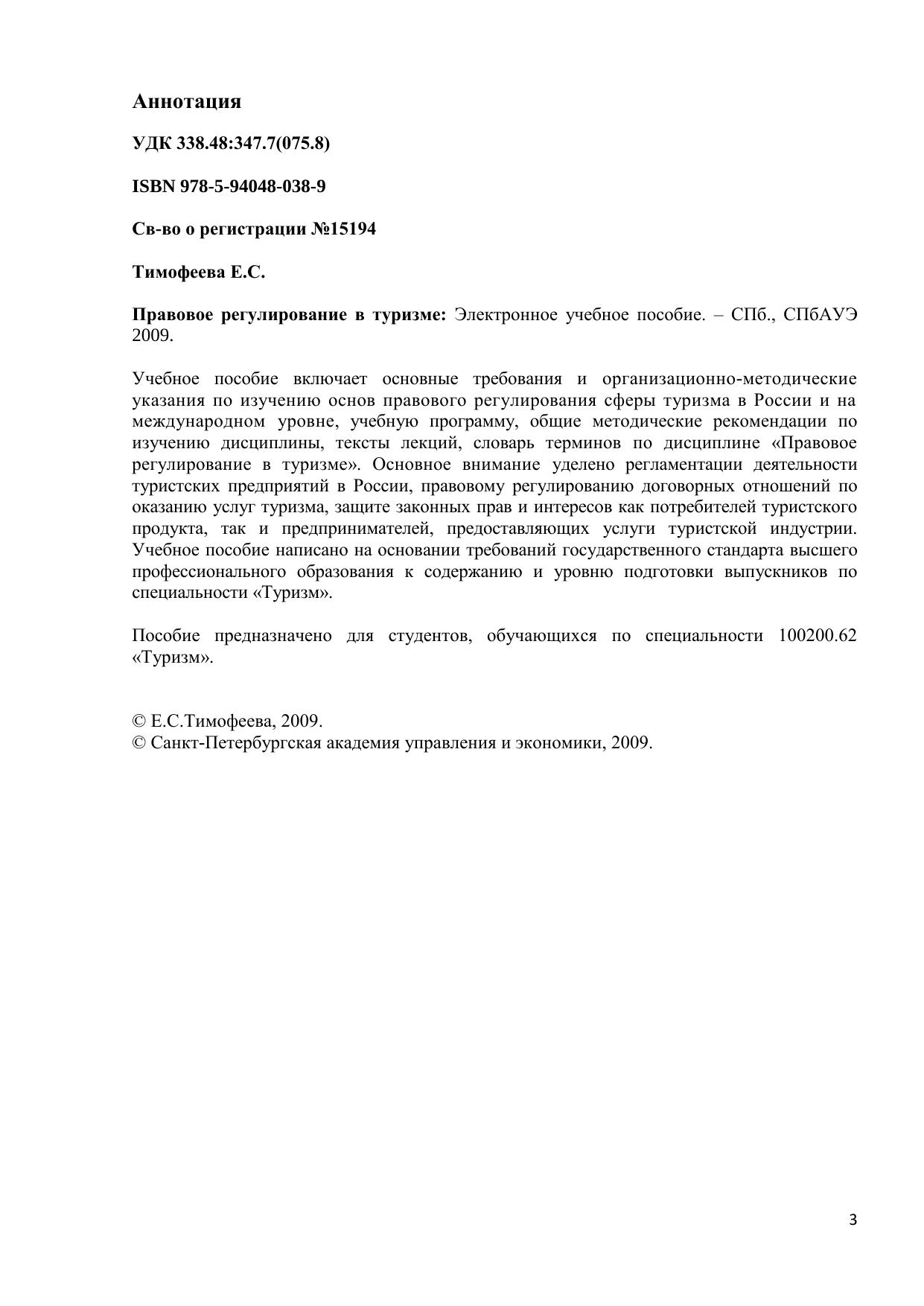 Учебное пособие включает основные требования и организационно-методические указания по изучению основ правового регулирования сферы туризма в России и на международном уровне, учебную программу, общие методические рекомендации по изучению дисциплины, тексты лекций, словарь терминов по дисциплине «Правовое регулирование в туризме». Основное внимание уделено регламентации деятельности туристских предприятий в России, правовому регулированию договорных отношений по оказанию услуг туризма, защите законных прав и интересов как потребителей туристского продукта, так и предпринимателей, предоставляющих услуги туристской индустрии. Учебное пособие написано на основании требований государственного стандарта высшего профессионального образования к содержанию и уровню подготовки выпускников по специальности «Туризм». Пособие предназначено для студентов, обучающихся по специальности 100200.62 «Туризм». Электронное учебное пособие для дистанционного обучения