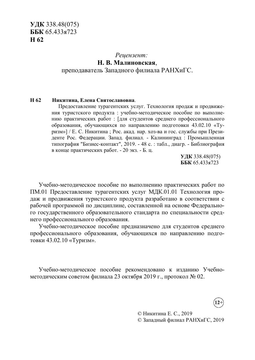 Учебно-методическое пособие по выполнению практических работ по ПМ.01 Предоставление турагентских услуг МДК.01.01 Технология продаж и продвижения туристского продукта разработано в соответствии с рабочей программой по дисциплине, составленной на основе Федерального государственного образовательного стандарта по специальности среднего профессионального образования. Учебно-методическое пособие предназначено для студентов среднего профессионального образования, обучающихся по направлению подготовки 43.02.10 «Туризм».