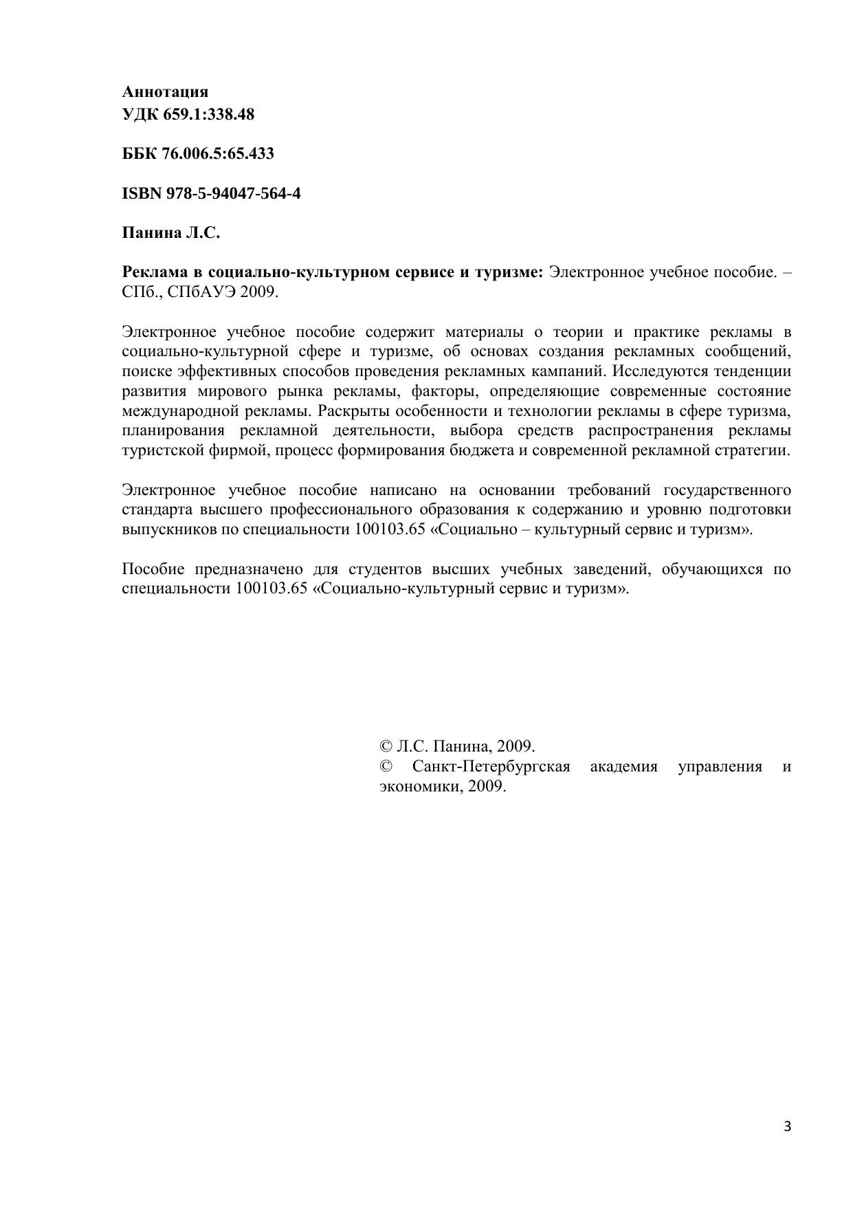 Электронное учебное пособие содержит материалы о теории и практике рекламы в социально-культурной сфере и туризме, об основах создания рекламных сообщений, поиске эффективных способов проведения рекламных кампаний. Исследуются тенденции развития мирового рынка рекламы, факторы, определяющие современные состояние международной рекламы. Раскрыты особенности и технологии рекламы в сфере туризма, планирования рекламной деятельности, выбора средств распространения рекламы туристской фирмой, процесс формирования бюджета и современной рекламной стратегии. Электронное учебное пособие написано на основании требований государственного стандарта высшего профессионального образования к содержанию и уровню подготовки выпускников по специальности 100103.65 «Социально – культурный сервис и туризм». Электронное учебное пособие для дистанционного обучения