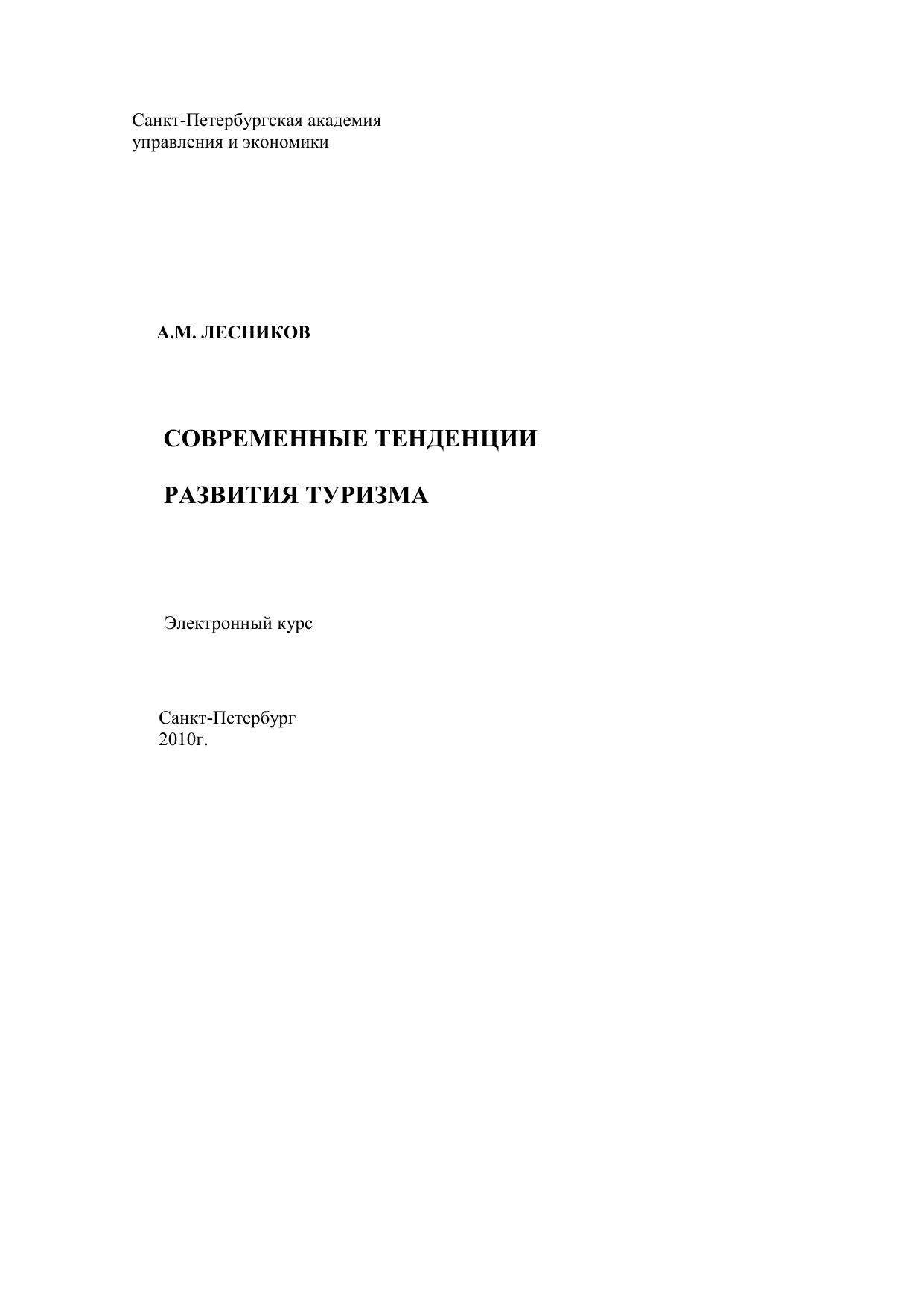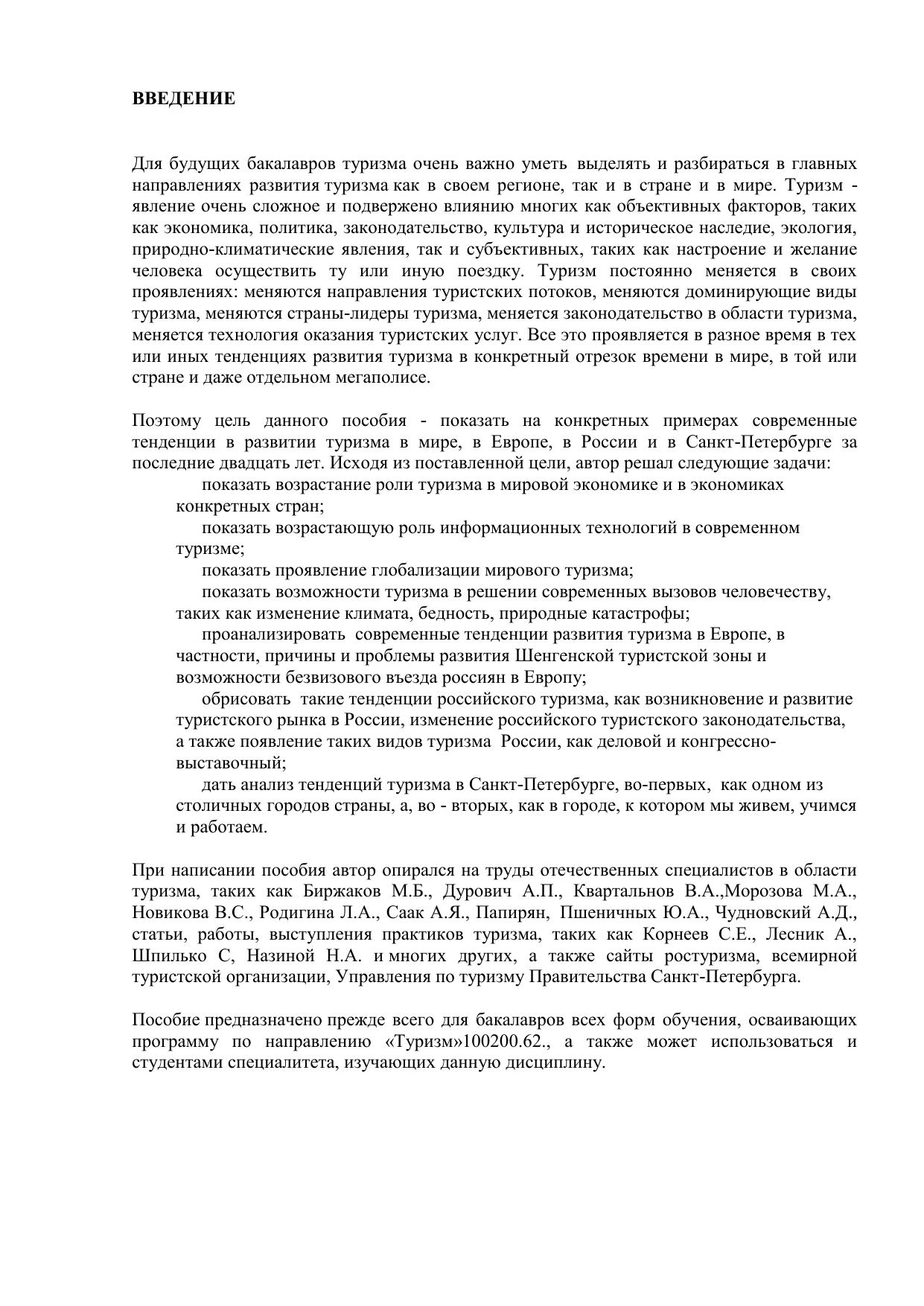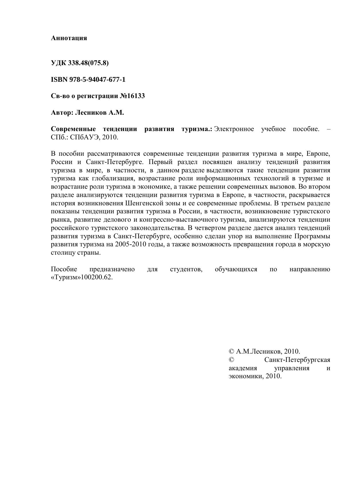 В пособии рассматриваются современные тенденции развития туризма в мире, Европе, России и Санкт-Петербурге. Первый раздел посвящен анализу тенденций развития туризма в мире, в частности, в данном разделе выделяются такие тенденции развития туризма как глобализация, возрастание роли информационных технологий в туризме и возрастание роли туризма в экономике, а также решении современных вызовов. Во втором разделе анализируются тенденции развития туризма в Европе, в частности, раскрывается история возникновения Шенгенской зоны и ее современные проблемы. В третьем разделе показаны тенденции развития туризма в России, в частности, возникновение туристского рынка, развитие делового и конгрессно-выставочного туризма, анализируются тенденции российского туристского законодательства. В четвертом разделе дается анализ тенденций развития туризма в Санкт-Петербурге, особенно сделан упор на выполнение Программы развития туризма на 2005-2010 годы, а также возможность превращения города в морскую столицу страны. Электронное учебное пособие