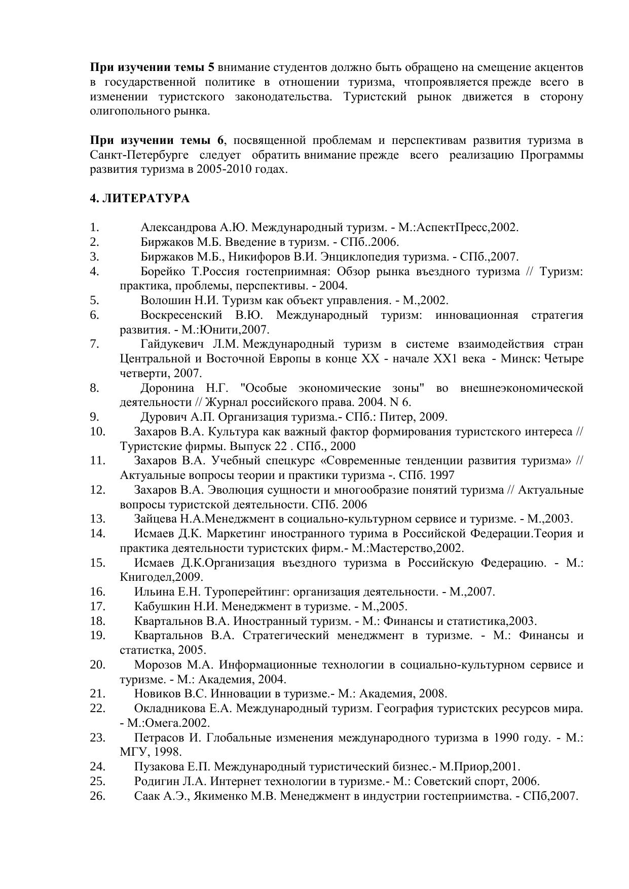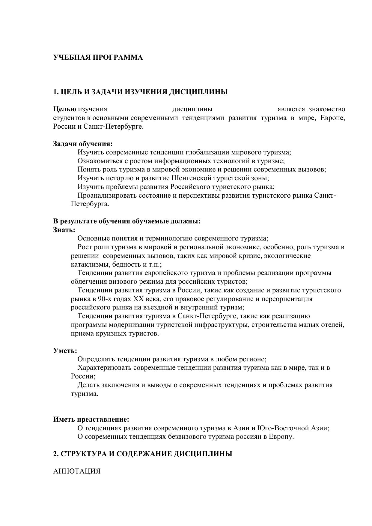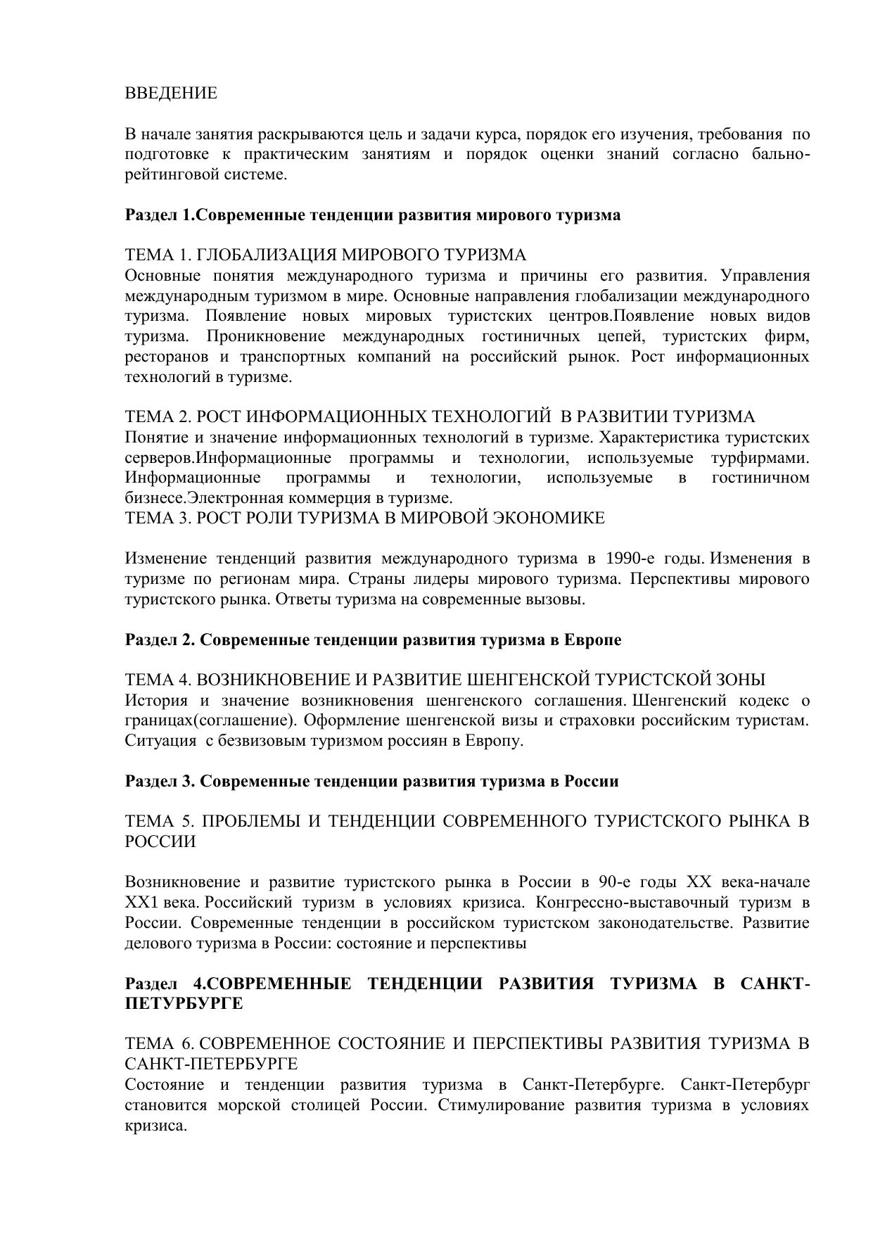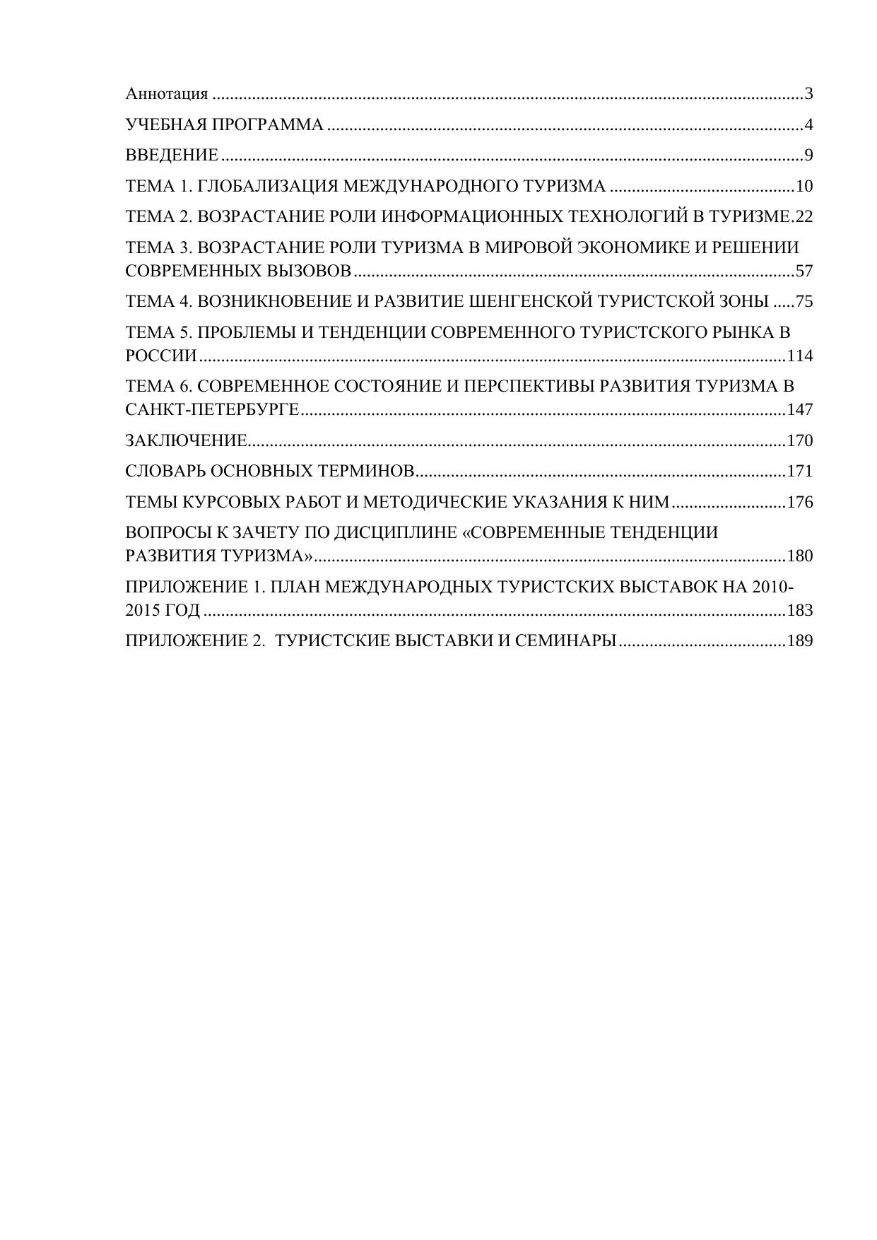 В пособии рассматриваются современные тенденции развития туризма в мире, Европе, России и Санкт-Петербурге. Первый раздел посвящен анализу тенденций развития туризма в мире, в частности, в данном разделе выделяются такие тенденции развития туризма как глобализация, возрастание роли информационных технологий в туризме и возрастание роли туризма в экономике, а также решении современных вызовов. Во втором разделе анализируются тенденции развития туризма в Европе, в частности, раскрывается история возникновения Шенгенской зоны и ее современные проблемы. В третьем разделе показаны тенденции развития туризма в России, в частности, возникновение туристского рынка, развитие делового и конгрессно-выставочного туризма, анализируются тенденции российского туристского законодательства. В четвертом разделе дается анализ тенденций развития туризма в Санкт-Петербурге, особенно сделан упор на выполнение Программы развития туризма на 2005-2010 годы, а также возможность превращения города в морскую столицу страны. Электронное учебное пособие