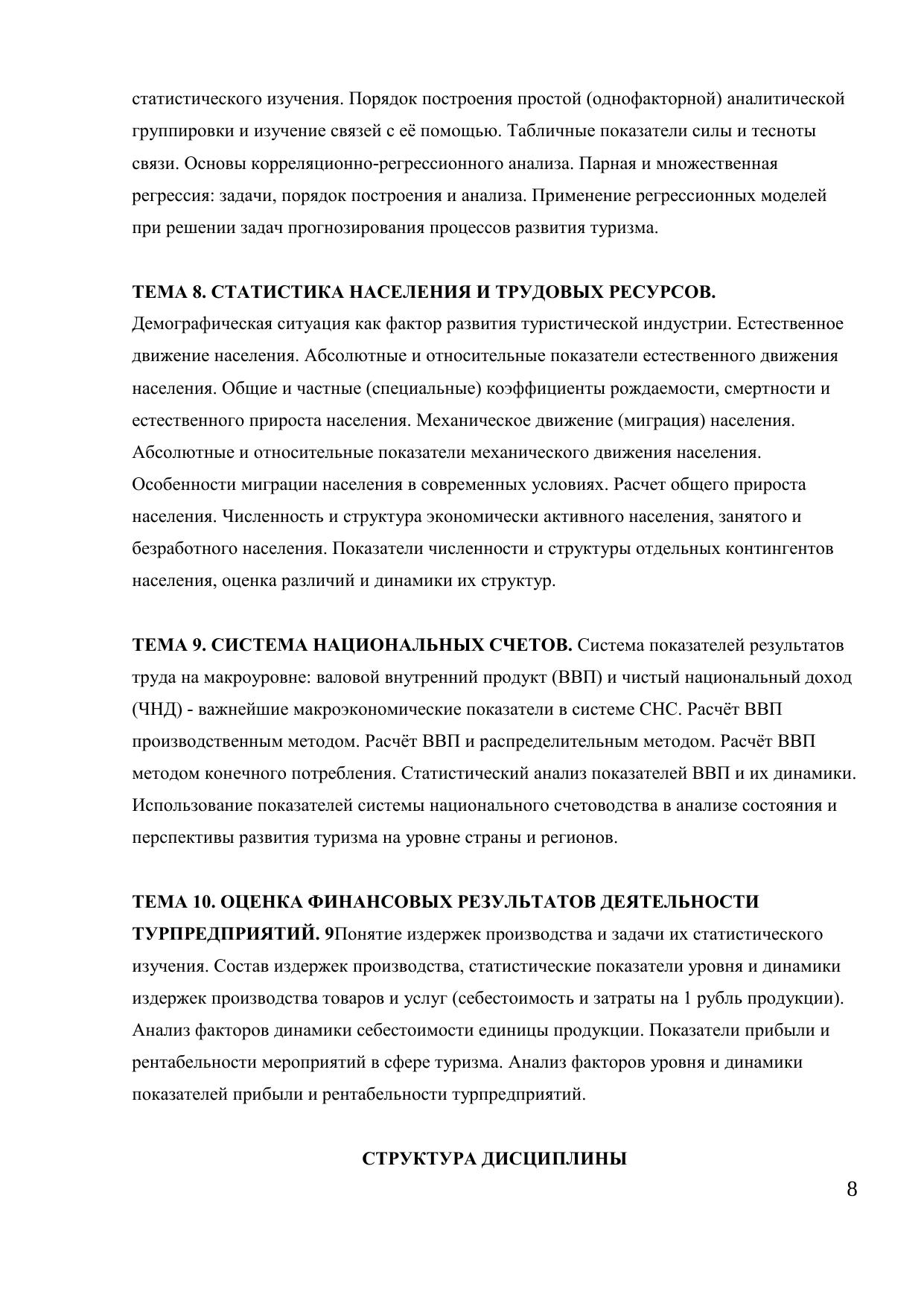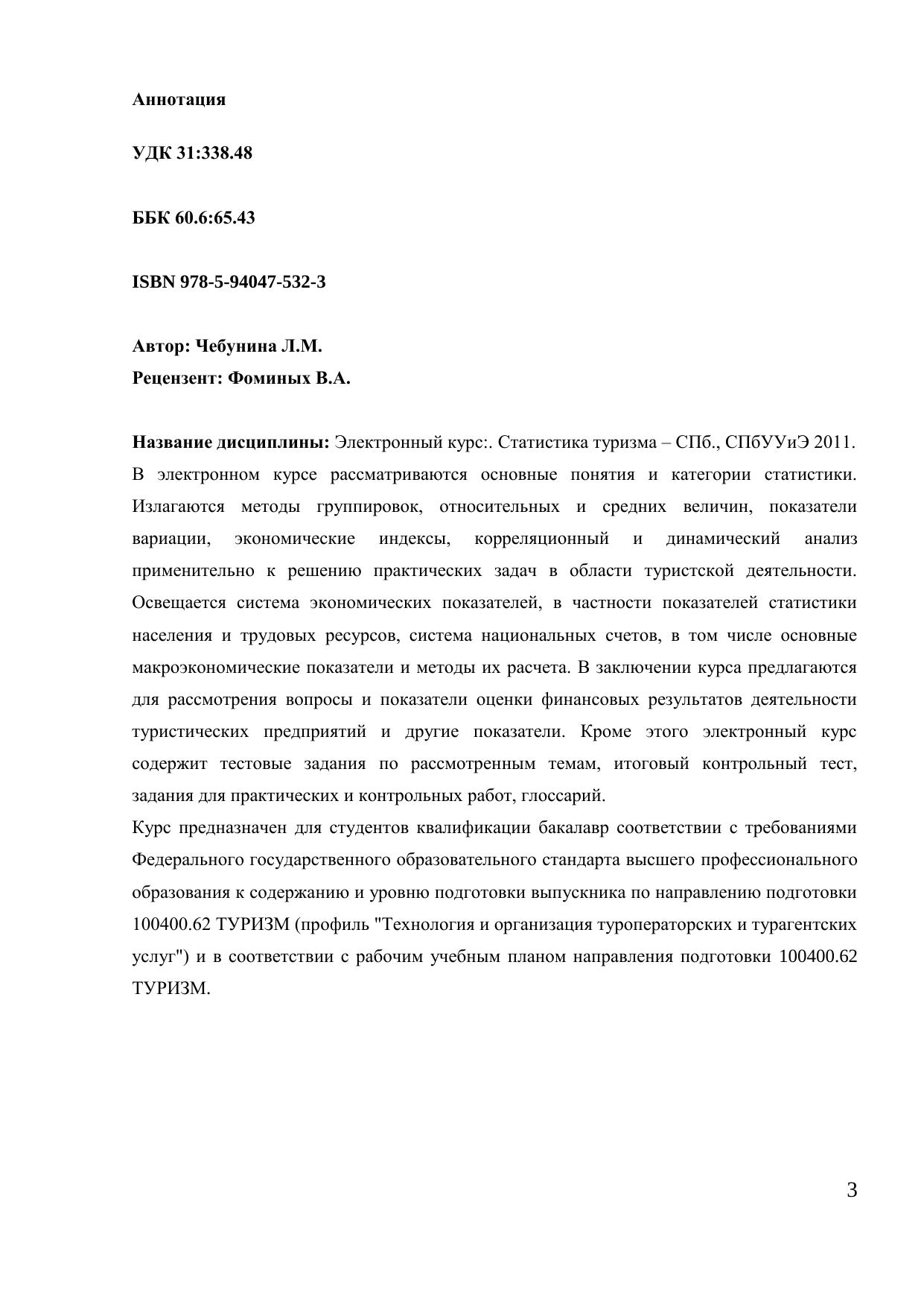 Название дисциплины: Электронный курс: Статистика туризма – СПб., СПбУУиЭ 2011. В электронном курсе рассматриваются основные понятия и категории статистики. Излагаются методы группировок, относительных и средних величин, показатели вариации, экономические индексы, корреляционный и динамический анализ применительно к решению практических задач в области туристской деятельности. Освещается система экономических показателей, в частности показателей статистики населения и трудовых ресурсов, система национальных счетов, в том числе основные макроэкономические показатели и методы их расчета. В заключении курса предлагаются для рассмотрения вопросы и показатели оценки финансовых результатов деятельности туристических предприятий и другие показатели. Кроме этого электронный курс содержит тестовые задания по рассмотренным темам, итоговый контрольный тест, задания для практических и контрольных работ, глоссарий. Курс предназначен для студентов квалификации бакалавр соответствии с требованиями Федерального государственного образовательного стандарта высшего профессионального образования к содержанию и уровню подготовки выпускника по направлению подготовки 100400.62 ТУРИЗМ (профиль "Технология и организация туроператорских и турагентских услуг") и в соответствии с рабочим учебным планом направления подготовки 100400.62 ТУРИЗМ.