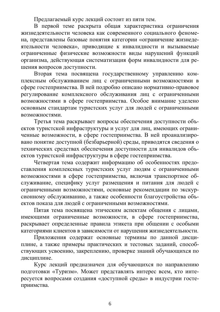 Учебное пособие содержит теоретические основы комплексного обслуживания лиц с ограниченными возможностями в сфере гостеприимства. Раскрывает общую характеристику феномена ограничения жизнедеятельности человека, сущность государственного регулирования комплексного обслуживания лиц с ограниченными возможностями в сфере гостеприимства, требования к обеспечению доступности объектов туристской инфраструктуры и предоставлению комплексных туристских услуг лицам с ограниченными возможностями в индустрии туризма. Предназначено для обучающихся по направлению подготовки «Туризм», преподавателей и практических работников индустрии туризма.