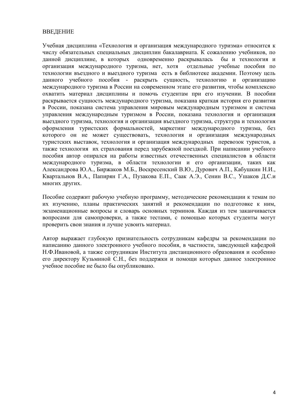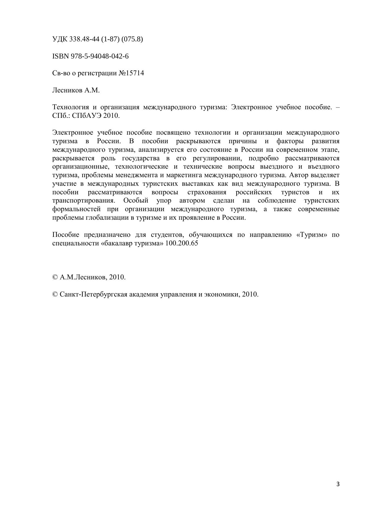 Электронное учебное пособие посвящено технологии и организации международного туризма в России. В пособии раскрываются причины и факторы развития международного туризма, анализируется его состояние в России на современном этапе, раскрывается роль государства в его регулировании, подробно рассматриваются организационные, технологические и технические вопросы выездного и въездного туризма, проблемы менеджмента и маркетинга международного туризма. Автор выделяет участие в международных туристских выставках как вид международного туризма. В пособии рассматриваются вопросы страхования российских туристов и их транспортирования. Особый упор автором сделан на соблюдение туристских формальностей при организации международного туризма, а также современные проблемы глобализации в туризме и их проявление в России. Пособие предназначено для студентов, обучающихся по направлению «Туризм» по специальности «бакалавр туризма» 100.200.65