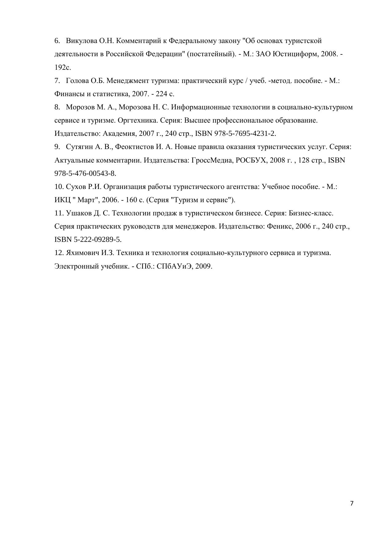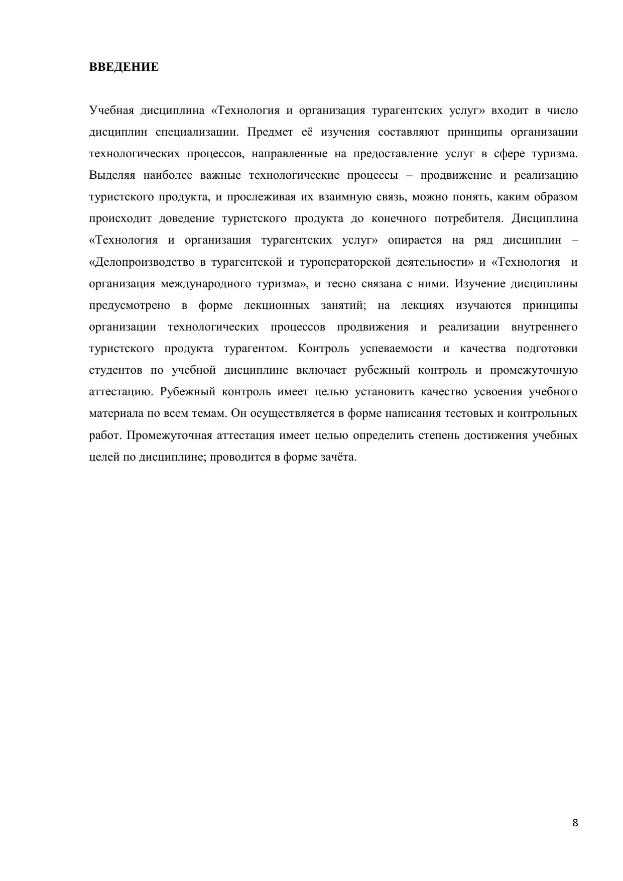 Пособие включает учебную программу дисциплины, методические указания по выполнению контрольной работы, тексты лекций, словарь терминов. Рассмотрены технологические принципы организации турагентских услуг по внутреннему туризму. Пособие написано на основании требований государственного стандарта высшего профессионального образования к содержанию и уровню подготовки выпускников по специальности «Туризм». Пособие предназначено для подготовки студентов высших учебных заведений по специальности «Социально-культурный сервис и туризм». Электронное учебное пособие