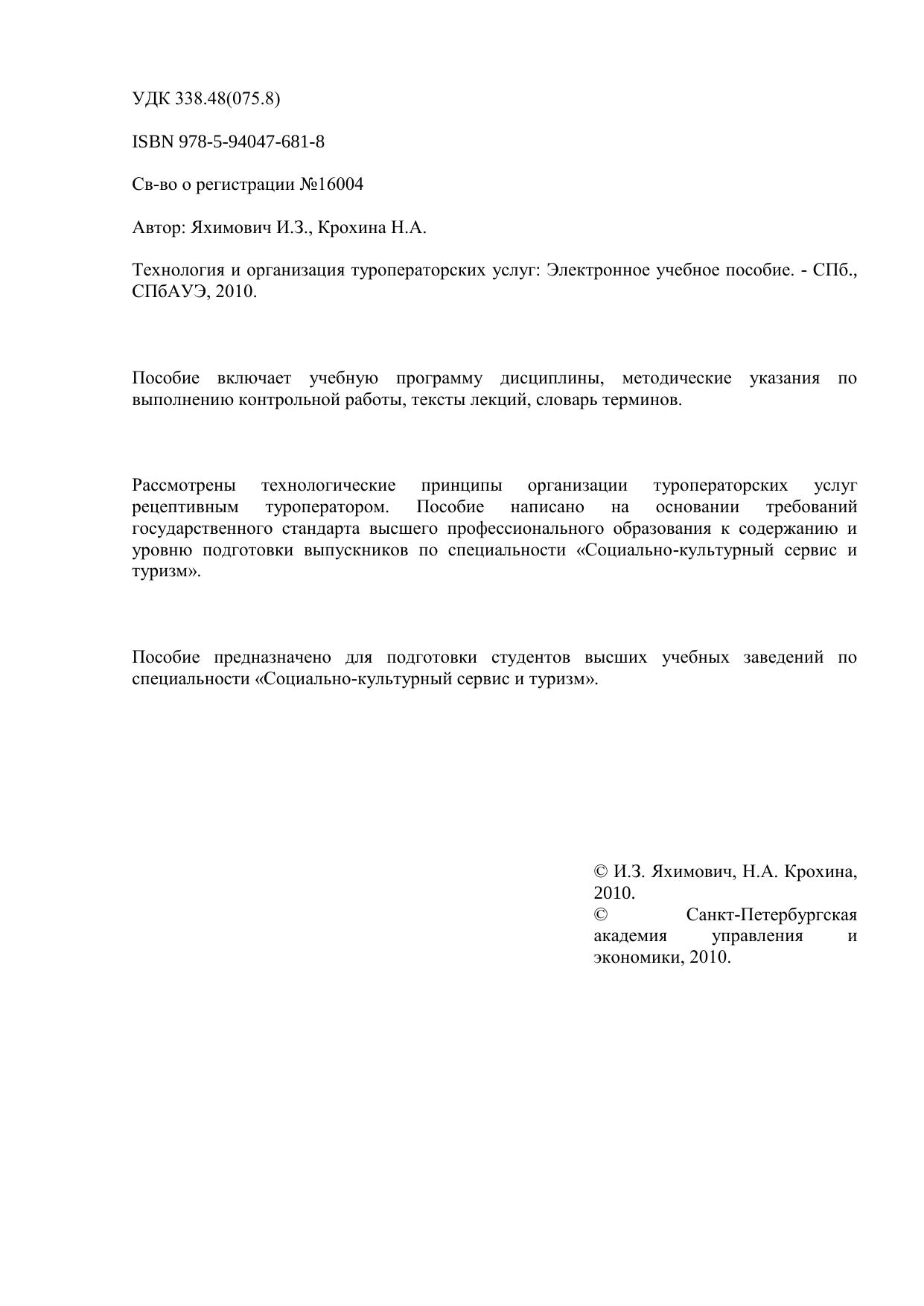 Пособие включает учебную программу дисциплины, методические указания по выполнению контрольной работы, тексты лекций, словарь терминов. Рассмотрены технологические принципы организации туроператорских услуг рецептивным туроператором. Пособие написано на основании требований государственного стандарта высшего профессионального образования к содержанию и уровню подготовки выпускников по специальности «Социально-культурный сервис и туризм». Пособие предназначено для подготовки студентов высших учебных заведений по специальности «Социально-культурный сервис и туризм». Электронное учебное пособие
