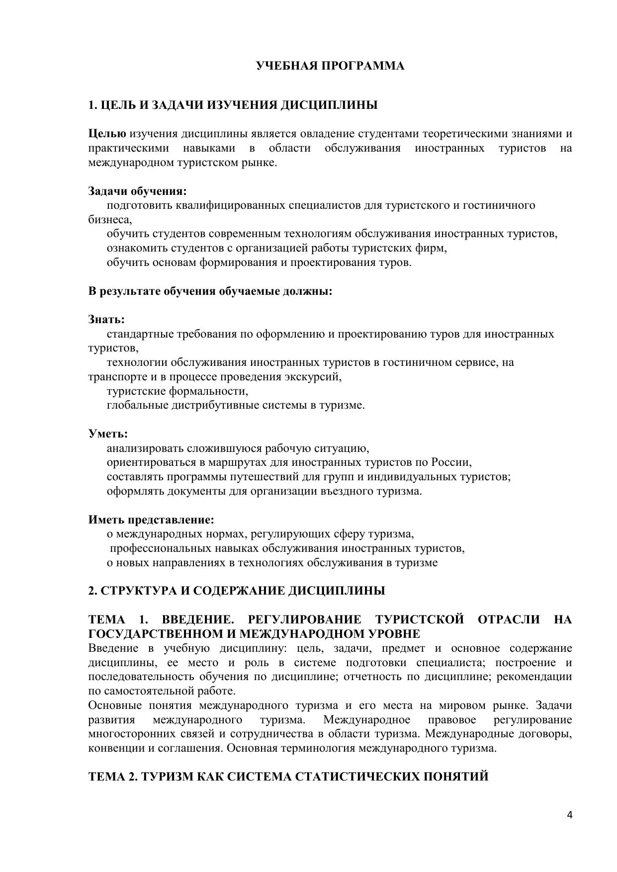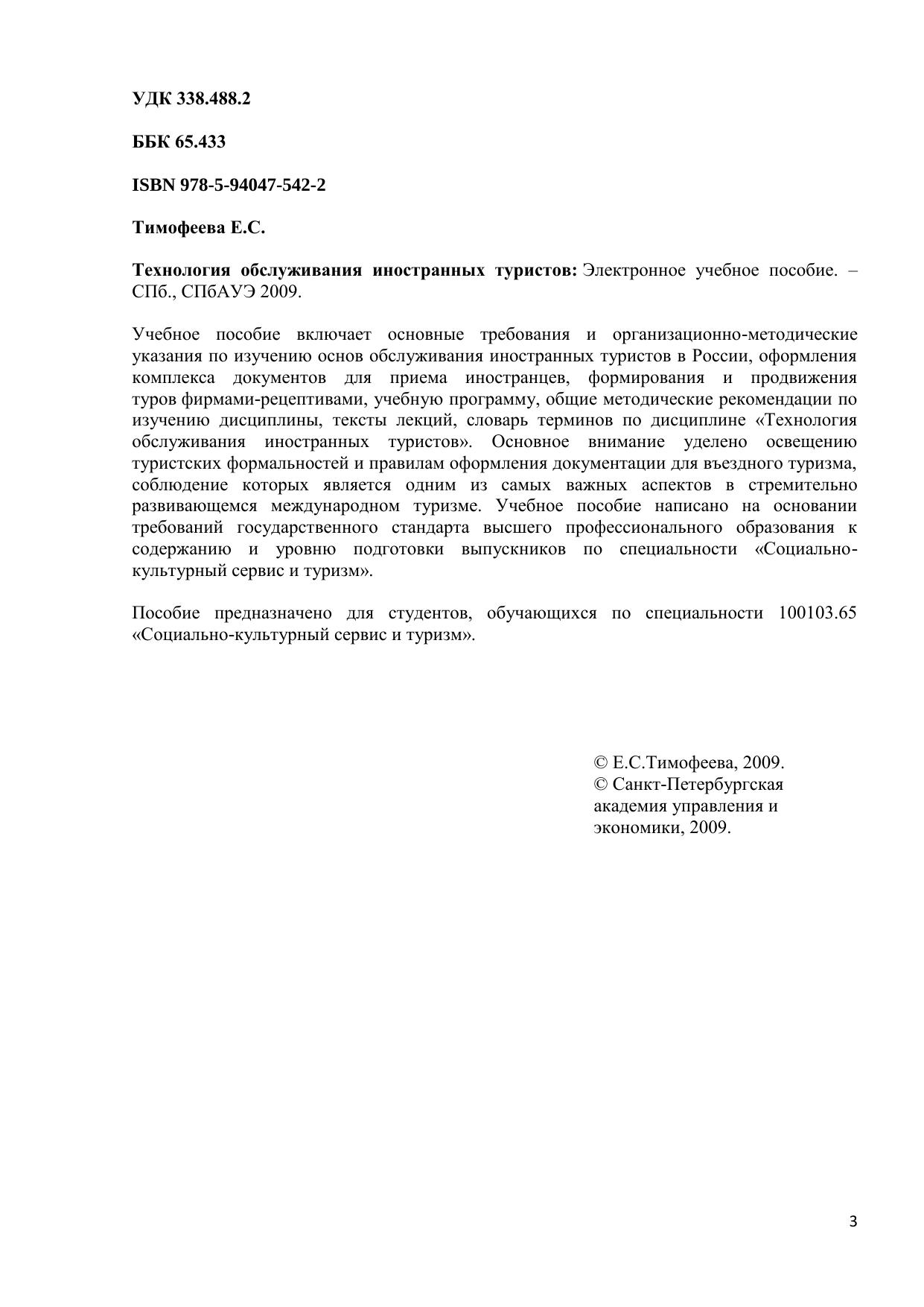 Учебное пособие включает основные требования и организационно-методические указания по изучению основ обслуживания иностранных туристов в России, оформления комплекса документов для приема иностранцев, формирования и продвижения туров фирмами-рецептивами, учебную программу, общие методические рекомендации по изучению дисциплины, тексты лекций, словарь терминов по дисциплине «Технология обслуживания иностранных туристов». Основное внимание уделено освещению туристских формальностей и правилам оформления документации для въездного туризма, соблюдение которых является одним из самых важных аспектов в стремительно развивающемся международном туризме. Учебное пособие написано на основании требований государственного стандарта высшего профессионального образования к содержанию и уровню подготовки выпускников по специальности «Социально-культурный сервис и туризм». Пособие предназначено для студентов, обучающихся по специальности 100103.65 «Социально-культурный сервис и туризм». Электронное учебное пособие для дистанционного обучения