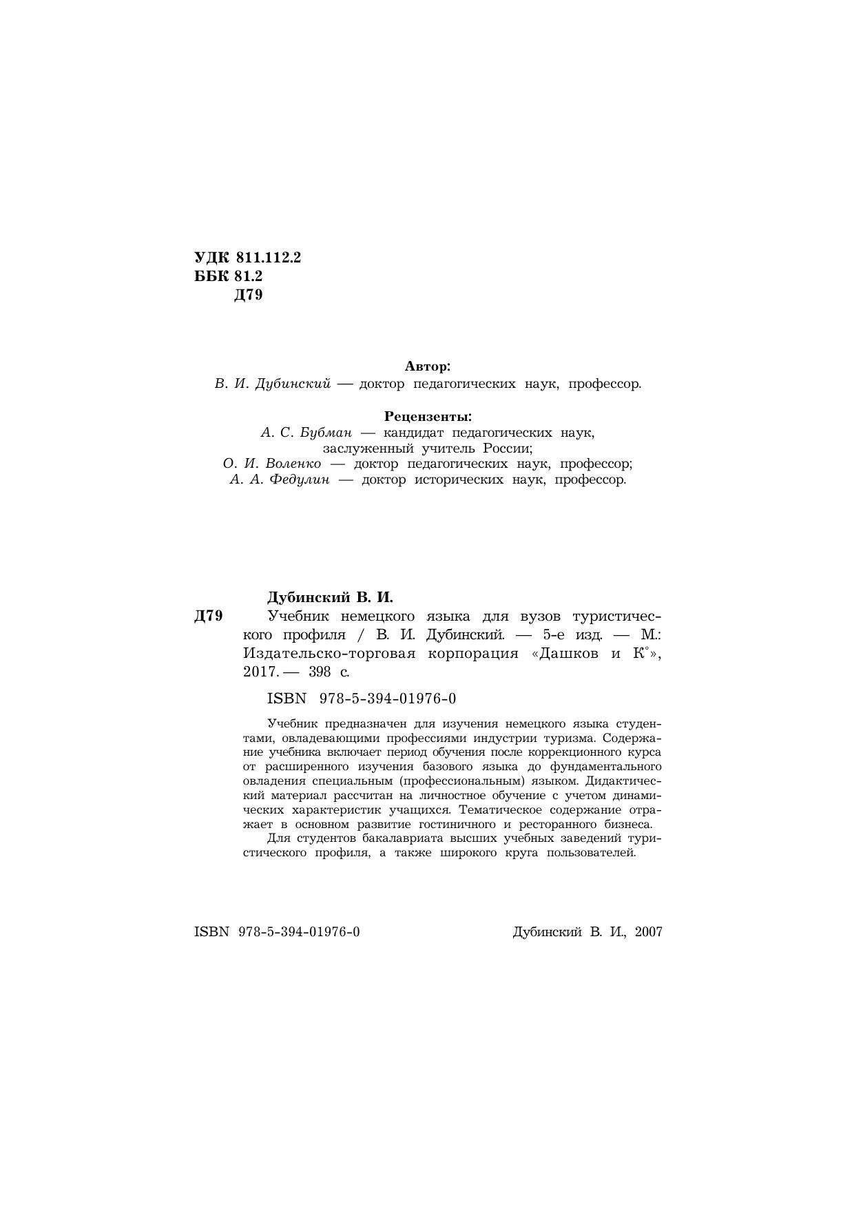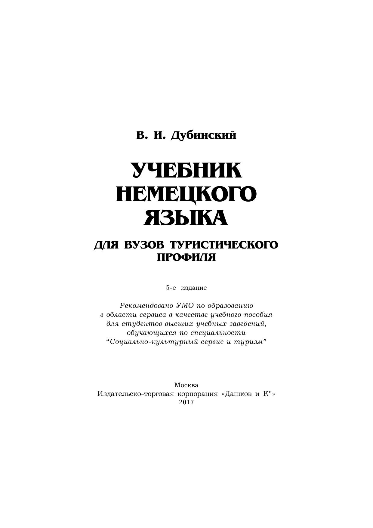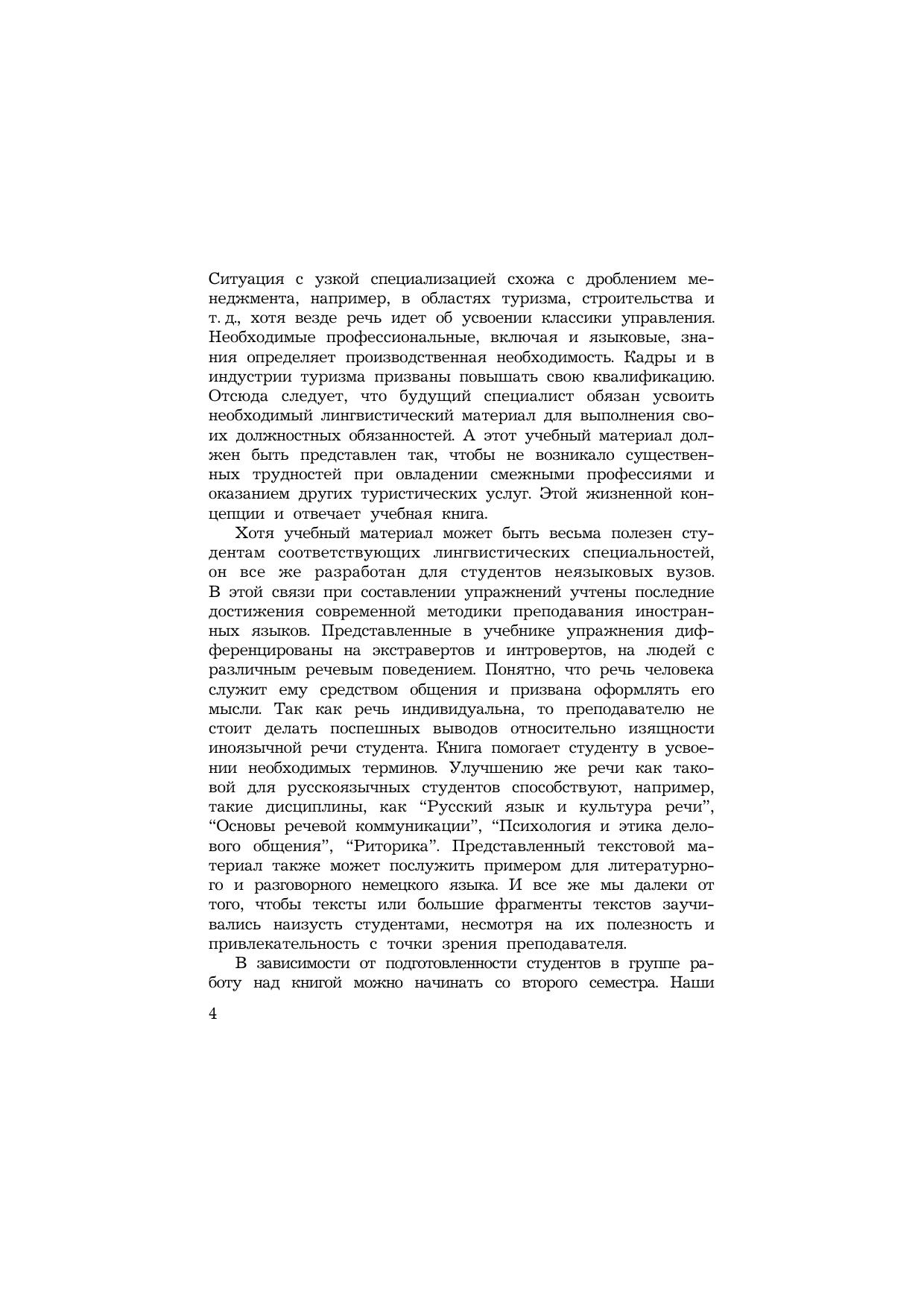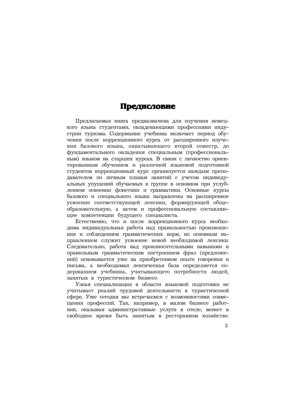 Учебник предназначен для изучения немецкого языка студентами, овладевающими профессиями индустрии туризма. Содержание учебника включает период обучения после коррекционного курса от расширенного изучения базового языка до фундаментального овладения специальным (профессиональным) языком. Дидактический материал рассчитан на личностное обучение с учетом динамических характеристик учащихся. Тематическое содержание отражает в основном развитие гостиничного и ресторанного бизнеса.