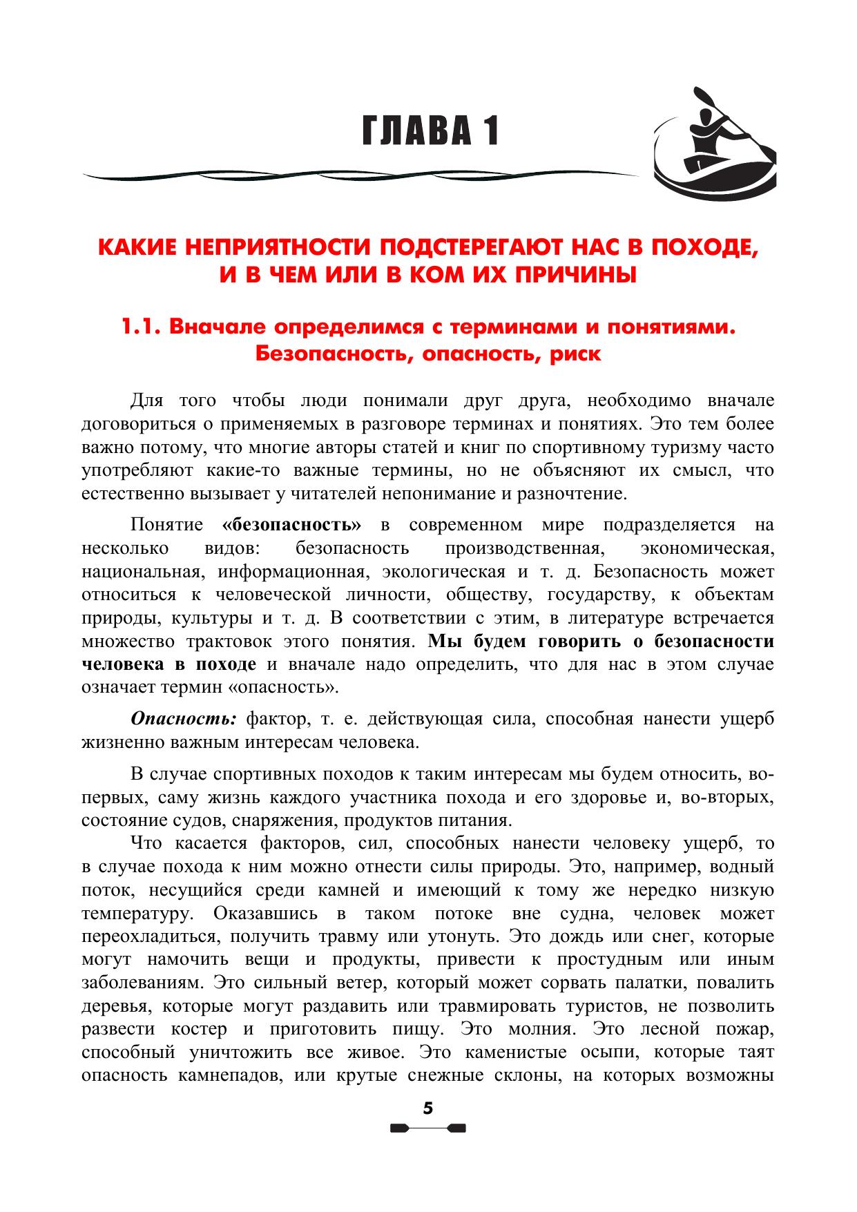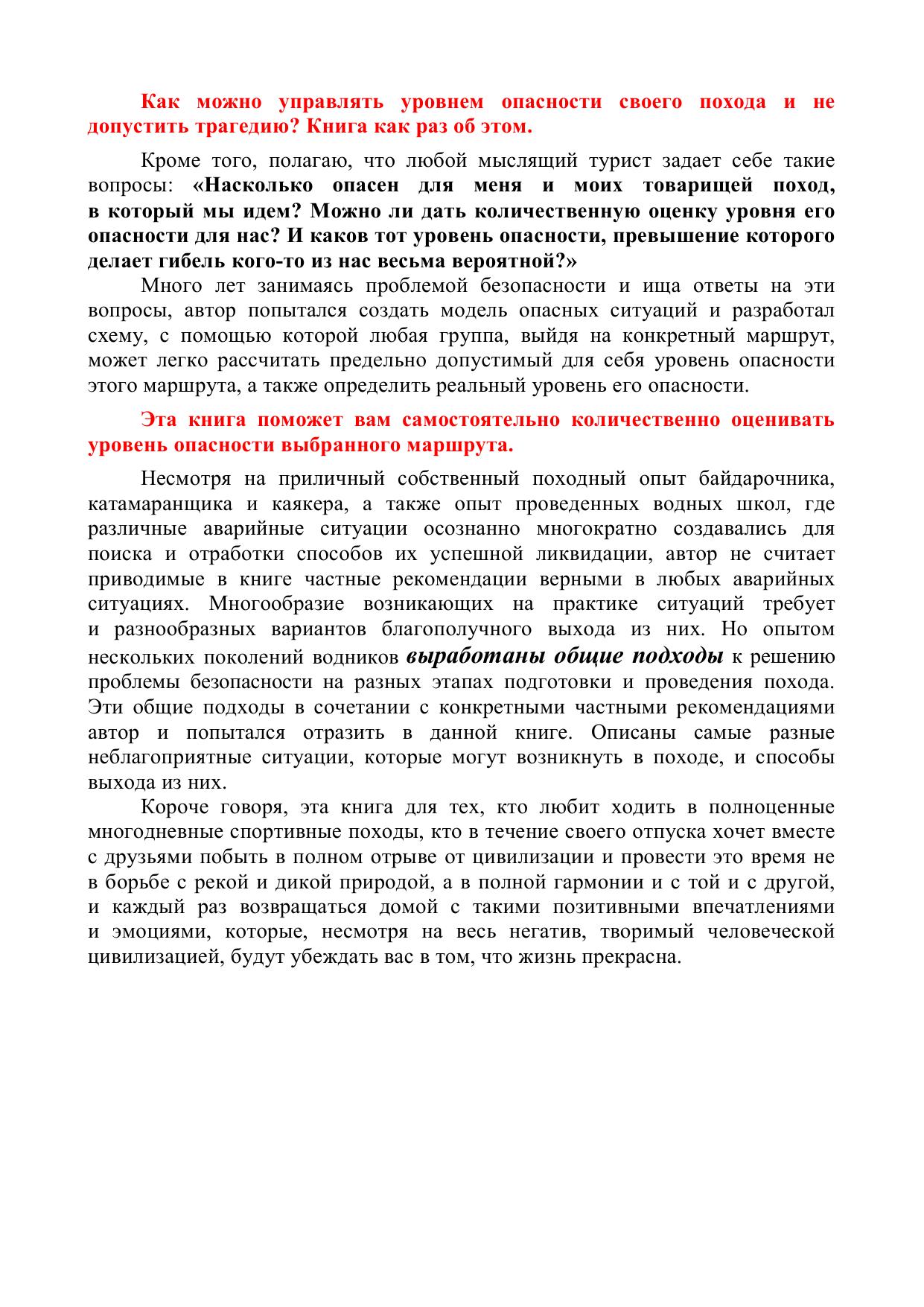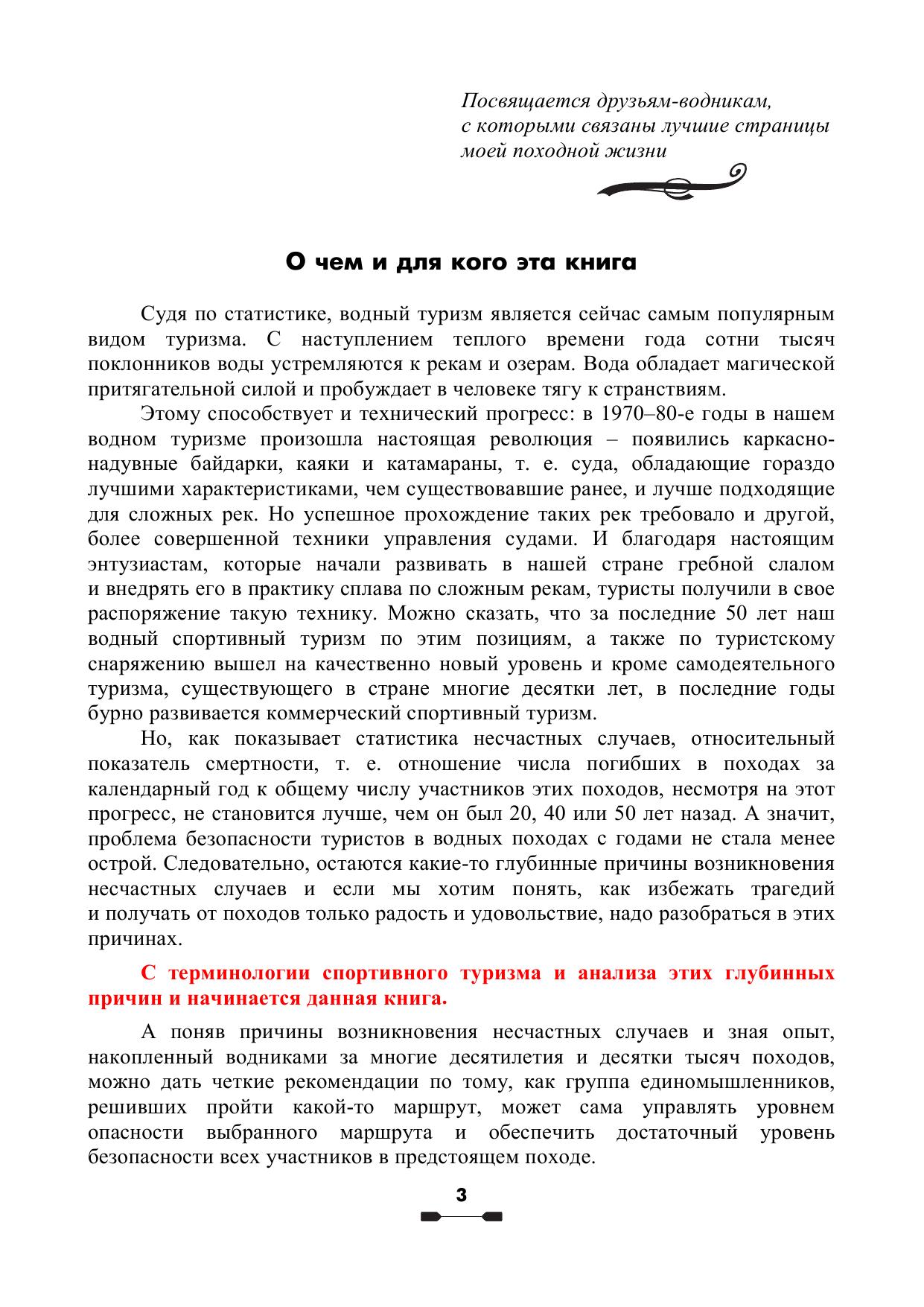 предотвратить несчастные случаи. На основе опыта нескольких поколений водников выработаны рекомендации по поводу того, как руководитель и члены спортивной группы сами могут влиять на уровень опасности предстоящего похода и количественно оценивать этот уровень во время похода. Данное дополненное издание включает в себя то качественно новое, что появилось в спортивном туризме за последние годы. Эта книга будет полезна всем, чья стихия – бурная вода: и тем, кто только начинает ходить в водные походы и хочет понять, как сделать их достаточно безопасными, и тем, кто уже хорошо знаком с этой стихией, но критически анализируя свои походы, понимает, что если некоторые опасные ситуации в пройденных походах закончились относительно благополучно, то это – лишь счастливая случайность, а не результат осознанных действий, умений и отработанных навыков, позволяющих уверенно ликвидировать такие ситуации. Это и учебное пособие для системы подготовки кадров спортивного туризма и профессиональных инструкторов-проводников.