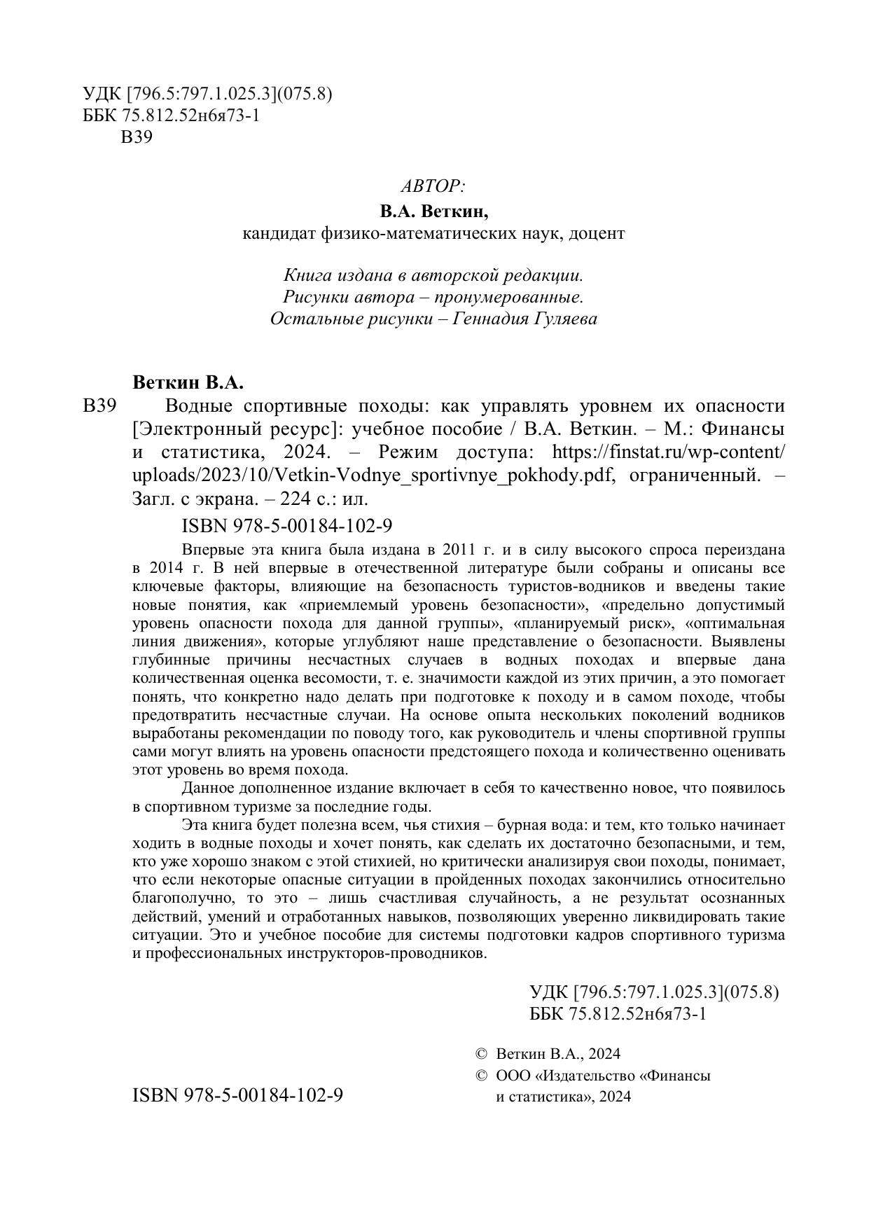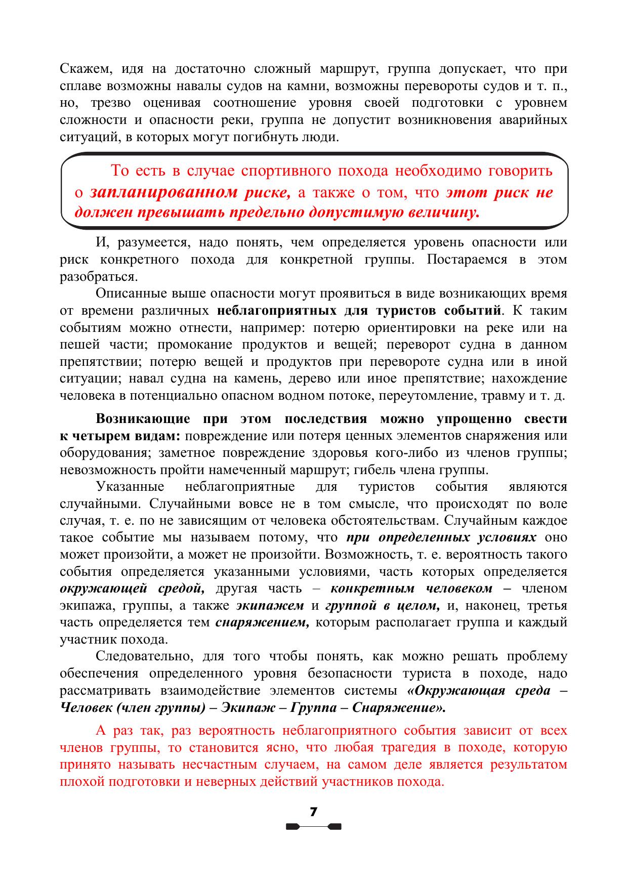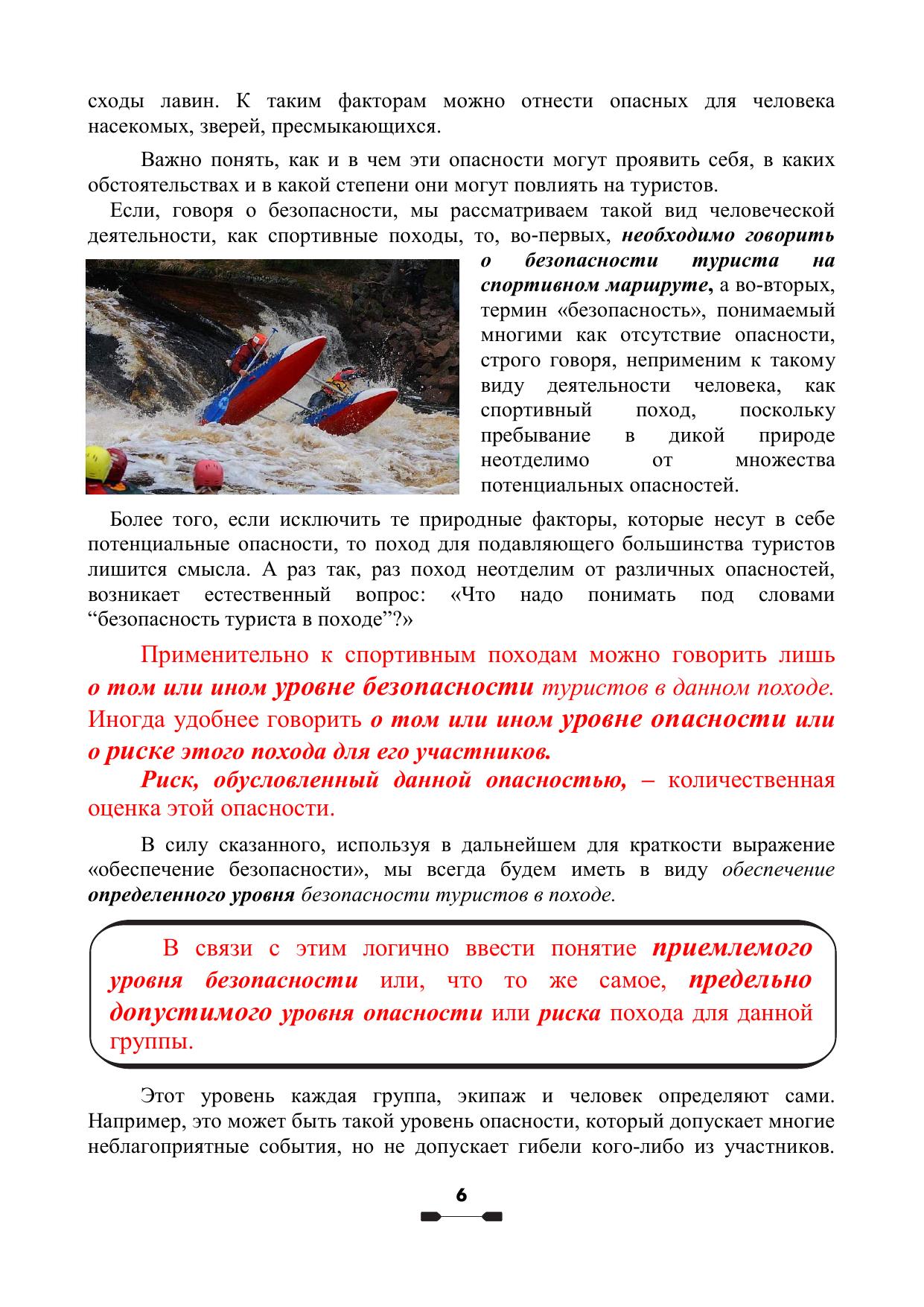 предотвратить несчастные случаи. На основе опыта нескольких поколений водников выработаны рекомендации по поводу того, как руководитель и члены спортивной группы сами могут влиять на уровень опасности предстоящего похода и количественно оценивать этот уровень во время похода. Данное дополненное издание включает в себя то качественно новое, что появилось в спортивном туризме за последние годы. Эта книга будет полезна всем, чья стихия – бурная вода: и тем, кто только начинает ходить в водные походы и хочет понять, как сделать их достаточно безопасными, и тем, кто уже хорошо знаком с этой стихией, но критически анализируя свои походы, понимает, что если некоторые опасные ситуации в пройденных походах закончились относительно благополучно, то это – лишь счастливая случайность, а не результат осознанных действий, умений и отработанных навыков, позволяющих уверенно ликвидировать такие ситуации. Это и учебное пособие для системы подготовки кадров спортивного туризма и профессиональных инструкторов-проводников.