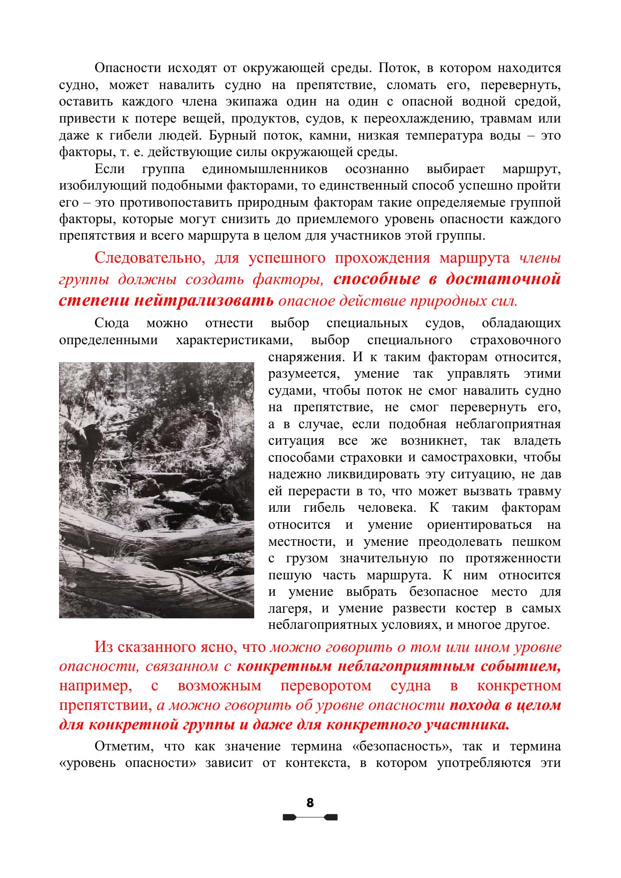 Впервые эта книга была издана в 2011 г. и в силу высокого спроса переиздана в 2014 г. В ней впервые в отечественной литературе были собраны и описаны все ключевые факторы, влияющие на безопасность туристов-водников и введены такие новые понятия, как «приемлемый уровень безопасности», «предельно допустимый уровень опасности похода для данной группы», «планируемый риск», «оптимальная линия движения», которые углубляют наше представление о безопасности. Выявлены