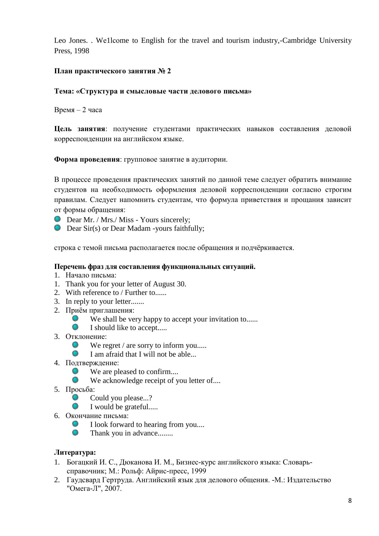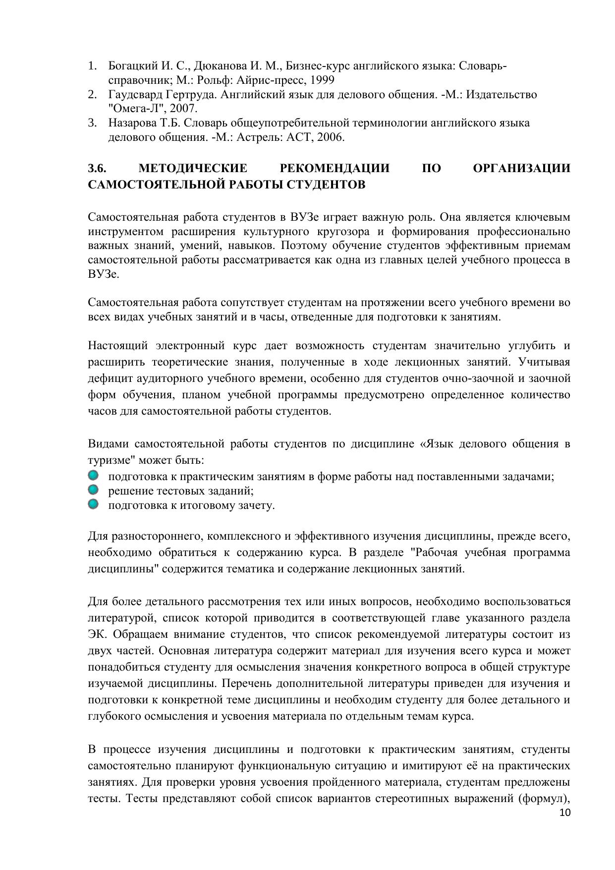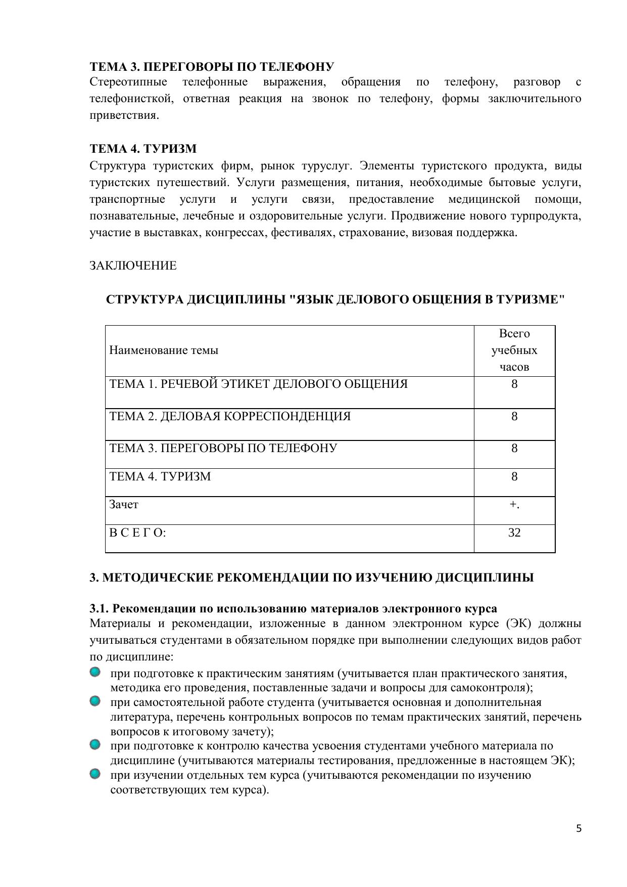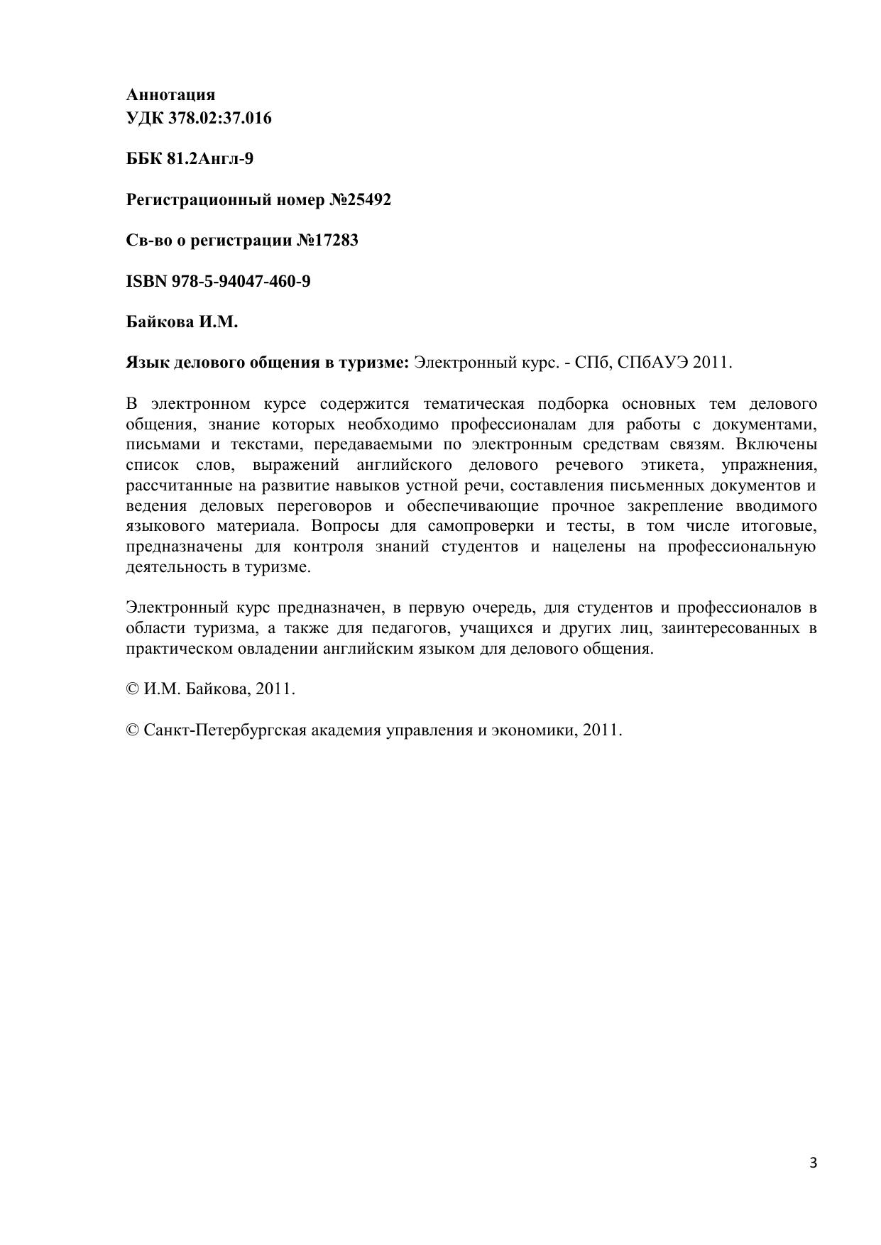 В электронном курсе содержится тематическая подборка основных тем делового общения, знание которых необходимо профессионалам для работы с документами, письмами и текстами, передаваемыми по электронным средствам связям. Включены список слов, выражений английского делового речевого этикета, упражнения, рассчитанные на развитие навыков устной речи, составления письменных документов и ведения деловых переговоров и обеспечивающие прочное закрепление вводимого языкового материала. Вопросы для самопроверки и тесты, в том числе итоговые, предназначены для контроля знаний студентов и нацелены на профессиональную деятельность в туризме. Электронный курс предназначен, в первую очередь, для студентов и профессионалов в области туризма, а также для педагогов, учащихся и других лиц, заинтересованных в практическом овладении английским языком для делового общения.