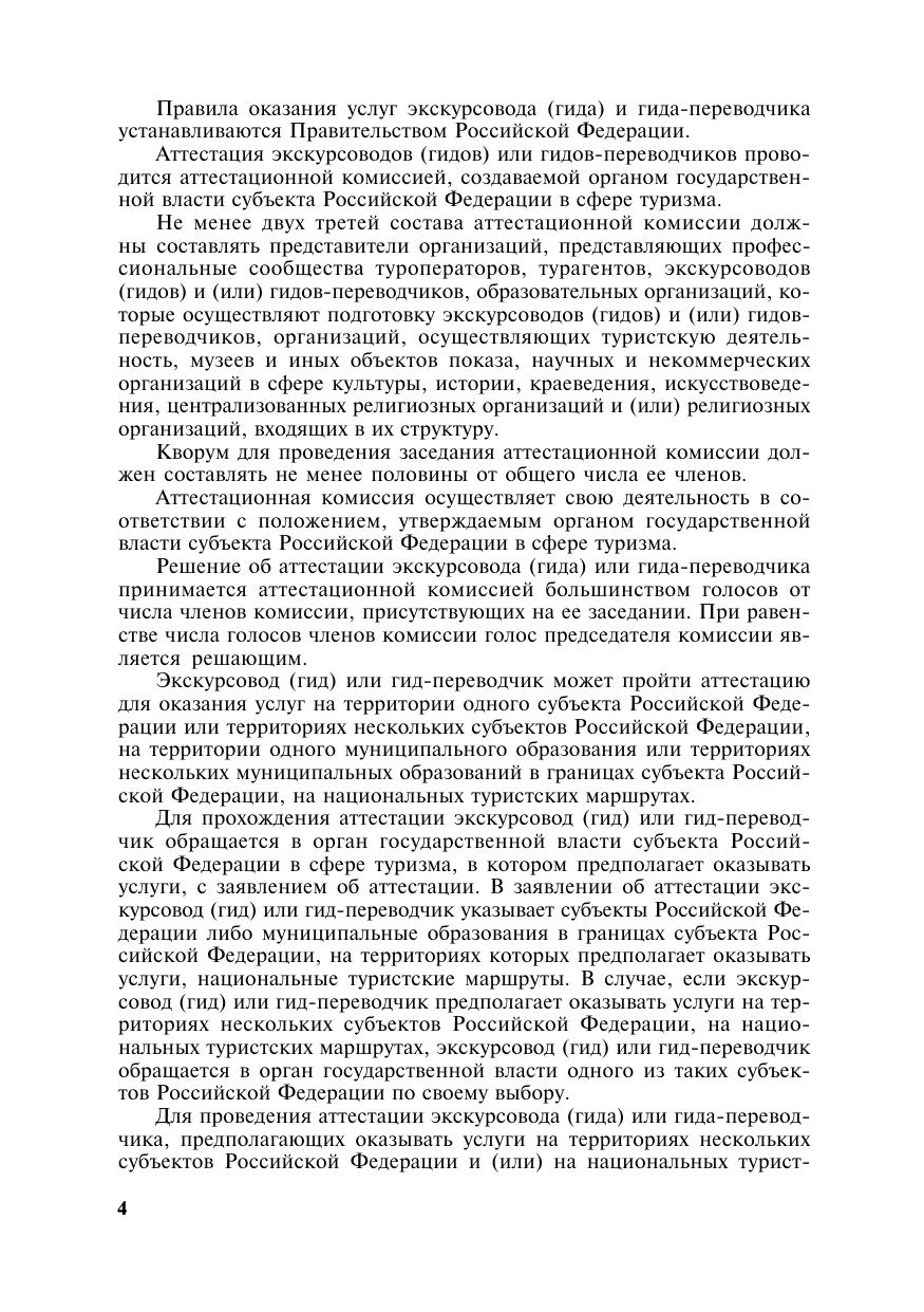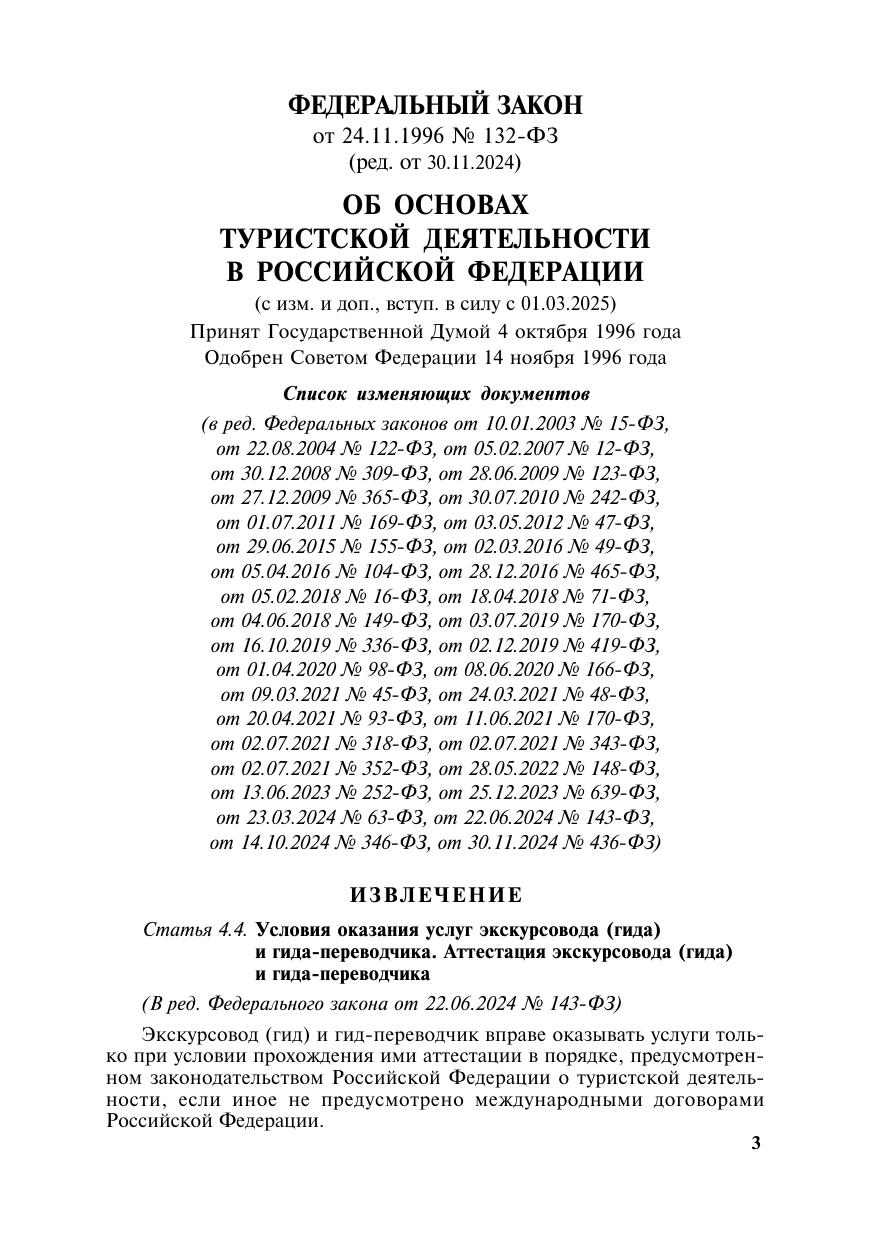 В книге представлены извлечение из Федерального закона «Об основах туристской деятельности» в последней редакции, Постановление Правительства РФ от 7 мая 2022 г. № 833 об утверждении положения об аттестации экскурсоводов (гидов) и гидов-переводчиков, Постановление Правительства РФ от 31 мая 2022 г. № 992 о правилах оказания услуг экскурсоводом (гидом) и гидом-переводчиком, Постановление Правительства РФ от 1 июня 2022 г. № 1003 об утверждении положения об аттестации инструкторов-проводников, Постановление Правительства РФ от 30 мая 2024 г. № 710 о правилах формирования и ведения единого федерального реестра инструкторов-проводников, Постановления Правительства РФ от 1 июня 2024 г. № 760 и 761 об уведомлениях о сопровождении туристов (экскурсантов) на туристском маршруте и о правилах оказания услуг инструктором-проводником, постановление Правительства РФ от 29 июня 2024 г. № 891 о методике определения платы за проведение аттестации инструкторов-проводников и ряд других документов, в которых приведены виды туристских маршрутов, категории их сложности.