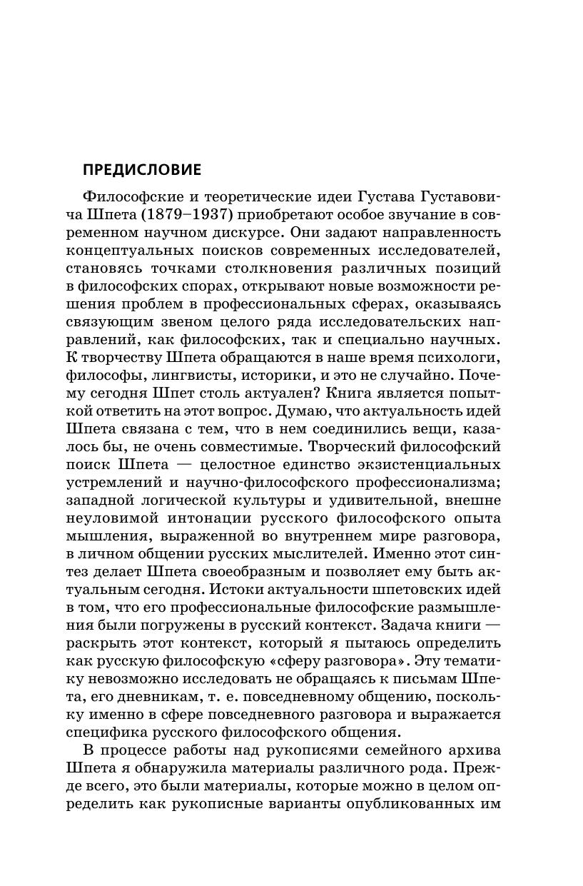 Автор воссоздает интерсубъективное пространство коммуникации ("сферу разговора") русских философов, включая мысль Г.Г. Шпета в широкий контекст философских идей его европейских и русских собеседников (Эд. Гуссерля, О. Шпенглера, Л. Шестова, М. Гершензона, Р. Якобсона и др.). Диалогический подход к научно-философскому идейному наследию Густава Шпета позволяет актуализировать проблематику его философско-методологического проекта.