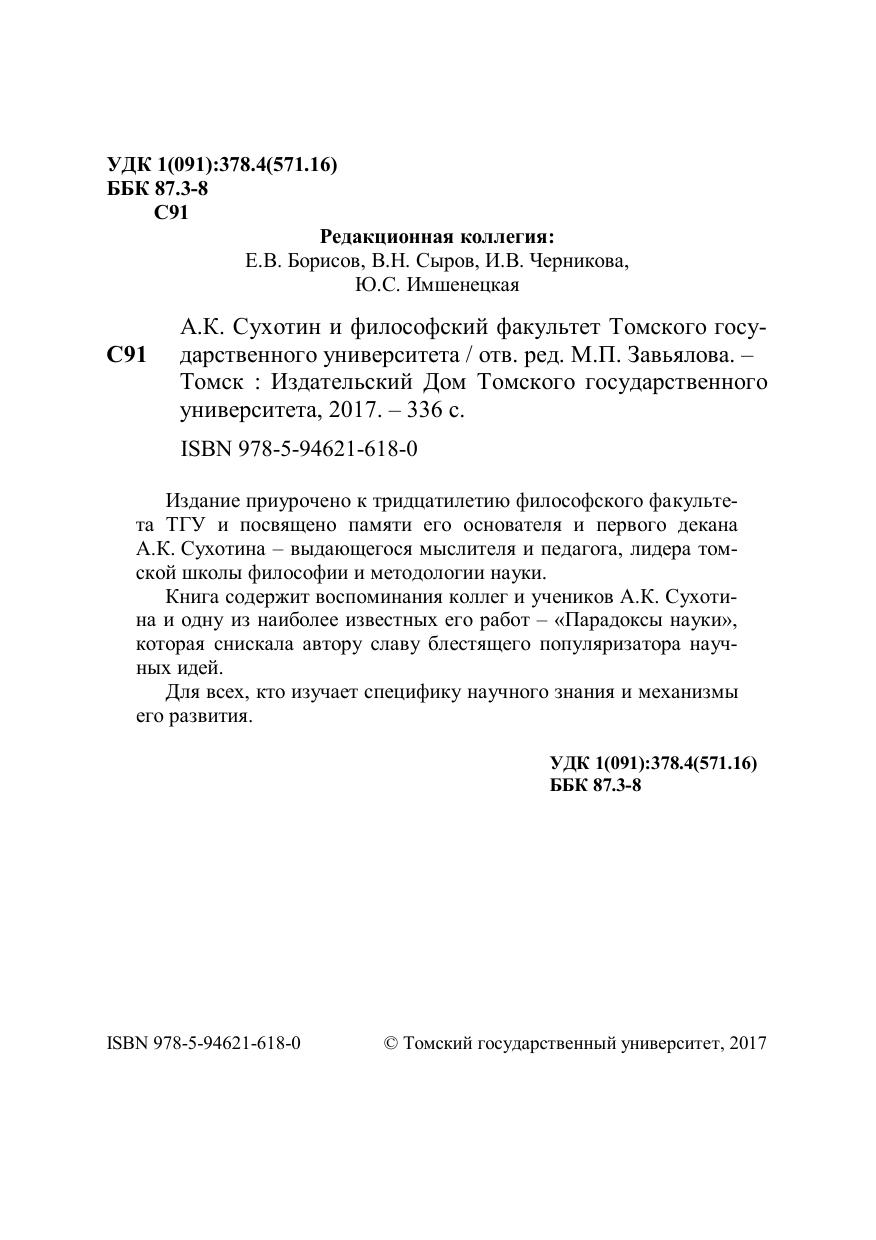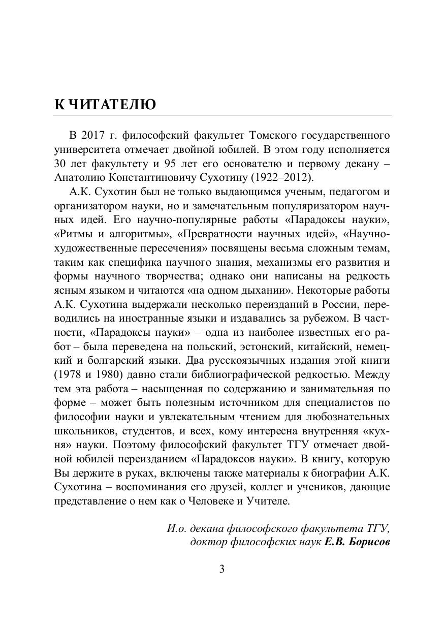 Издание приурочено к тридцатилетию философского факультета ТГУ и посвящено памяти его основателя и первого декана А.К. Сухотина – выдающегося мыслителя и педагога, лидера томской школы философии и методологии науки. Книга содержит воспоминания коллег и учеников А.К. Сухотина и одну из наиболее известных его работ – «Парадоксы науки», которая снискала автору славу блестящего популяризатора научных идей. Для всех, кто изучает специфику научного знания и механизмы его развития.
