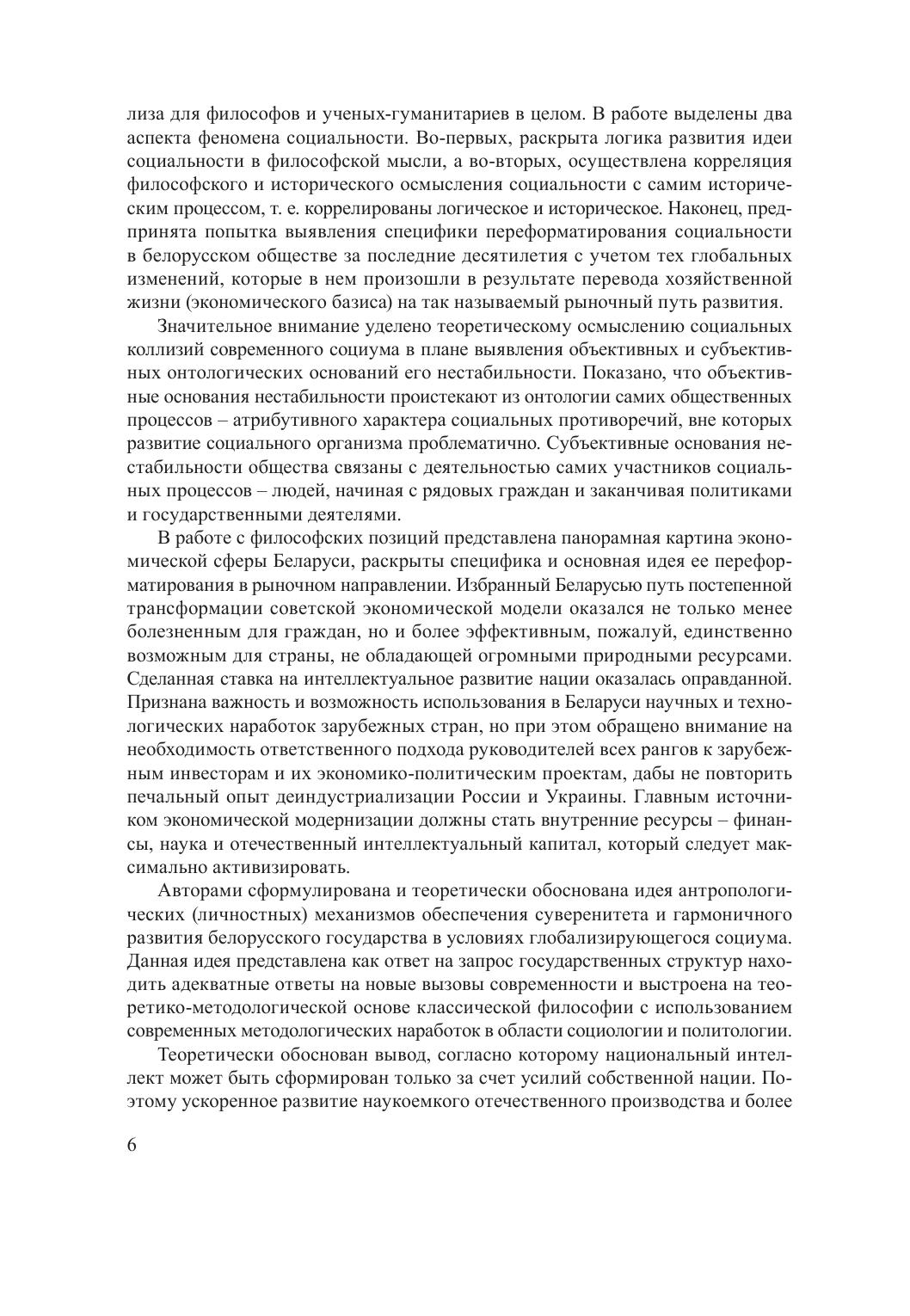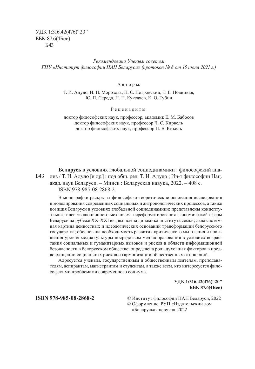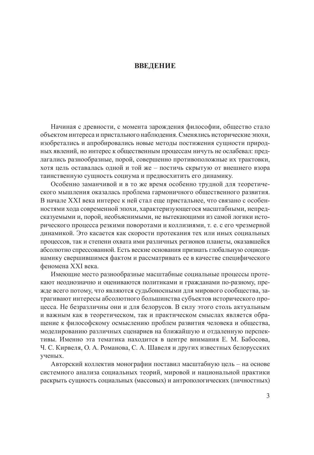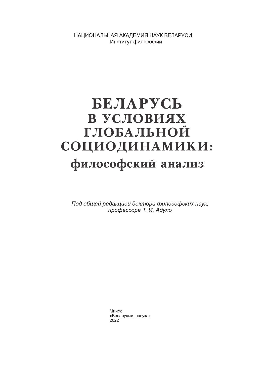 В монографии раскрыты философско-теоретические основания исследования и моделирования современных социальных и антропологических процессов, а также позиция Беларуси в условиях глобальной социодинамики: представлены концептуальные идеи эволюционного механизма переформатирования экономической сферы Беларуси на рубеже ХХ–ХХI вв.; выявлена динамика института семьи; дана системная картина ценностных и идеологических оснований трансформаций белорусского государства; обоснована необходимость развития критического мышления и повышения уровня медиакультуры посредством медиаобразования в условиях возрастания социальных и гуманитарных вызовов и рисков в области информационной безопасности в белорусском обществе; определена роль духовных факторов в предвосхищении социальных рисков и гармонизации общественных отношений.
