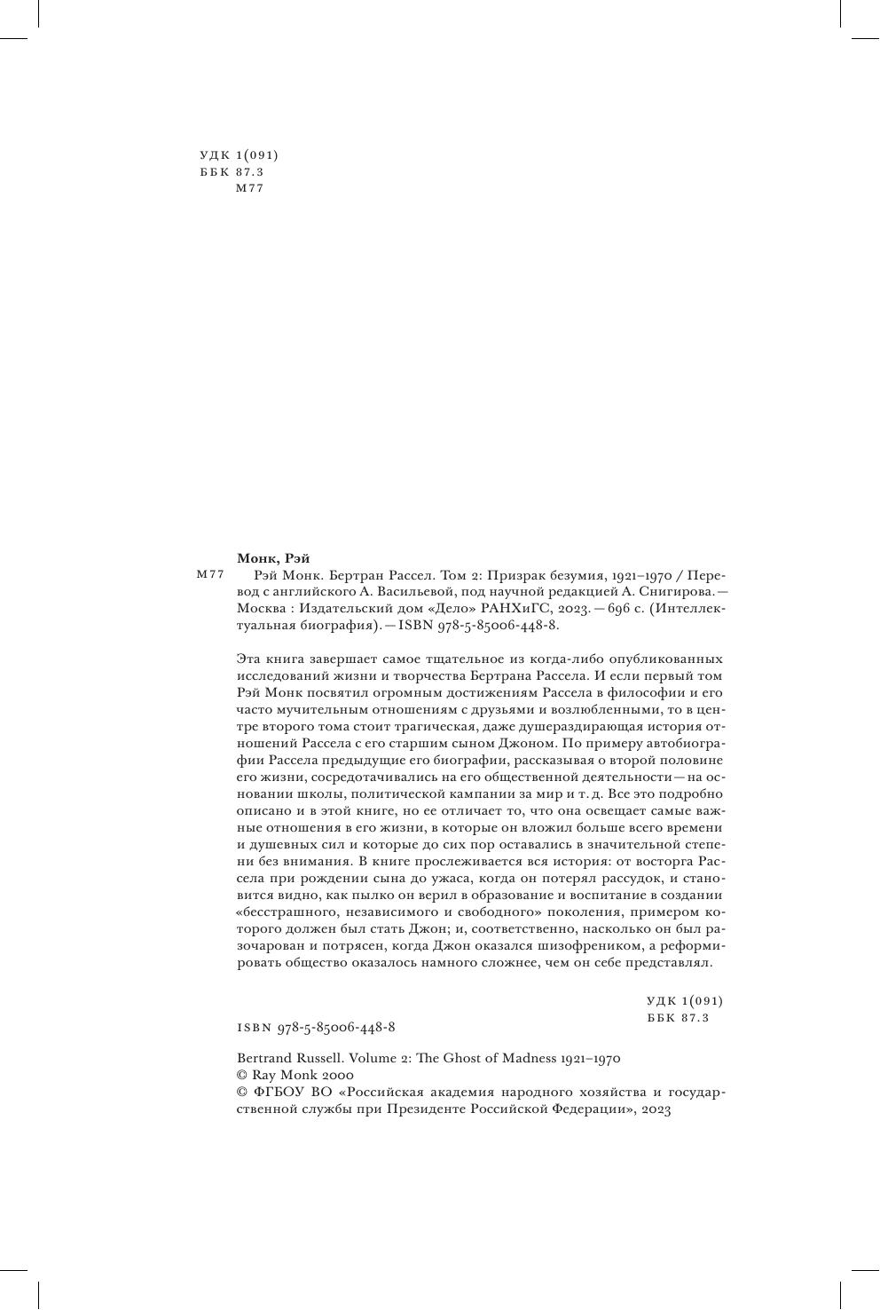 Эта книга завершает самое тщательное из когда-либо опубликованных исследований жизни и творчества Бертрана Рассела. И если первый том Рэй Монк посвятил огромным достижениям Рассела в философии и его часто мучительным отношениям с друзьями и возлюбленными, то в центре второго тома стоит трагическая, даже душераздирающая история отношений Рассела с его старшим сыном Джоном. По примеру автобиографии Рассела предыдущие его биографии, рассказывая о второй половине его жизни, сосредотачивались на его общественной деятельности — на основании школы, политической кампании за мир и т. д. Все это подробно описано и в этой книге, но ее отличает то, что она освещает самые важные отношения в его жизни, в которые он вложил больше всего времени и душевных сил и которые до сих пор оставались в значительной степени без внимания. В книге прослеживается вся история: от восторга Рассела при рождении сына до ужаса, когда он потерял рассудок, и становится видно, как пылко он верил в образование и воспитание в создании «бесстрашного, независимого и свободного» поколения, примером которого должен был стать Джон; и, соответственно, насколько он был разочарован и потрясен, когда Джон оказался шизофреником, а реформировать общество оказалось намного сложнее, чем он себе представлял.