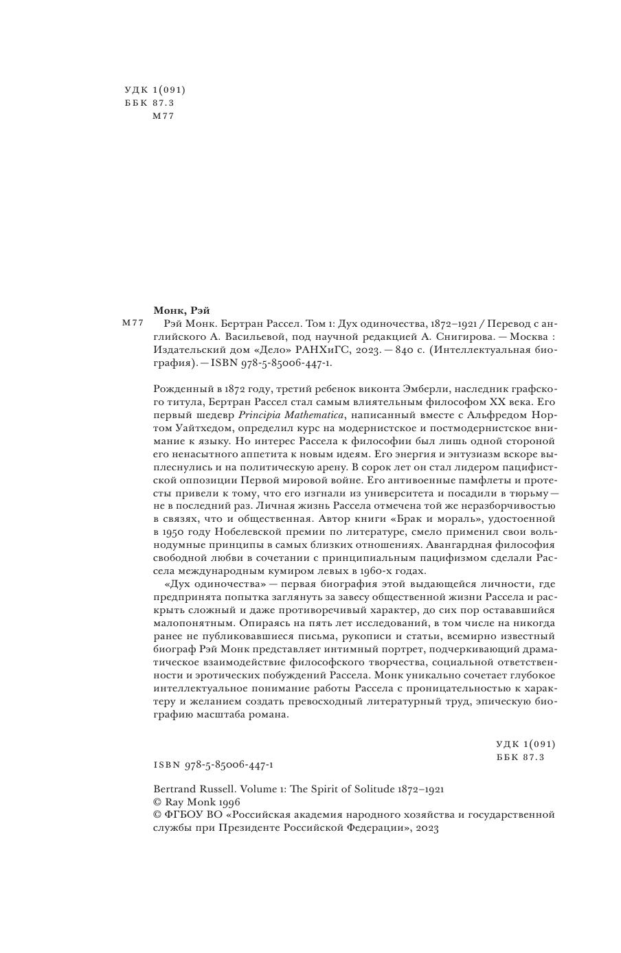 «Дух одиночества» — первая биография этой выдающейся личности, где предпринята попытка заглянуть за завесу общественной жизни Рассела и рас-крыть сложный и даже противоречивый характер, до сих пор остававшийся малопонятным. Опираясь на пять лет исследований, в том числе на никогда ранее не публиковавшиеся письма, рукописи и статьи, всемирно известный биограф Рэй Монк представляет интимный портрет, подчеркивающий драматическое взаимодействие философского творчества, социальной ответственности и эротических побуждений Рассела. Монк уникально сочетает глубокое интеллектуальное понимание работы Рассела с проницательностью к характеру и желанием создать превосходный литературный труд, эпическую биографию масштаба романа.