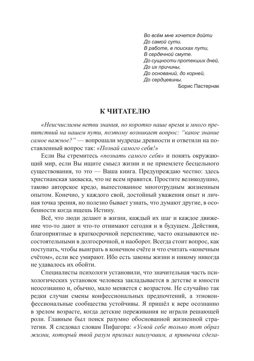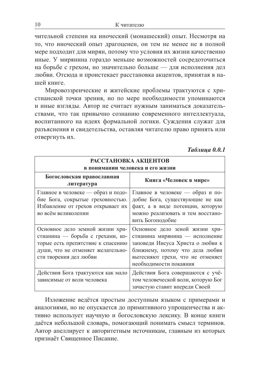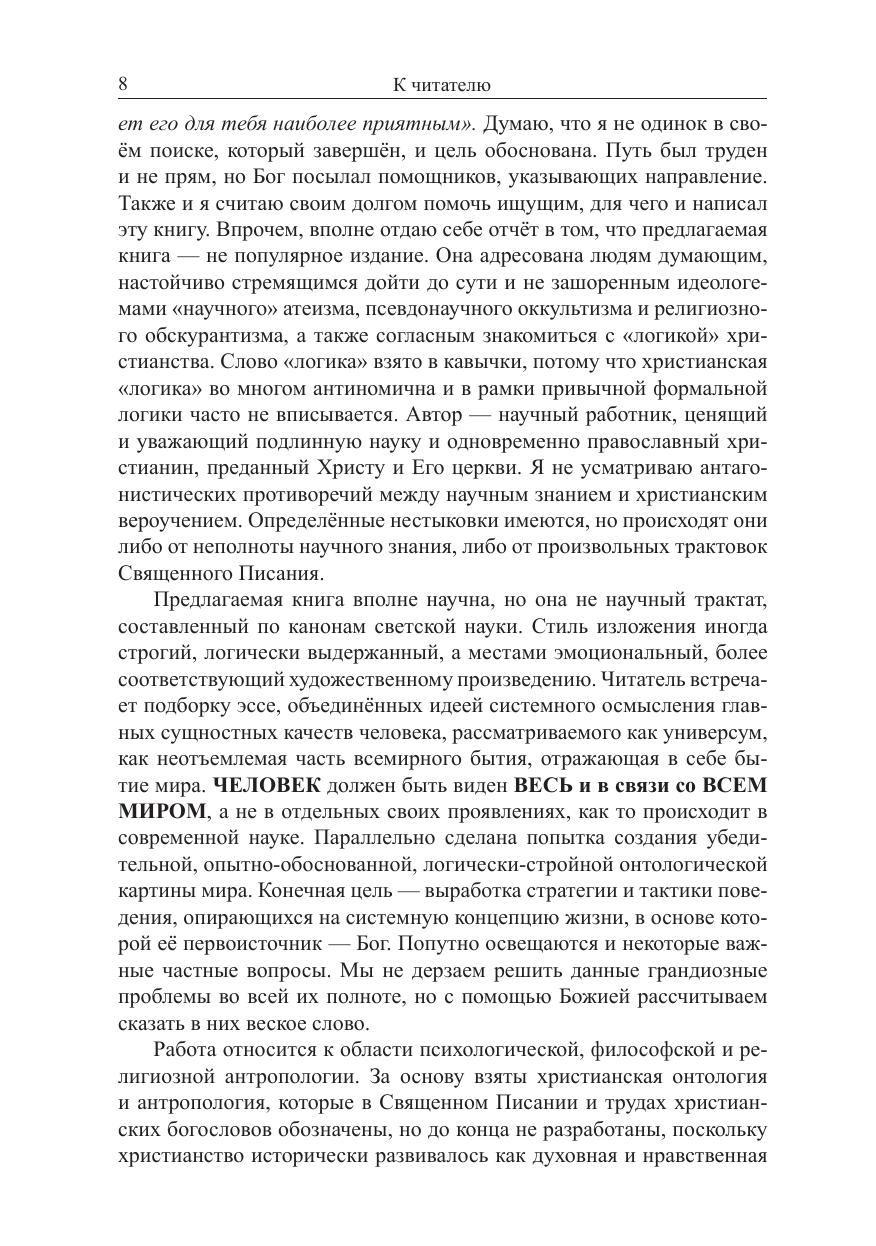 Книга посвящена проблемам психологической, философской и христианской религиозной антропологии. Представлена авторская концепция всемирного бытия и человека в нём, в контексте которой рассмотрены некоторые важные аспекты социальной и индивидуально-личностной жизни людей. Отдельные идеи заимствованы, иные — сугубо авторские, но все они интегрированы в единую мировоззренческую систему, опирающуюся на христианское вероучение. Прикладная сторона произведения — это ясно выраженная, целесообразная с точки зрения предложенной концепции, стратегия жизни человека. Книга не имеет аналогов. Она адресована людям думающим, тем, кто ищет смысл жизни и не приемлет бесцельного существования, кто стремится «познать самого себя» и понять окружающий мир. Книга может быть также интересна лицам, занимающимся вопросами психологии, философии и религиоведения.